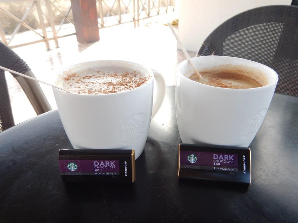 We hadden gisteren al een Starbucks gespot nabij ons hotel, dus we gaan na deze zeetour toch maar aan de Starbucks koffie, altijd lekker en veeeeel. Op 18 november as viert Oman haar National Day, de gehele stad wordt dan versierd met vlaggen en prachtige verlichting. Ook de Souq van Muscat wordt volledig aangepast. We zijn dan (helaas) het land alweer uit, want dit moet een prachtig fenomeen zijn. Kosten nog moeite worden gespaard voor deze dag. Erg bijzonder is dat alle verlichting wordt aangepast in de kleuren van de vlag: rood, groen en wit.