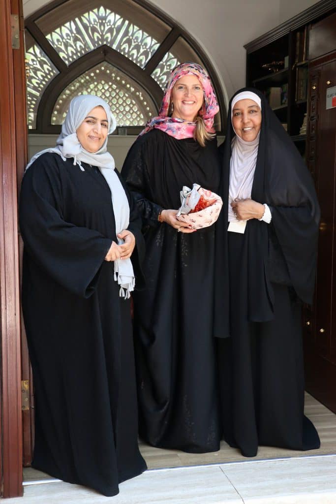 Uiteraard met alle respect voor ieders opvattingen! Een interessant gesprek als gevolg met zeker ook een vleugje humor, we hebben gelachen met deze dames. Ook hier worden grote vraagtekens gezet waarom het “geloof” in de wereld tot zoveel oorlogen leidt! Volgens de dames laat de Koraan en de Islam geen enkele leiding tot moorden en betreuren ook zei dat dit door sommige groeperingen wel zo wordt vertaald. Blijft een bijzonder en gelijktijdig ook lastig onderwerp “het geloof”. Het kent zo ook zijn voordelen want de mannen hier mogen met vier verschillende vrouwen gelijktijdig getrouwd zijn en hun tijd verdelen over verschillende gezinnen. De vrouwen moeten hiermee wel instemmen en als ze dat doen heeft de man “vrij spel”. “Wij zijn een bijzonder stel” en willen ook hun, met ons op de foto en we krijgen een gift mee in de vorm van een leuk schaaltje met dadels en enkele boekjes/folders (enkele in NL taal) over het Islam geloof. 11.00 uur gaat de moskee dicht en het is inmiddels bijna 12.00 uur geworden, dus snel terug naar de uitgang…….