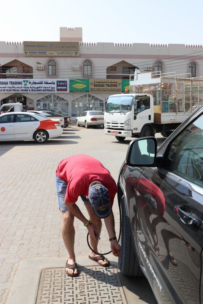 Aangezien de banden leeg gelaten waren op de heenweg, noodzakelijk voor beter grip in het zand, moet er uiteraard weer wat lucht bij om de roadtrip te vervolgen. Druk bij het tankstation…..