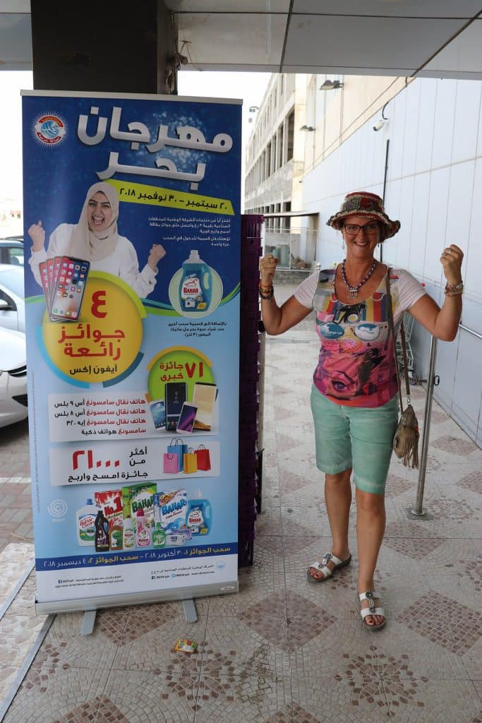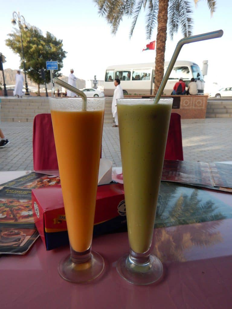 Aida (Duitse Cruise rederij) heeft vandaag een cruiseschip in de haven liggen, druk met toeristen dus in de straten van Muscat. En dus staan de straten vol met Omani om hun waren te verkopen en ook de toeristen bekijken zoals wij hun bekijken. Of deze cruise-gangers hetzelfde in Oman beleven als wij, is de grote vraag? Ook wij kijken onze ogen uit hoe sommige cruise-gangers zich gedragen, heerlijk om te zien. Onder het genot van een tweetal verse juices kunnen we alles mooi aanschouwen.