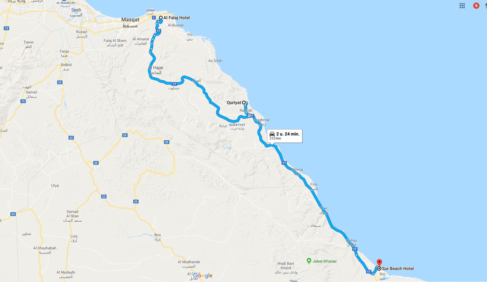 25 oktober: GOEDEMORGEN Muscat om 06.30 uur, vakantie dus uitslapen! Vandaag gaan we deze prachtige stad verlaten en reizen we door naar Sur. Ritje van zo’n 250 km voor de boeg, mag natuurlijk geen probleem zijn. Het wegennet is hier goed en we mogen door dit schitterend land rijden, daarbij hebben we natuurlijk al wel eens ergens in de wereld rond gereden dus we zijn wel wat gewend. Het is wederom een prachtige en warme dag! 36 graden en volop zon maar dat is hier niet zo gek, het regent hier immers maar zo’n vijf a zes dagen per jaar! Kun je eigenlijk niks bij voorstellen. Ons koffertjes worden netjes naar de auto gebracht, voor ons niet noodzakelijk maar ze zijn hier erg gedienstig (te?). We verlaten Muscat en zien direct wat het leven in een woestijn voorstelt. Gave beelden en tuinieren hoeven ze hier niet!