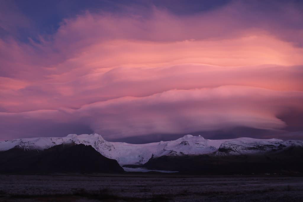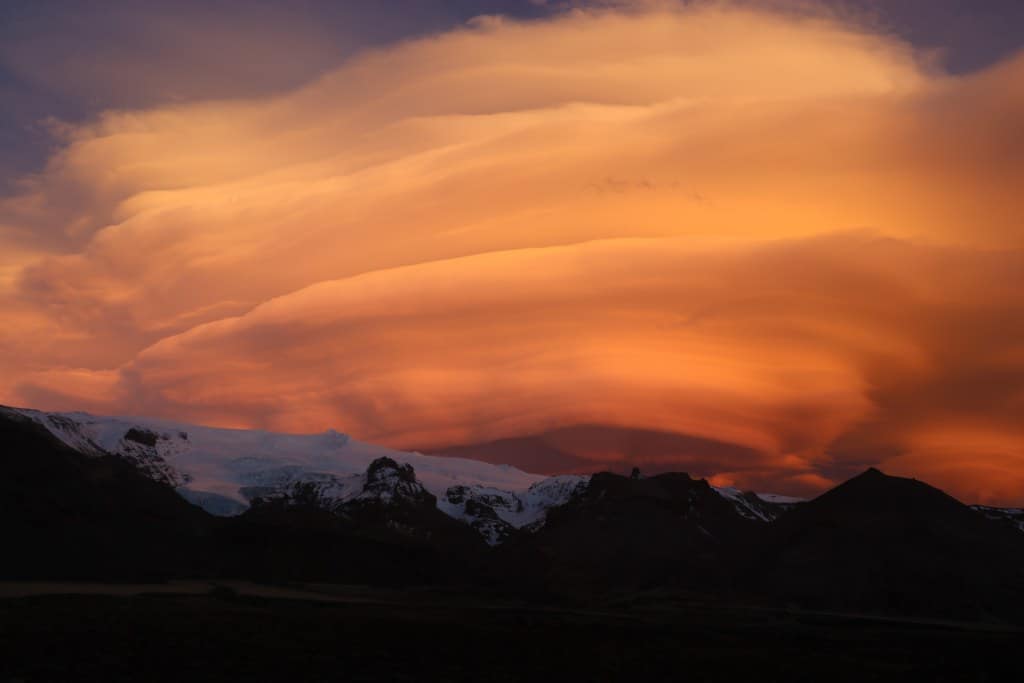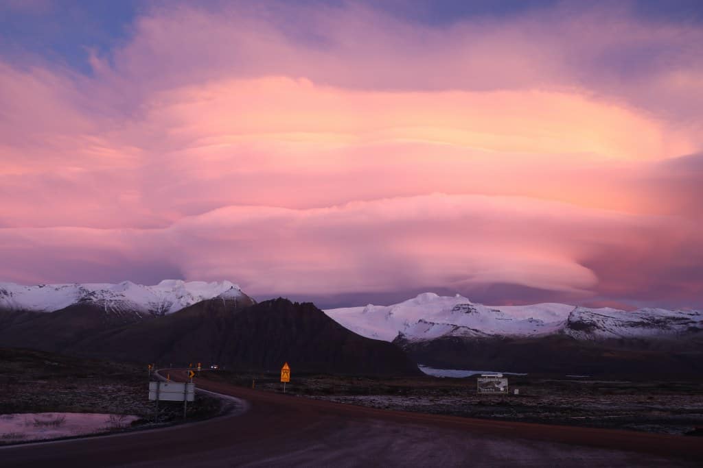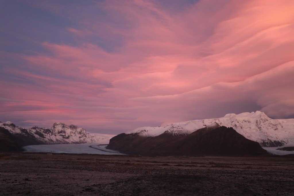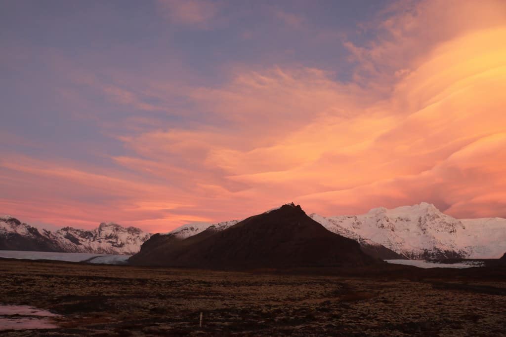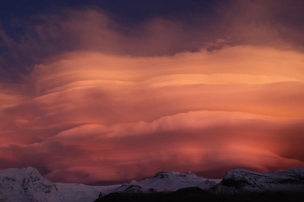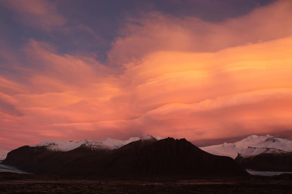Aangezien we zo’n 115 km van “huis” en het inmiddels 15.00 uur is geweest, tijd om de terugweg in te zetten. De zonsondergang duurt in deze tijd van het jaar een klein uur! We kunnen dus genieten van prachtige kleuren, echter de wind en de koudestraling van de Vatnajokul zorgt voor een wolkenspektakel wat we nooit eerder zagen. Mega bijzonder! Zelfs onze foto’s schieten te kort, echt ongelooflijk gaaf!