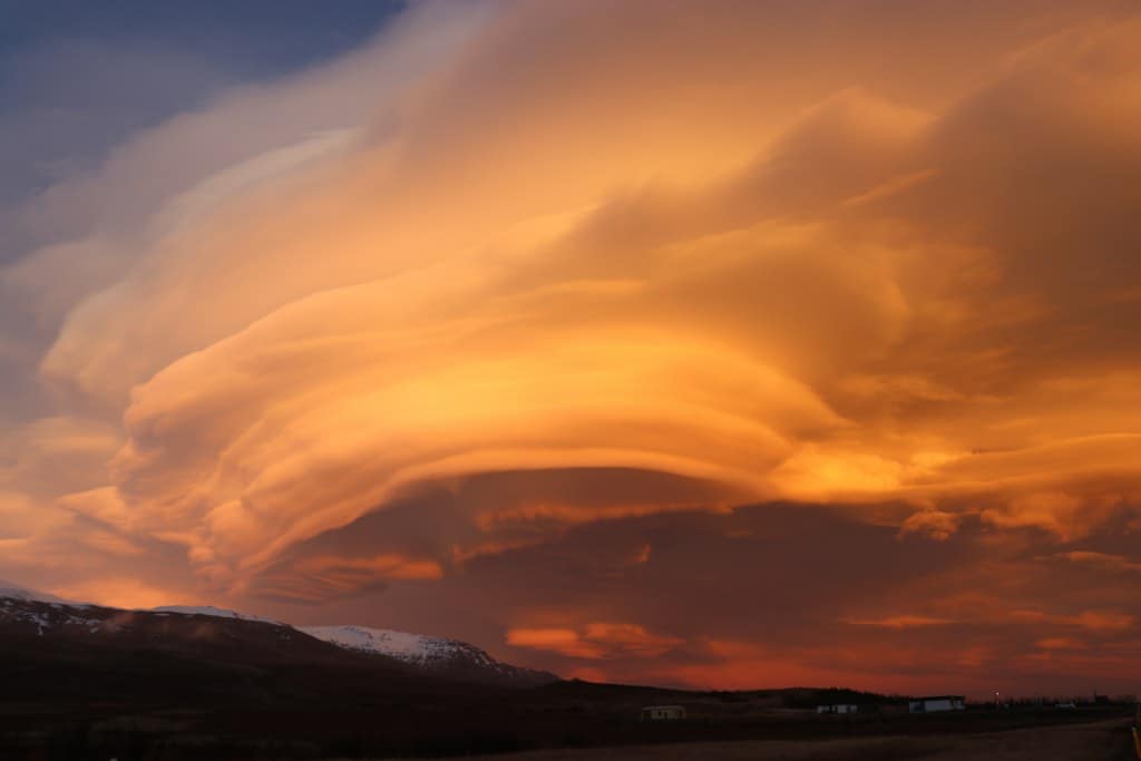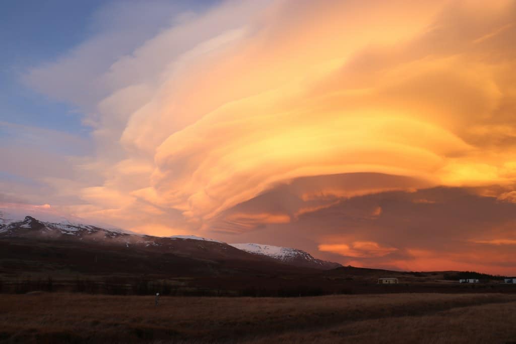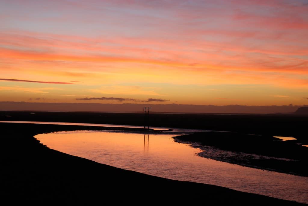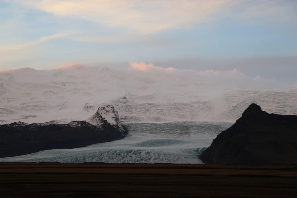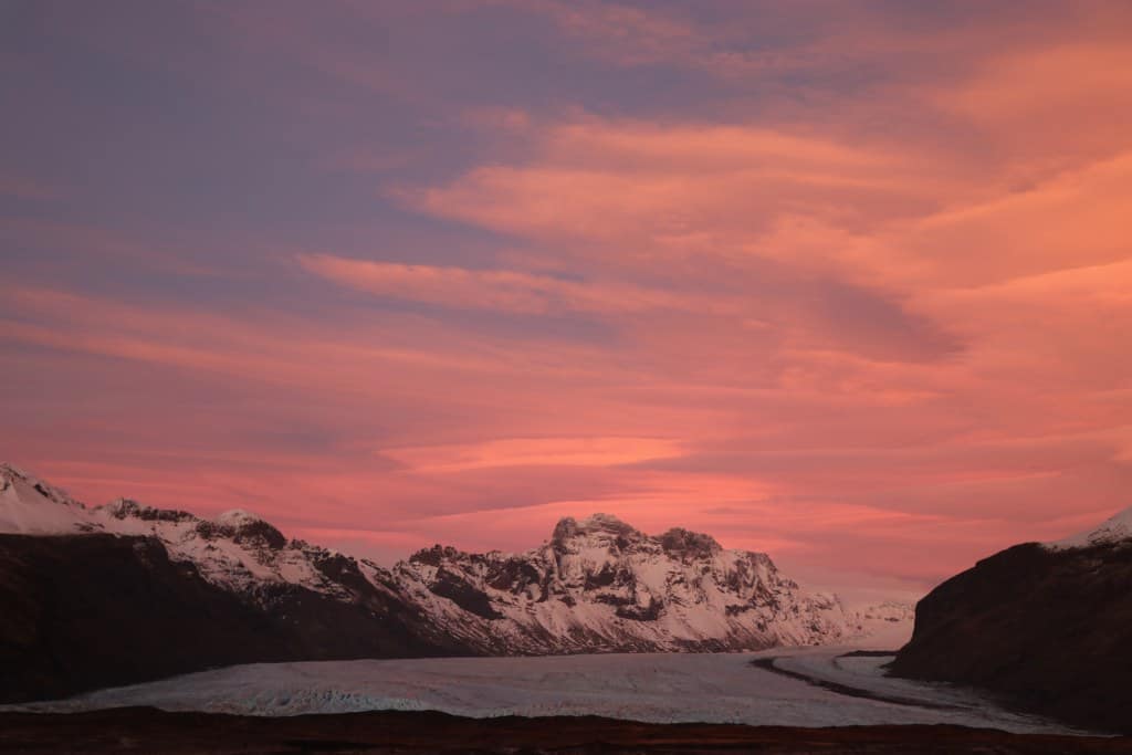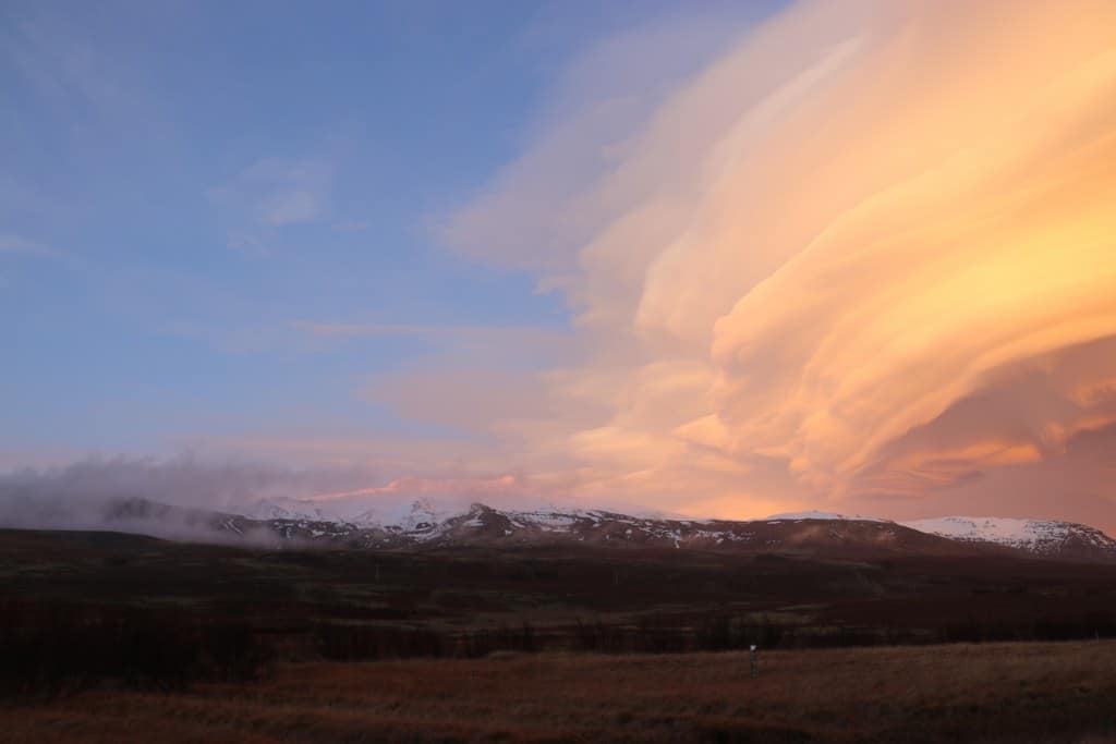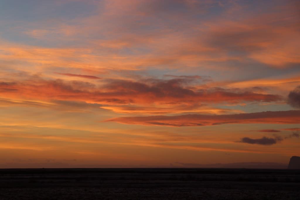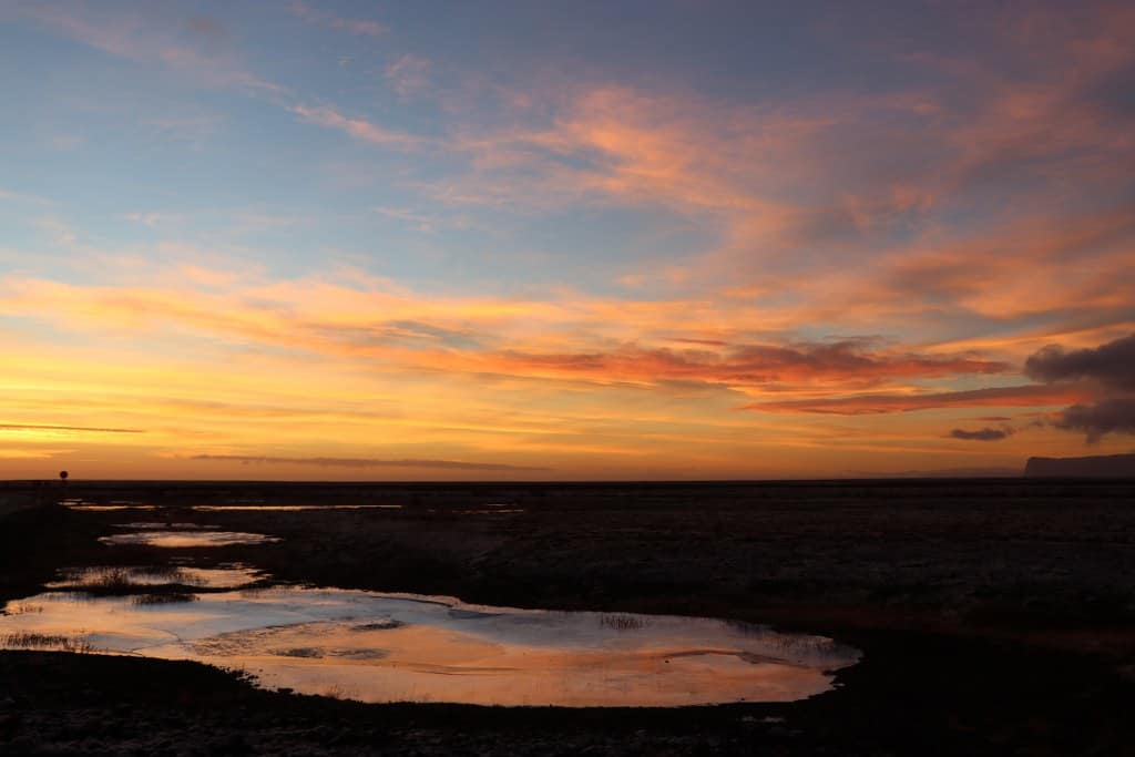 Aangezien we zo’n 115 km van “huis” en het inmiddels 15.00 uur is geweest, tijd om de terugweg in te zetten. De zonsondergang duurt in deze tijd van het jaar een klein uur! We kunnen dus genieten van prachtige kleuren, echter de wind en de koudestraling van de Vatnajokul zorgt voor een wolkenspektakel wat we nooit eerder zagen. Mega bijzonder! Zelfs onze foto’s schieten te kort, echt ongelooflijk gaaf!