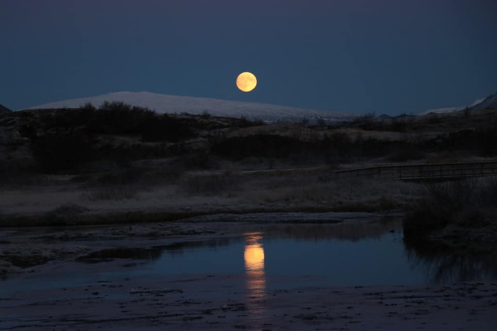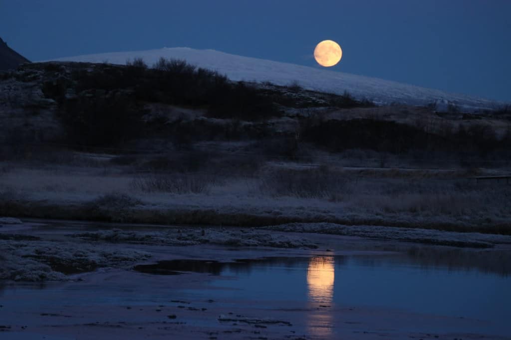 Rond 16.30 uur zie je aan de ene kant van het park de maan verschijnen boven de sneeuwvlaktes en aan de andere kant de laatste gloed van de zon. GEWELDIG!