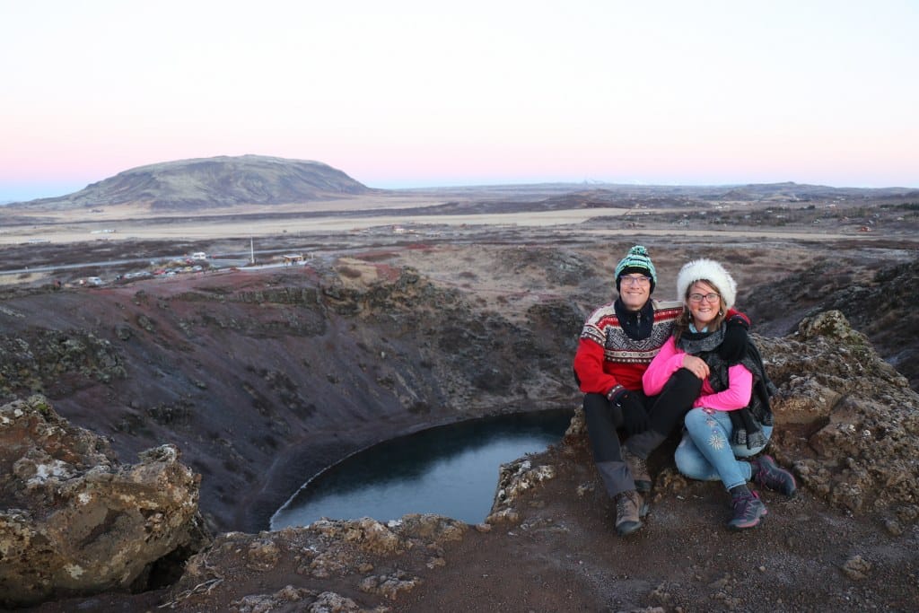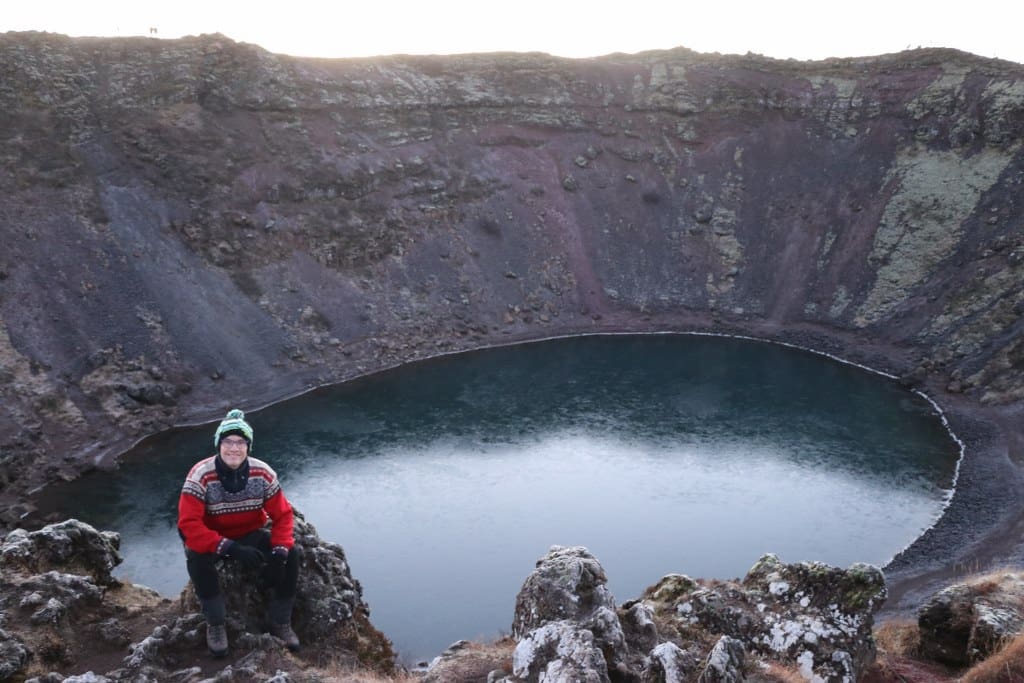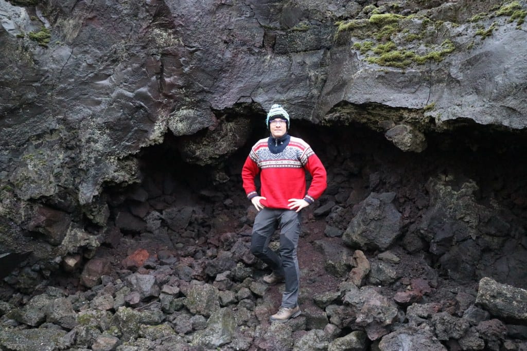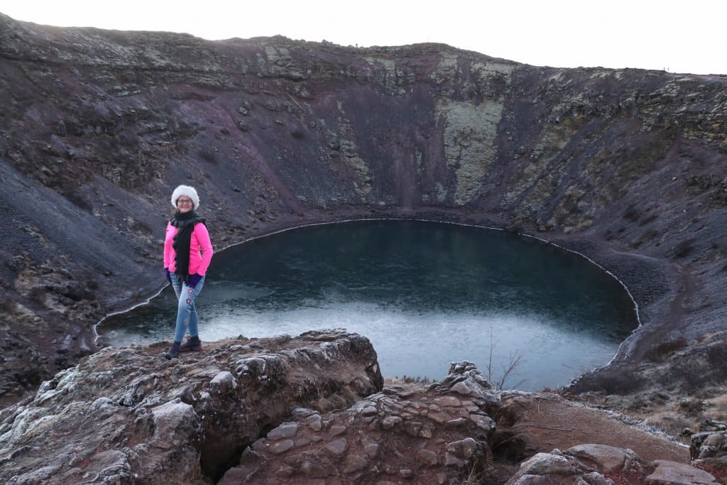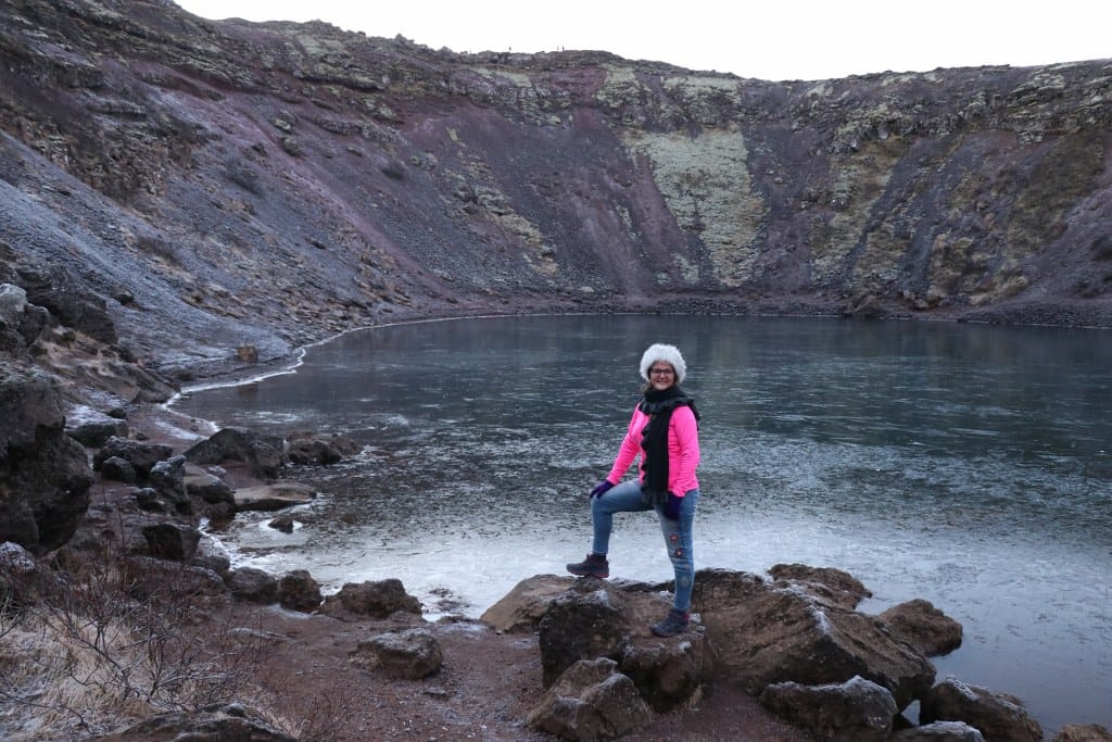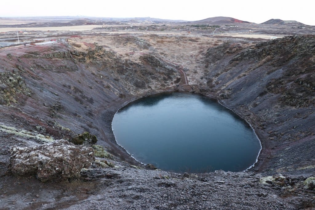 Rond 10.30 uur zijn we weg, onze eerste stop is Kerid. Overigens maar een 10 minuutjes rijden van ons verblijf, gisteren avond al langs gekomen maar toen was het donker. IJsland is toeristischer aan het worden want je mag hier heden ten dage voortaan 400 ISK aftikken om deze krater te bezoeken. Kennelijk is de krater in particuliere handen en dus wordt er gebruik gemaakt van de toeristen. Stond ik in het verleden hier nog eens alleen op de rand, is het nu een komen aan gaan van bussen en busjes, denk veelal afkomstig uit Reykjavik. Niks mis mee natuurlijk om dit bijzondere IJsland te bezoeken, feit is wel dat het een veelvoud aan toeristen zijn tov jaren terug. Kerid is een krater die zo’n 6.500 jaar geleden is ontstaan. 170 meter lang, zo’n 140 breed en 55 meter diep. Nu bevroren maar het is niet raadzaam het ijs te betreden, doen we dus ook niet. Waar vulkanen zijn is Lava…… Gelukkig droog en afgekoelde lava!