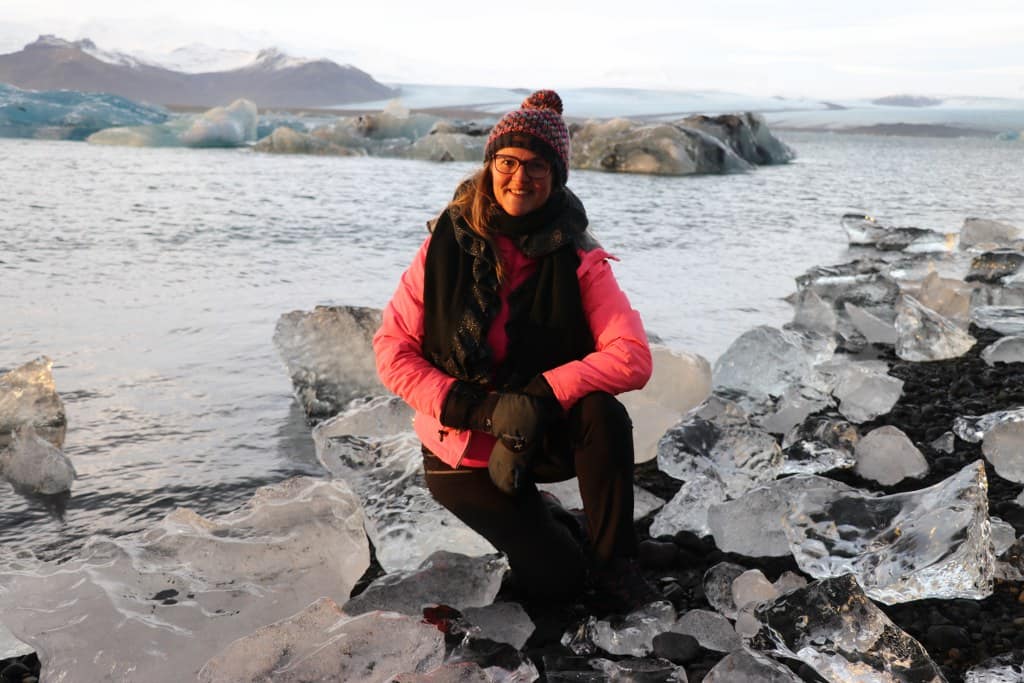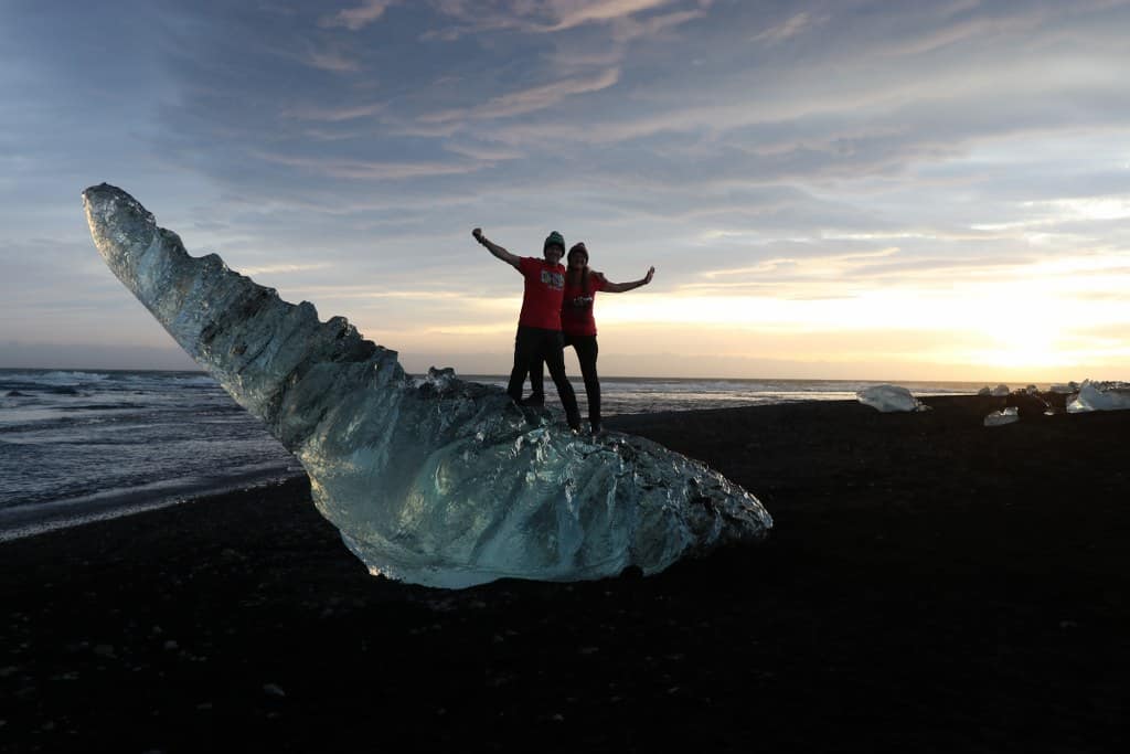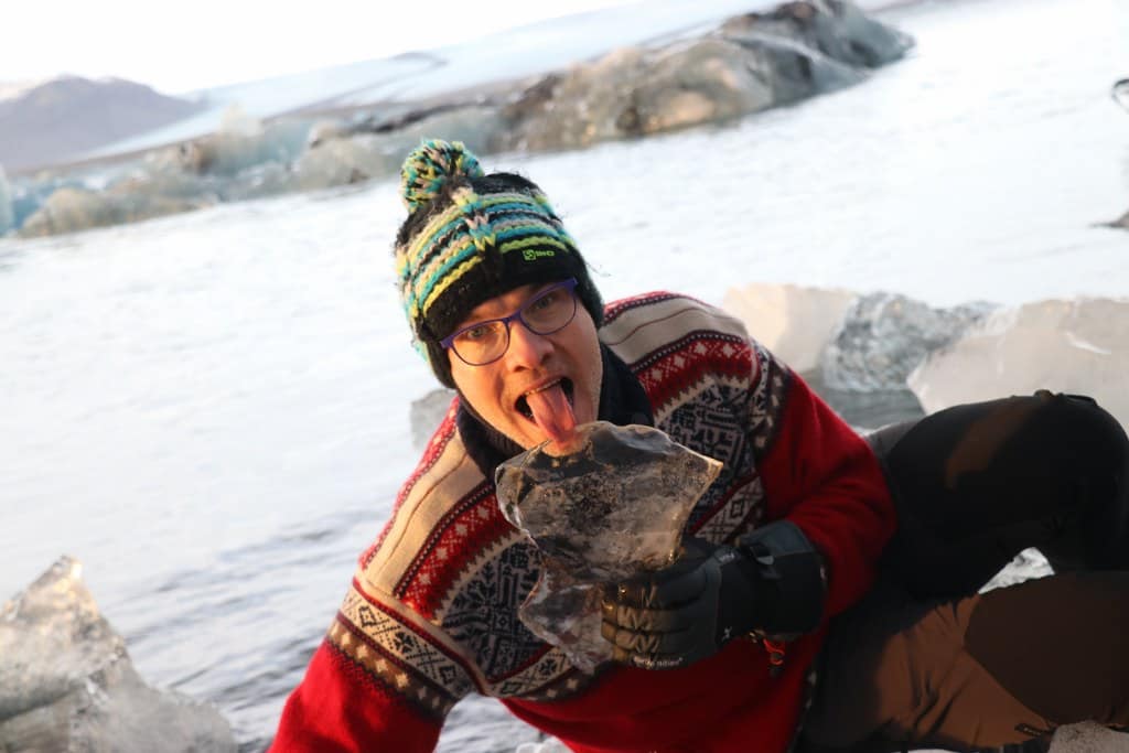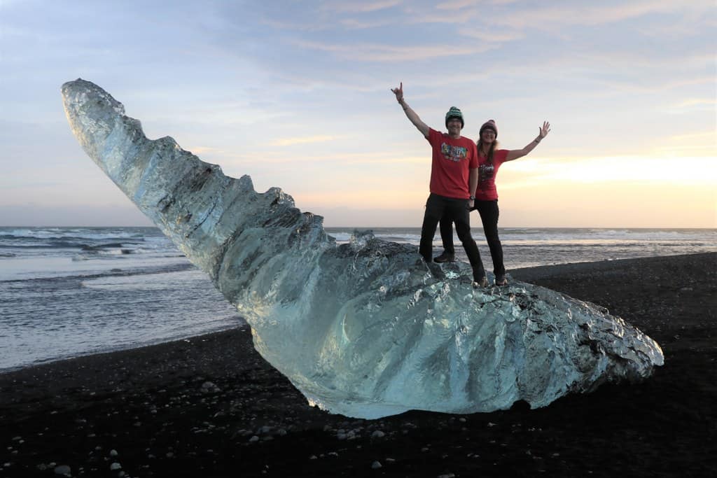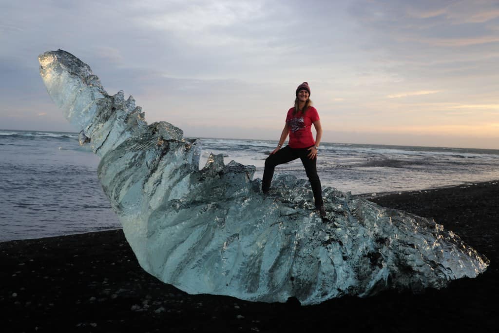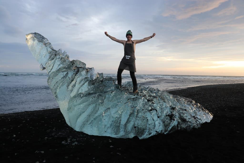 Vanuit de lagoon stromen de ijsbergen- en blokken richting de zee, die daar weer het strand op opspoelen. Erg gaaf en bijzonder! Aangezien Lotte, dit jaar in de van Empel Inspecties en Advisering kerstpakken, een kookschort had gedaan had ik iedereen uitgedaagd om een bijzondere foto te maken met de schort aan. Hier is die van mij! Muts op, tshirtje en hop de ijsblok op! Met onze zomerse kledingstijl hebben we bekijks en staan we op menig camera!