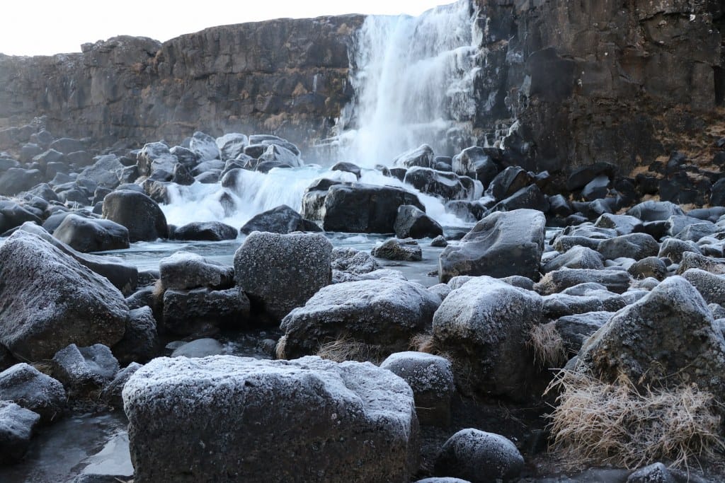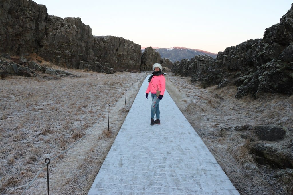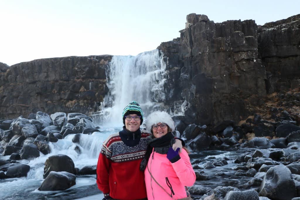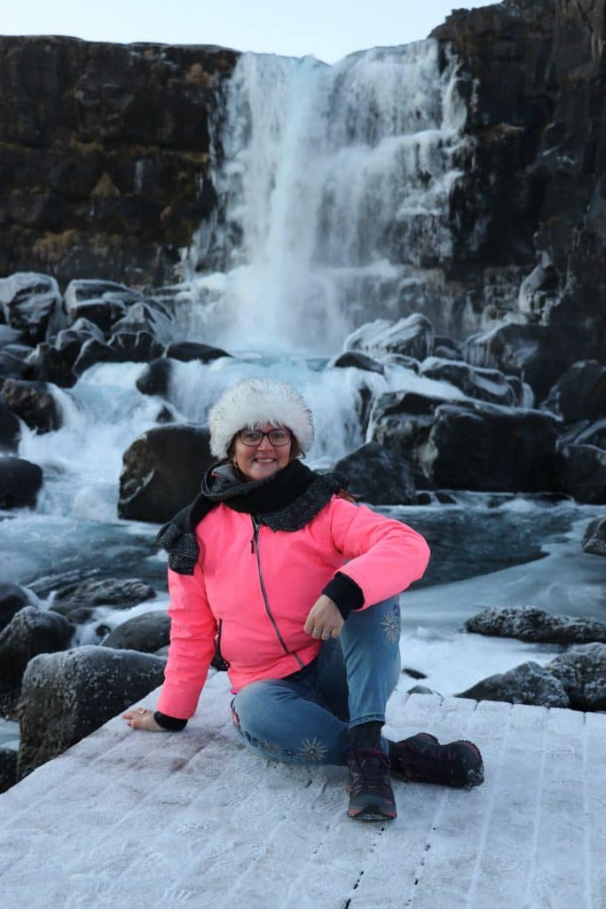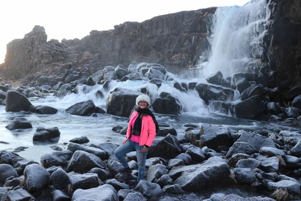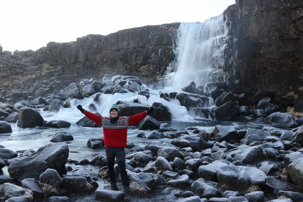 Op naar Thingvellir National Park! Kan nog net voordat we de zon zien verdwijnen, want die is immers rond 15.30 uur vertrokken in deze tijd van het jaar. In dit park tref je ook de prachtige Oxararfoss aan, misschien niet de meest bijzondere waterval maar met alles in het ijs wordt het toch echt wel een beauty! Thingvellir ligt op de Mid-Atlantische rug waar de Euroziatische- en Noord-Amerikaanse plaat langzaam uit elkaar schuiven. Elk jaar wordt deze breuk, waartussen Jolande staat, zo’n 2 cm groter!