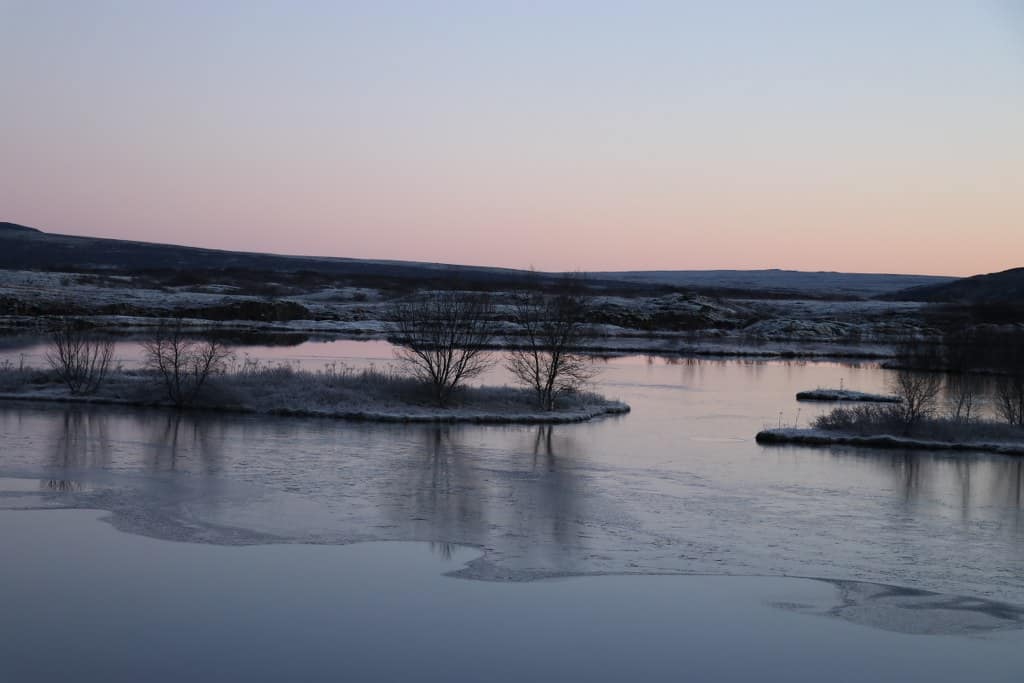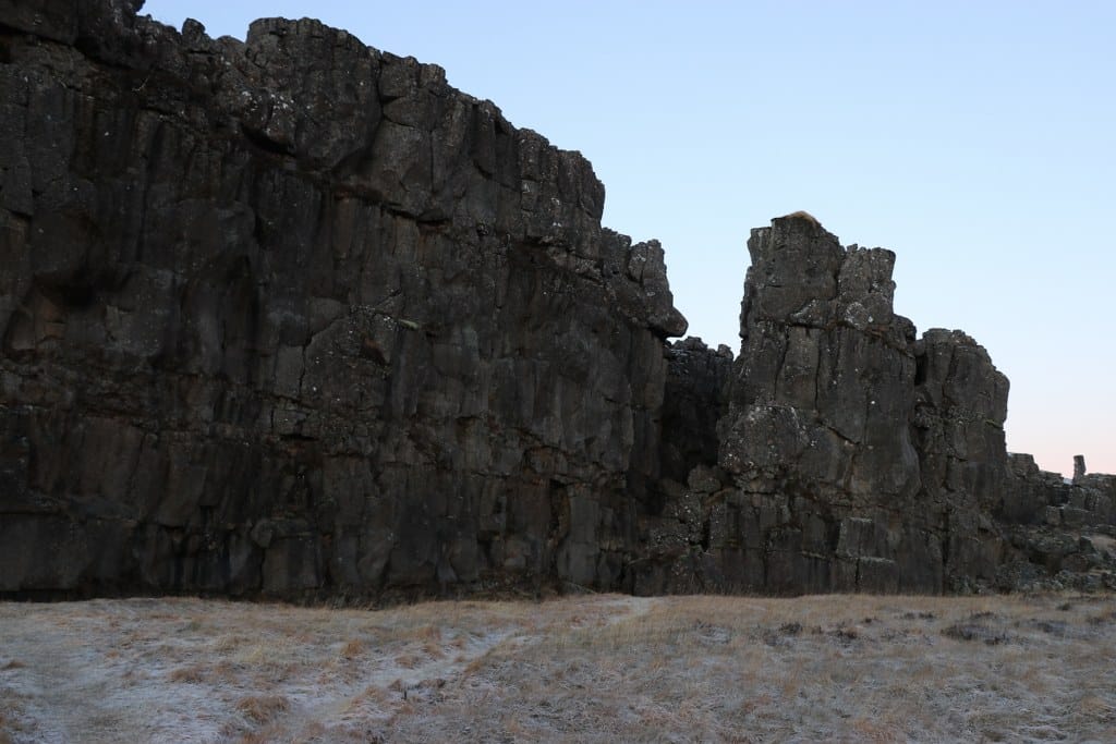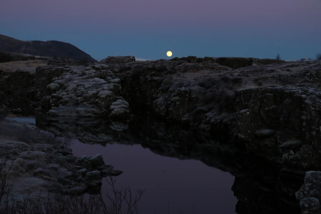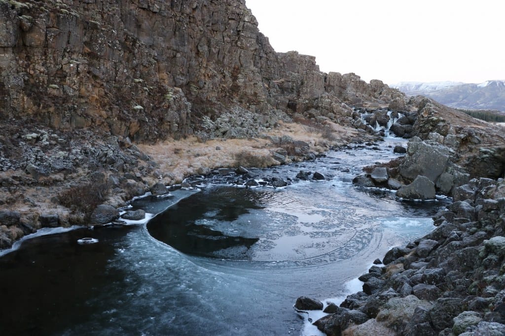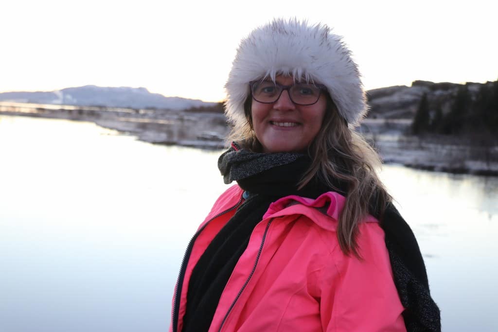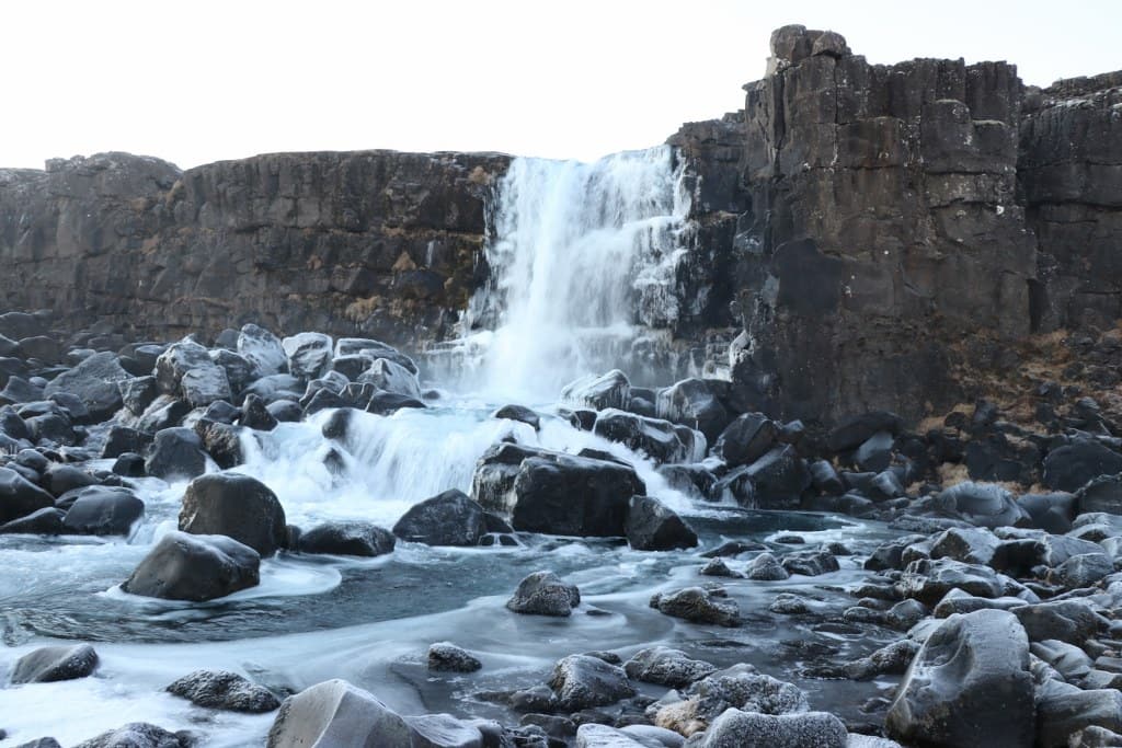 Op naar Thingvellir National Park! Kan nog net voordat we de zon zien verdwijnen, want die is immers rond 15.30 uur vertrokken in deze tijd van het jaar. In dit park tref je ook de prachtige Oxararfoss aan, misschien niet de meest bijzondere waterval maar met alles in het ijs wordt het toch echt wel een beauty! Thingvellir ligt op de Mid-Atlantische rug waar de Euroziatische- en Noord-Amerikaanse plaat langzaam uit elkaar schuiven. Elk jaar wordt deze breuk, waartussen Jolande staat, zo’n 2 cm groter!