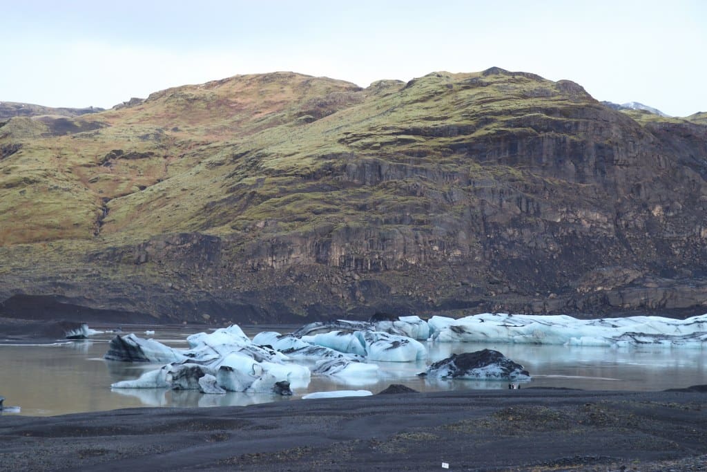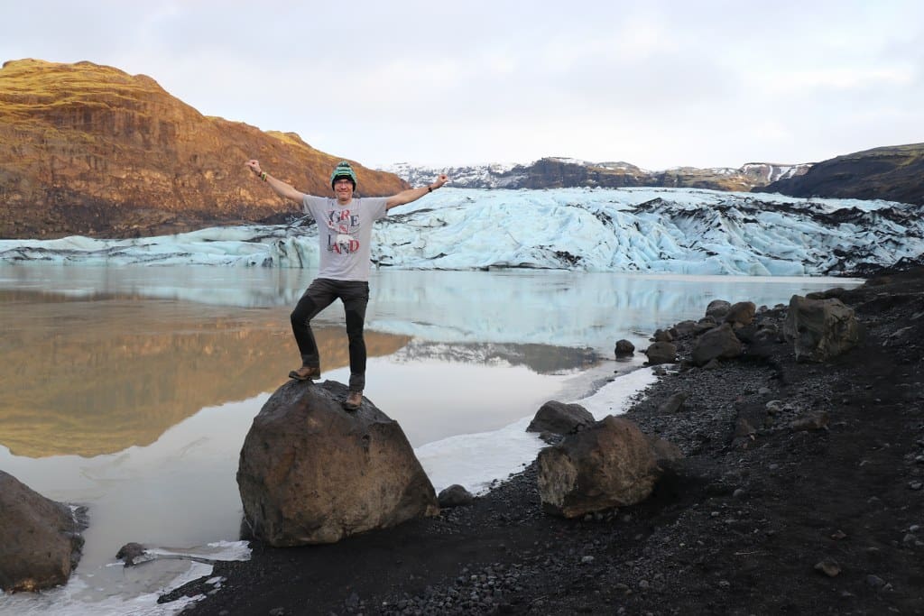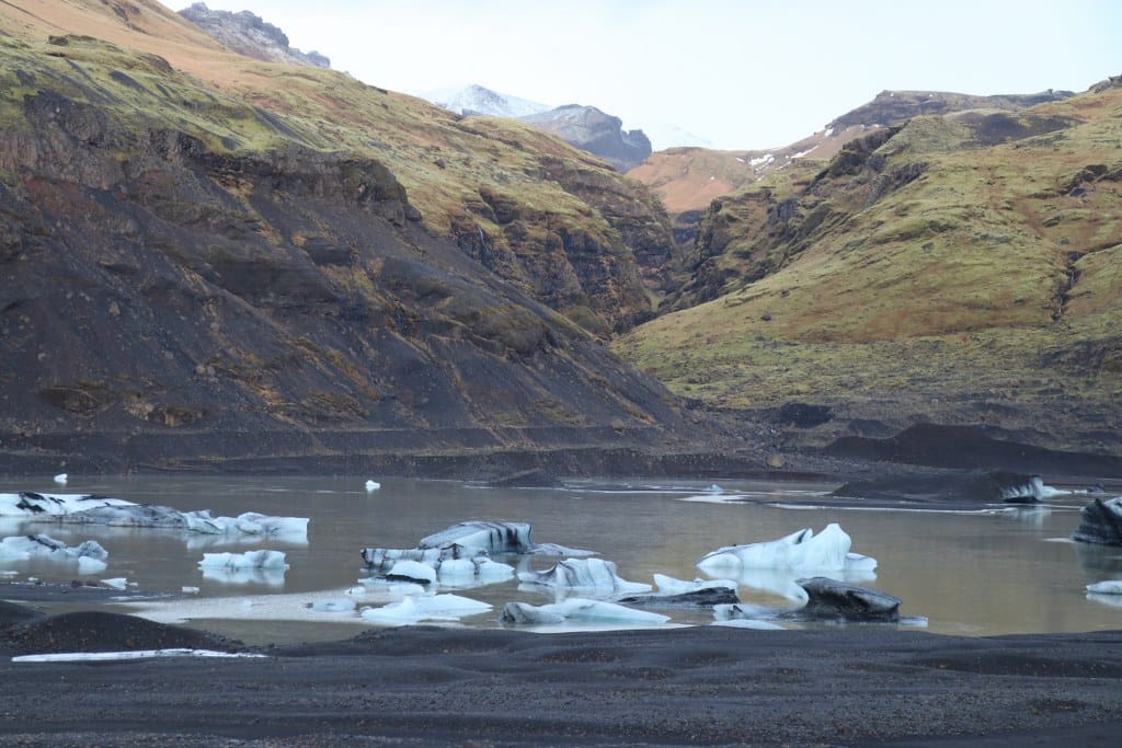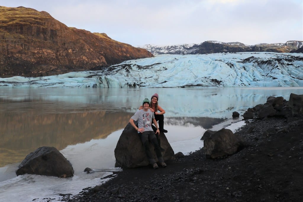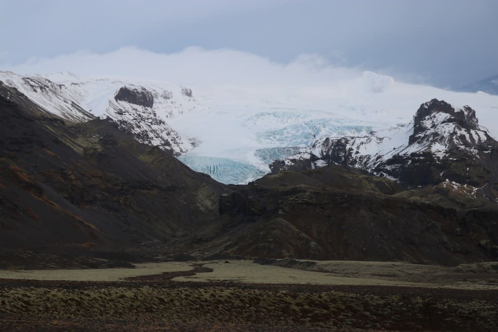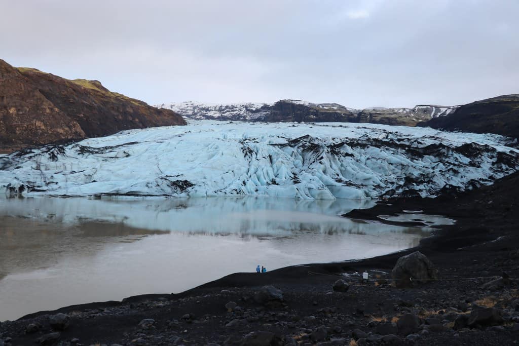 Next stop: Solheimajokull. Bij deze gletsjer kun je anno 2018 redelijk dichtbij parkeren en is dus goed bereikbaar. De bewolking trekt open terwijl wij aanrijden, lucky we. We zien de gletsjer helder en duidelijk liggen. De zwarte gedeeltes zijn van de laatste vulkaan uitbarsting op IJsland, toen het gehele vliegverkeer ontregelt was. Yep, moeder de natuur houd je (gelukkig) niet tegen!