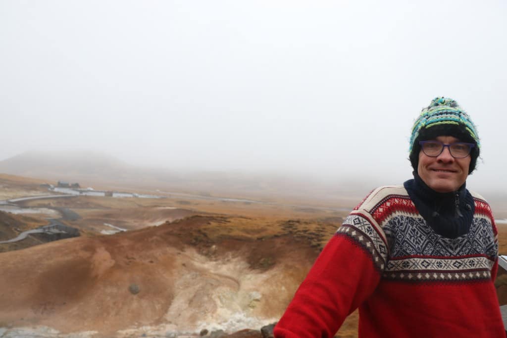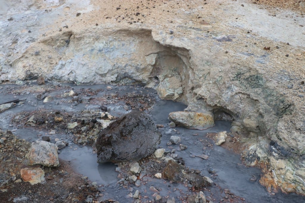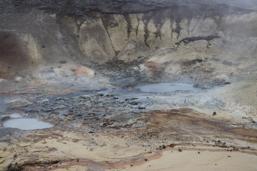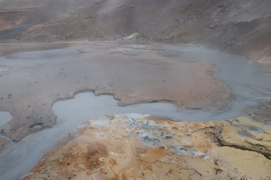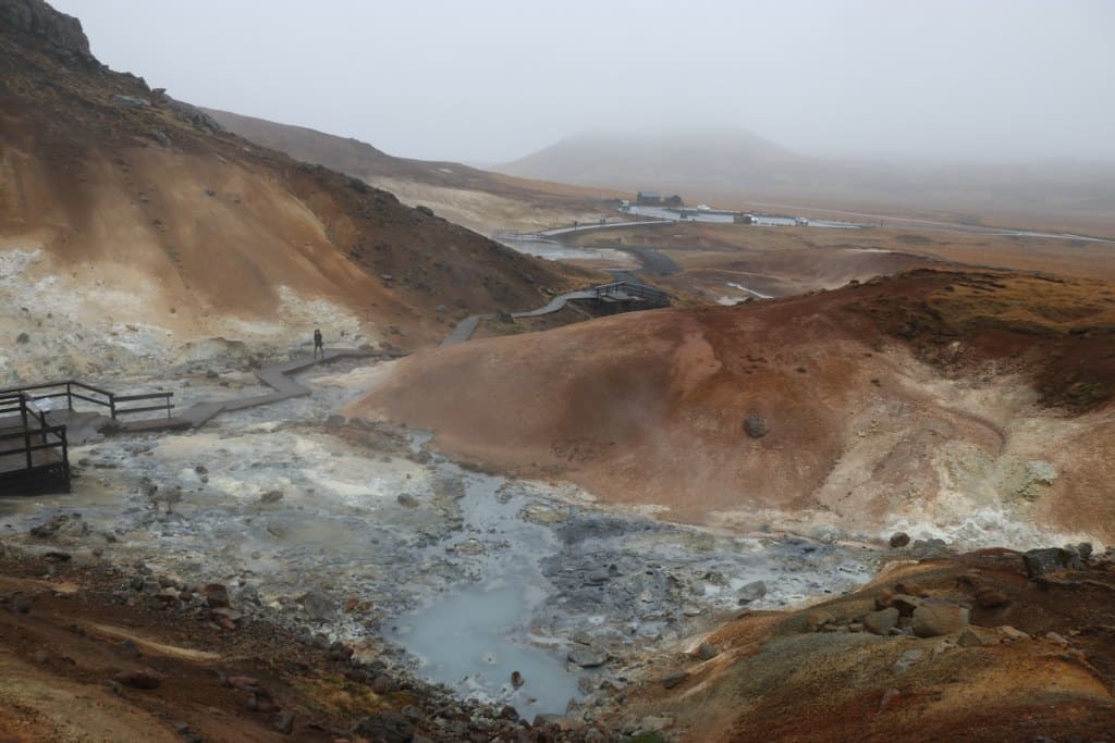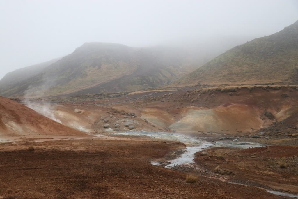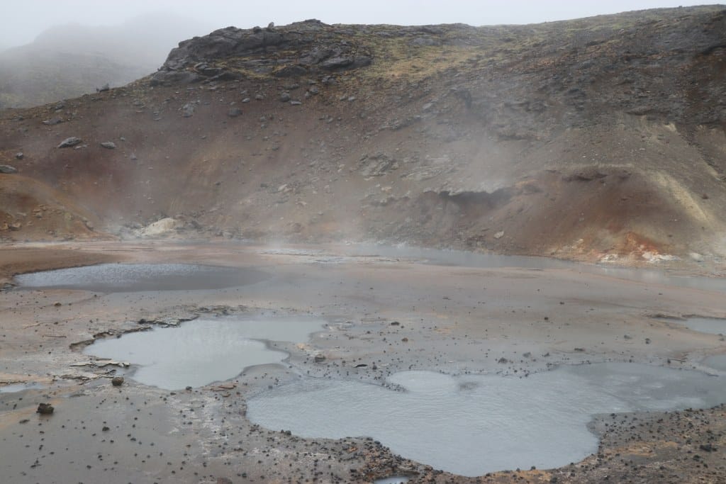 We maken nog een stop bij de Geothermische velden in Krysuvik. Niet zo groot maar zeker een stop waard, al is het maar om het laatste beetje zwavel te snuiven. Keiharde wind en regen maakt dat we toch redelijk snel weer de auto in schieten.