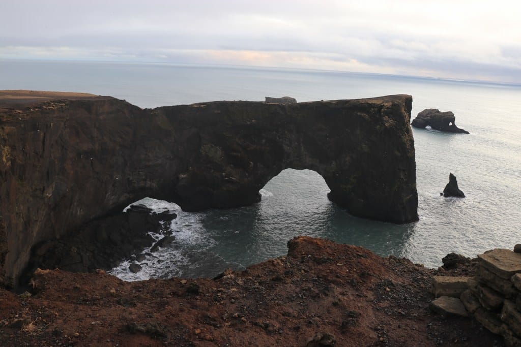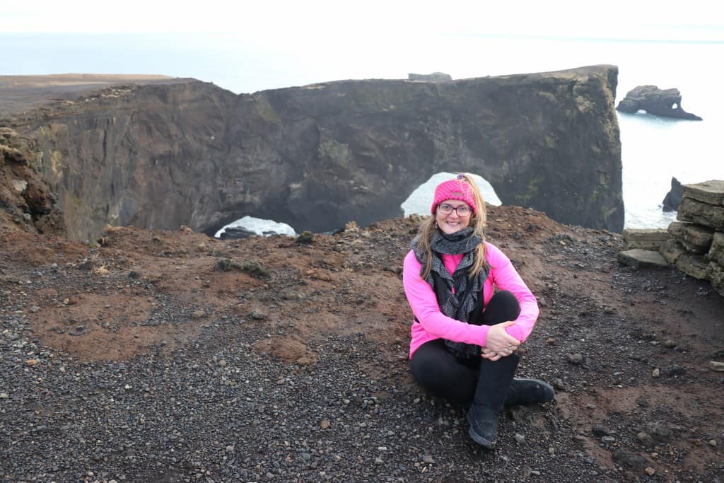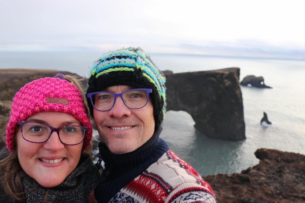 Heerlijk! Bij de auto aangekomen het truitje weer aan en mogen we weer opwarmen! Genieten van de kou! We rijden verder richting Vik. Net voor Vik kunnen we omhoog rijden om Dyrholaey van dichtbij te bewonderen. Een 37 meter hoge rotsformatie met een gat er in, ook hier geldt: Moeder natuur want ben je prachtig!