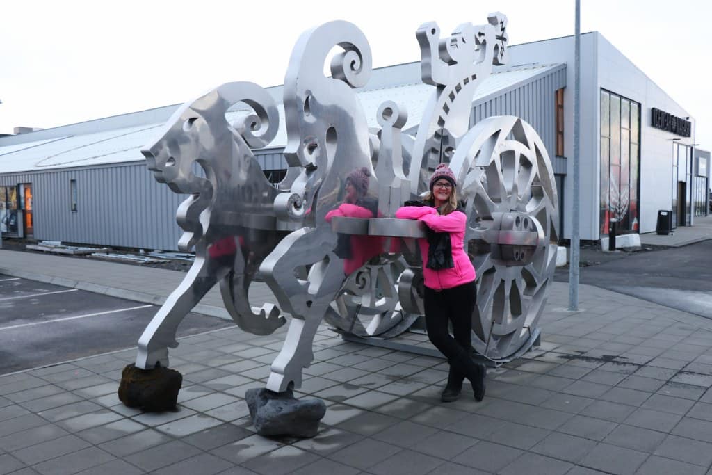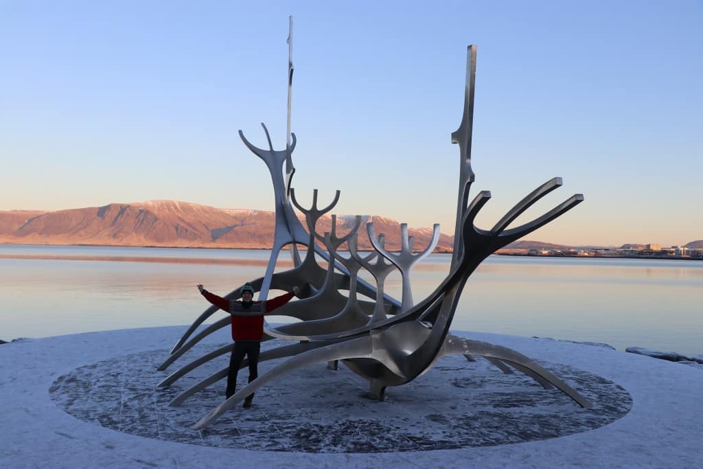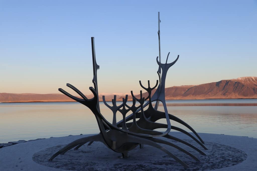 Reykjavik is de meest noordelijk gelegen hoofdstad van de wereld. Met zo’n 150.000 inwoners niet eens zo’n hele grote stad, maar woont wel bijna de helft van de gehele IJslandse bevolking in Reykjavik. Hoezo dun bevolkt! IJsland is met 103.000 km2 oppervlakte ongeveer 2,5 keer zo groot als Nederland. en kent zo’n 350.000 inwoners! Rond 14.00 uur arriveren we bij het wereldberoemde vikingschip “The Sun Voyager”. Fotostopje, ofcourse……..