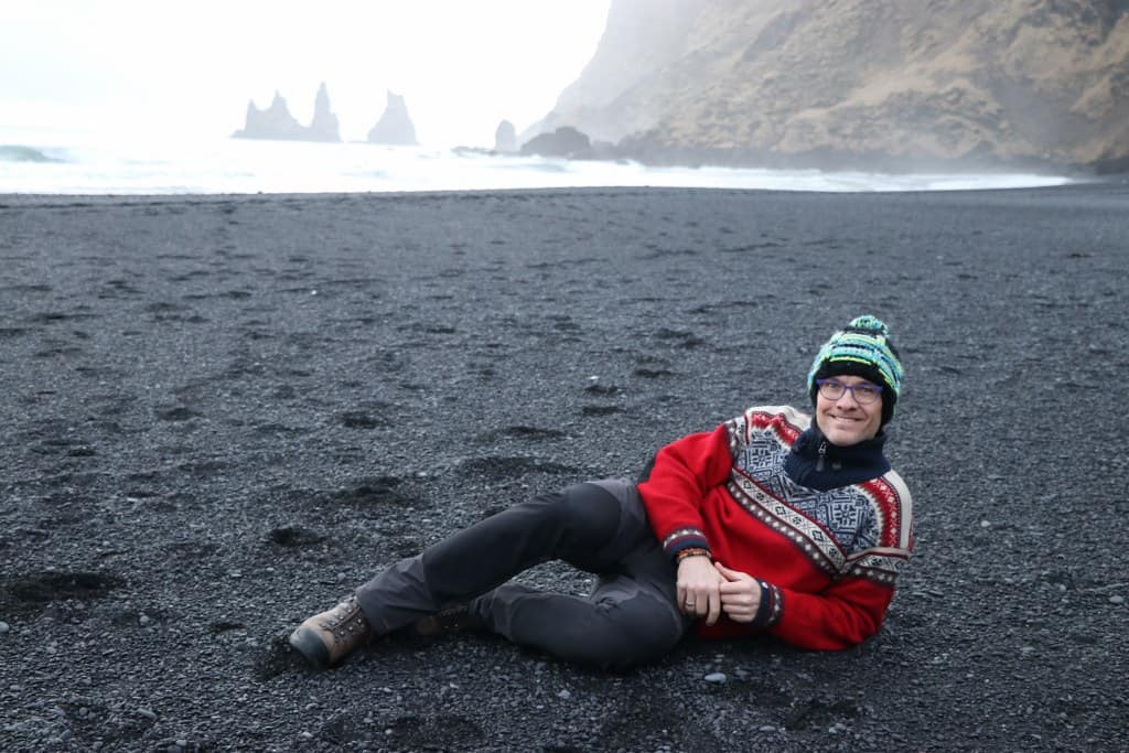 Zon, zee en (zwart/lava) strand….. Mag ik ook eens op het strand liggen! Rust aan het strand van Vik!