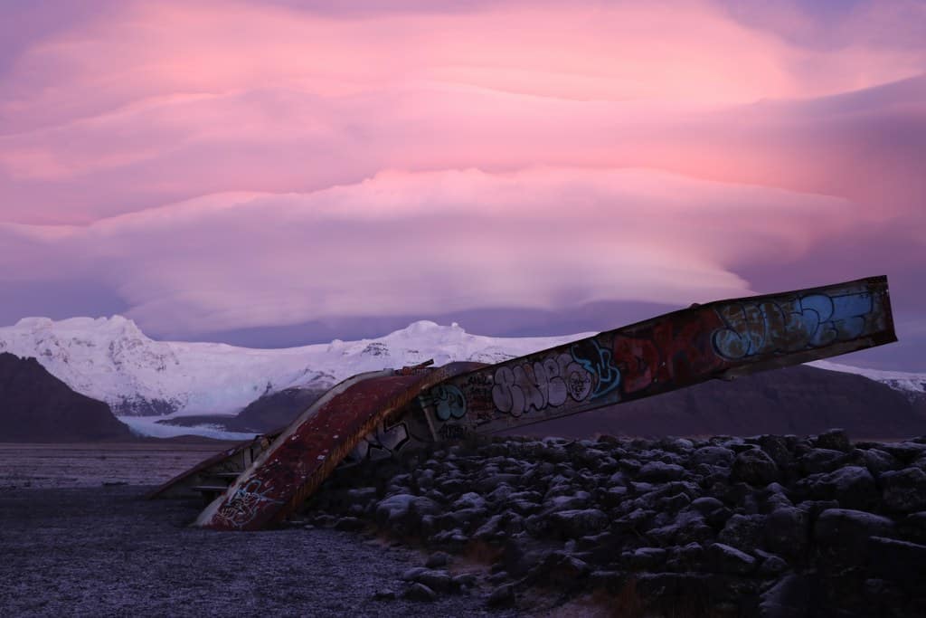 In 1973 stortte een Amerikaanse DC-3 neer op het zwarte zandstrand van Solheimasandur, vlakbij het plaatsje Vik. Alle bemanningsleden overleefden de crash. De exacte reden van de crash is niet bekend, hoewel sommige bronnen suggereren dat het vliegtuig zonder brandstof kwam te zitten nadat de piloot overschakelde naar de verkeerde brandstoftank. De wrakstukken zijn nog steeds te bezichtigingen, vlakbij zee. De vleugels en het staartstuk zijn inmiddels verdwenen, onbekend waar die zijn gebleven. Er gaan geruchten dat een boer de verdwenen stukken heeft meegenomen. We hadden dit wrak graag bezocht maar de wandeling naar het wrak is 7 km (op en neer), zeker de moeite waard maar voor vandaag niet haalbaar vanwege ons programma. Wellicht een volgende keer…….