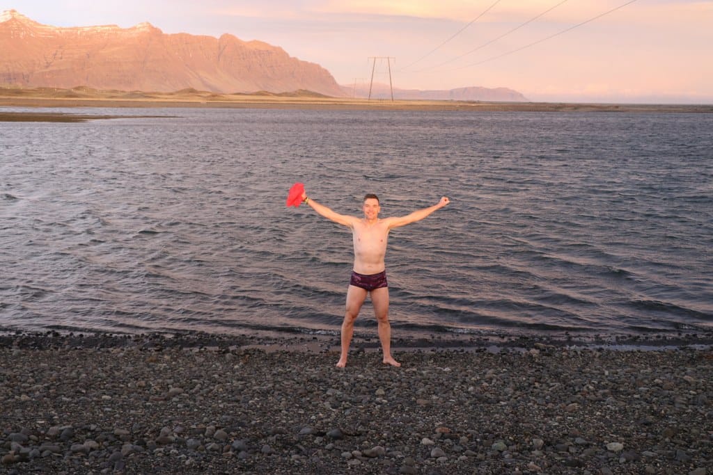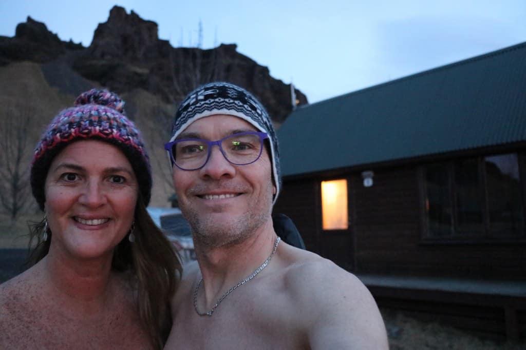 24 december: Goedemorgen Horgsland/IJsland. Eerst even een wandelingetje van zo’n 20 minuten in het zwembroekje en bikini. Heerlijk #koudetraining op deze ochtend. Vandaag gaan we rijden richting Vatnajokull. Dit is IJsland’s grootste gletsjer en Europa’s grootste gletsjer op de Austfonna van Spitsbergen na. Met een oppervlakte van 8100 km2 en op diverse plaatsen 1.000 meter dik bedekt deze ijskap meer dan 8% van heel IJsland. #Koudetraining, oftewel wandeling in zwemkleding! Ons verblijf Horgsland, prima uitvalbasis om Vatnajokull National Park te bezoeken!