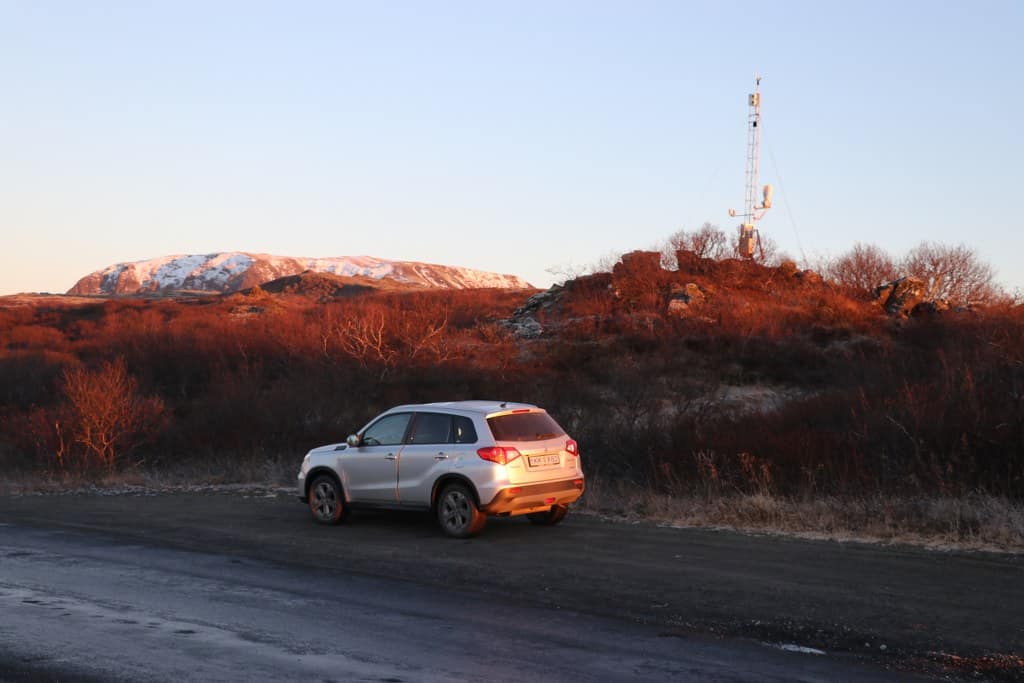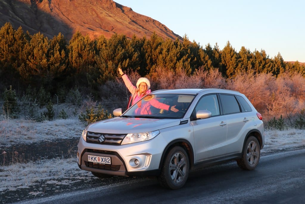 Omstreeks 15.15 uur (lokale tijd, het is hier een uur vroeger dan in NL). We halen onze auto op bij EuropCar, Suzuki 4×4, maar eerst de raampjes krabben want het vriest hier.