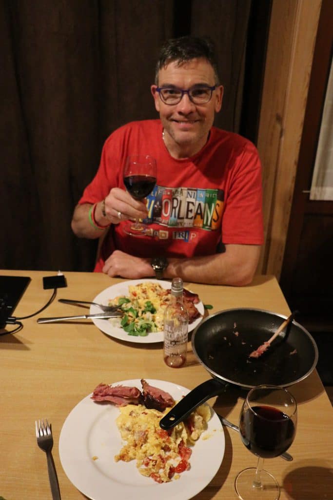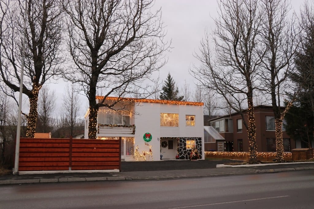 Rond 16.30 uur zijn we terug bij ons verblijf. Tijd voor opwarming, koffie/thee een drankje en kerstavond in IJsland. Rond 20.30 uur dinertime! Geen uit eten maar “Kerstomelet” uit eigen keuken, hoppa! Overigens met een lekkere salade en kippebout er bij. Uit “eigen” keuken! Wa wulde nog mir? Gezellig in IJsland! Nog een afzakkertje en dan is de koelkast, wijn, bier e.d. goed opgegaan. Truste vanuit het prachtige Horgsland, morgenvroeg reizen we weer terug naar Keflavik.
