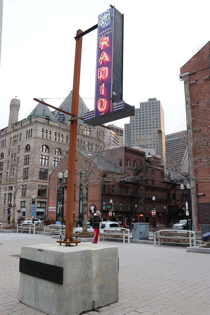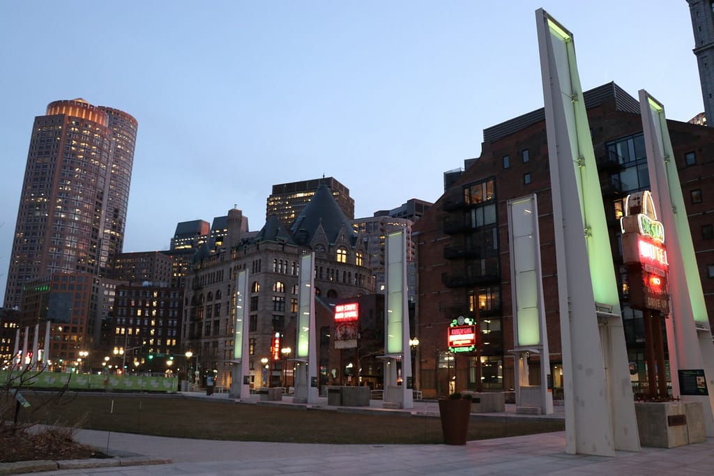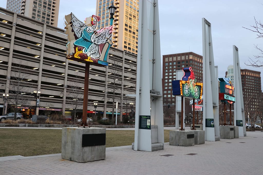 We lopen nog een stukje van “The Greenway” in het centrum van Boston, een groenstrook van zo’n 1,5 mijl (= 2,4 km) midden in het centrum. Hier hangen allemaal oude uithangborden die vroeger waren geplaatst bij restaurants, tankstations e.d. Antiek midden in een relatief modern ogend centrum! De wat oudere gebouwen zijn allemaal gerestaureerd en ogen daarmee weer “van deze tijd”. Een leuke wandeling langs the Rose Kennedy reenway of Boston!