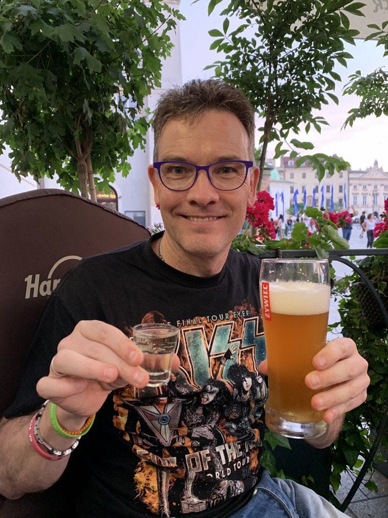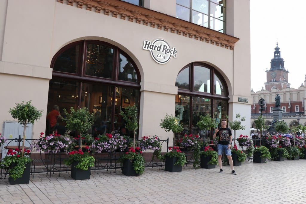 Midden in het centrum van Krakau, aan het Main Market Square, bevindt zich het Hard Rock Cafe van Krakau. Een bezoekje, dit keer in combinatie met ons avondeten, mag zeker niet ontbreken. Qua locatie kun je niet beter zitten, mooi uitzicht over het plein waar van alles te zien en te doen is. Als het weer goed is, is het terras de beste plaats. Natuurlijk doen we, in Poolse traditie, een Vodka shot bij ons drankje, proost op dit Krakau uitstapje.