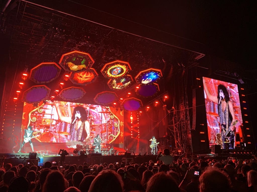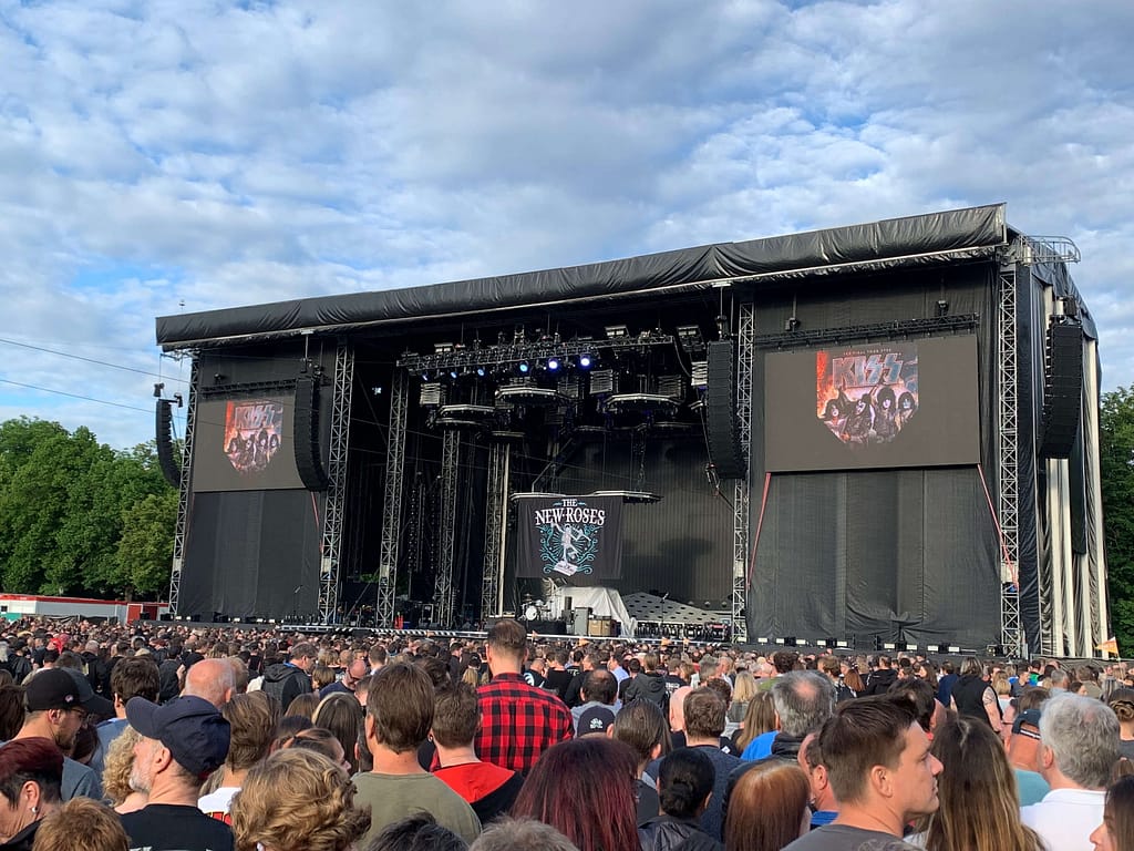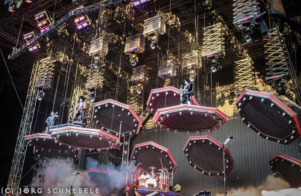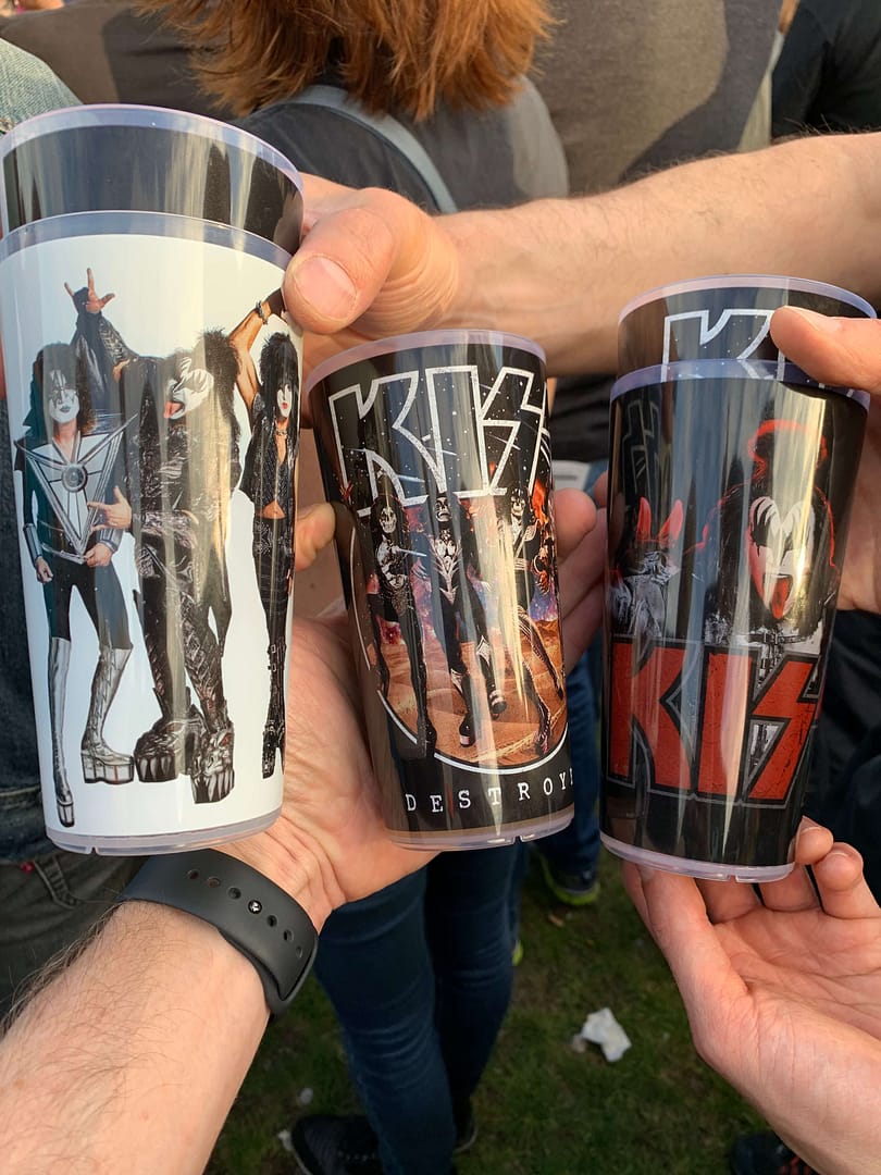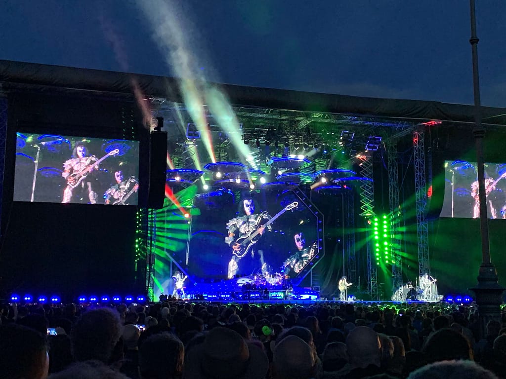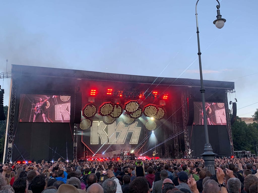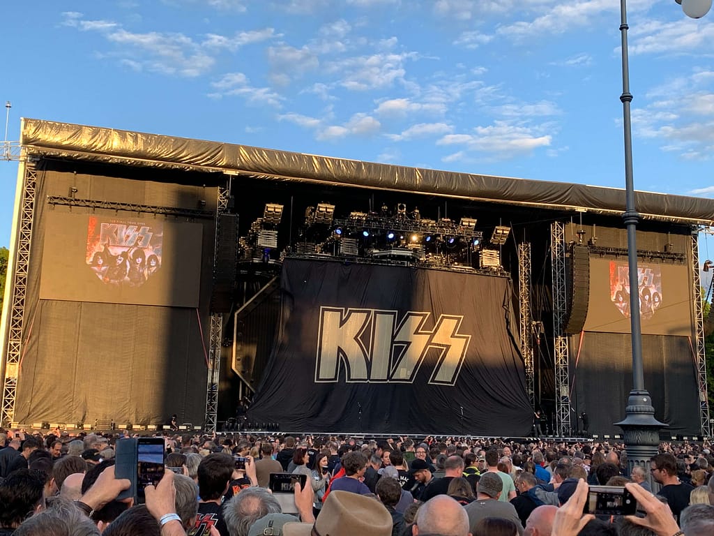Mijn hotel, ligt op 500 meter van de Konigsplatz, voor een concert op dit plein een prima en betaalbare uitvalsbasis. Ik arriveer omstreeks 18.30 uur nabij de Konigsplazt, qua doorlooptijd kunnen ze hier nog wel wat verbeteren, heb dik 45 minuten in de rij gestaan alvorens ik binnen was. Alvorens ik het terrein ga verkennen natuurlijk ff een biertje in een KISS beker, yep dat doen ze dan weer goed in Duitsland ($$$). München is het derde concert van het Europese gedeelte van The End of the Road Tour, hiervoor hebben ze met de Konigsplatz wel een erg bijzondere locatie uitgekozen. Kleine 20.000 mensen weten de weg deze avond te vinden en dat is merkbaar, het is druk. The New Roses mogen rond 19.15 uur de avond aftrappen. Hun, lekker in het gehoor liggende Rock, doet het in de kleine zaaltjes beter dan op deze grote vlakte. Ik zag ze eerder in Tilburg als voorprogramma van The Dead Daisies. Daar kwamen ze beter uit de verf dan hier. Heren gaat dit jaar, evenals in 2018, ook mee op de KISS KRUISE IX, ga ze daar zeker nog zien. Om exact 20.45 uur is Led Zeppelin klaar met “Rock n Roll”, dus is het tijd voor Allright Munich….. Zoals ik in Amerika al zag, komen de heren op drie plateaus naar beneden. Een grandioos gaaf begin! Knallen maar! Helaas is het nog niet geheel donker, waardoor de lichtshow tijdens de eerste nummers nog niet helemaal top uit de verf komt, gezien de bebouwing rondom de Konigsplatz verwacht ik dat het tijdschema wel nageleefd dient te worden i.v.m. geluidsoverlast. Dit behoort wel bij de nadelen van Open Air shows, zeker met een show zoals KISS die laat zien.