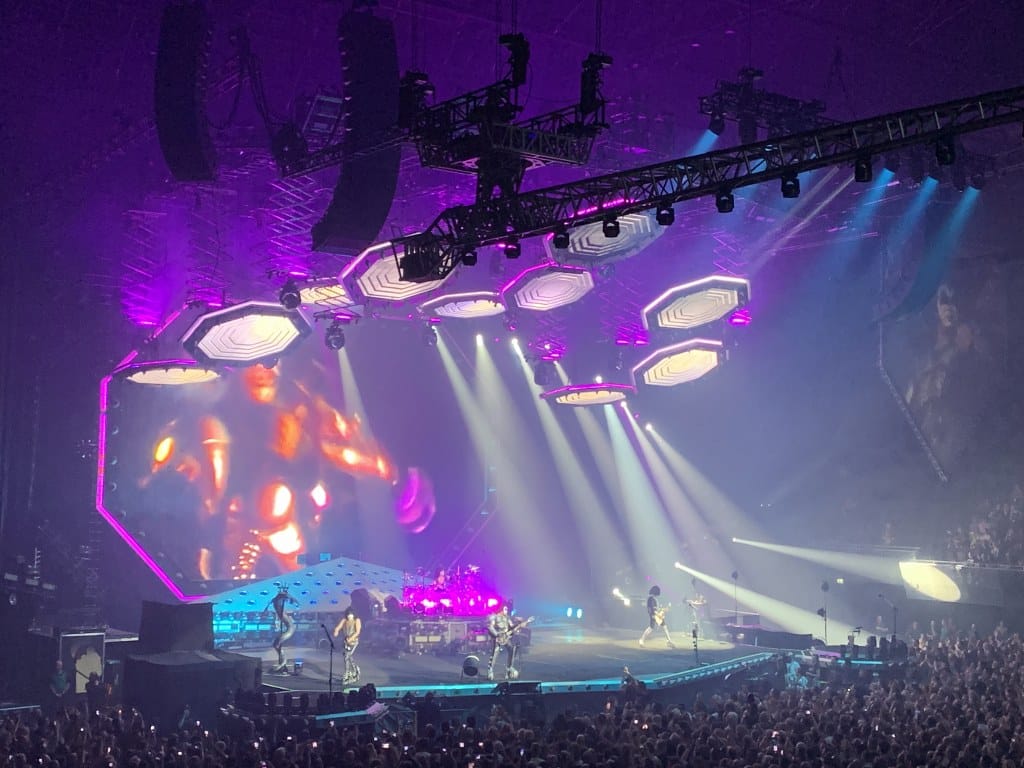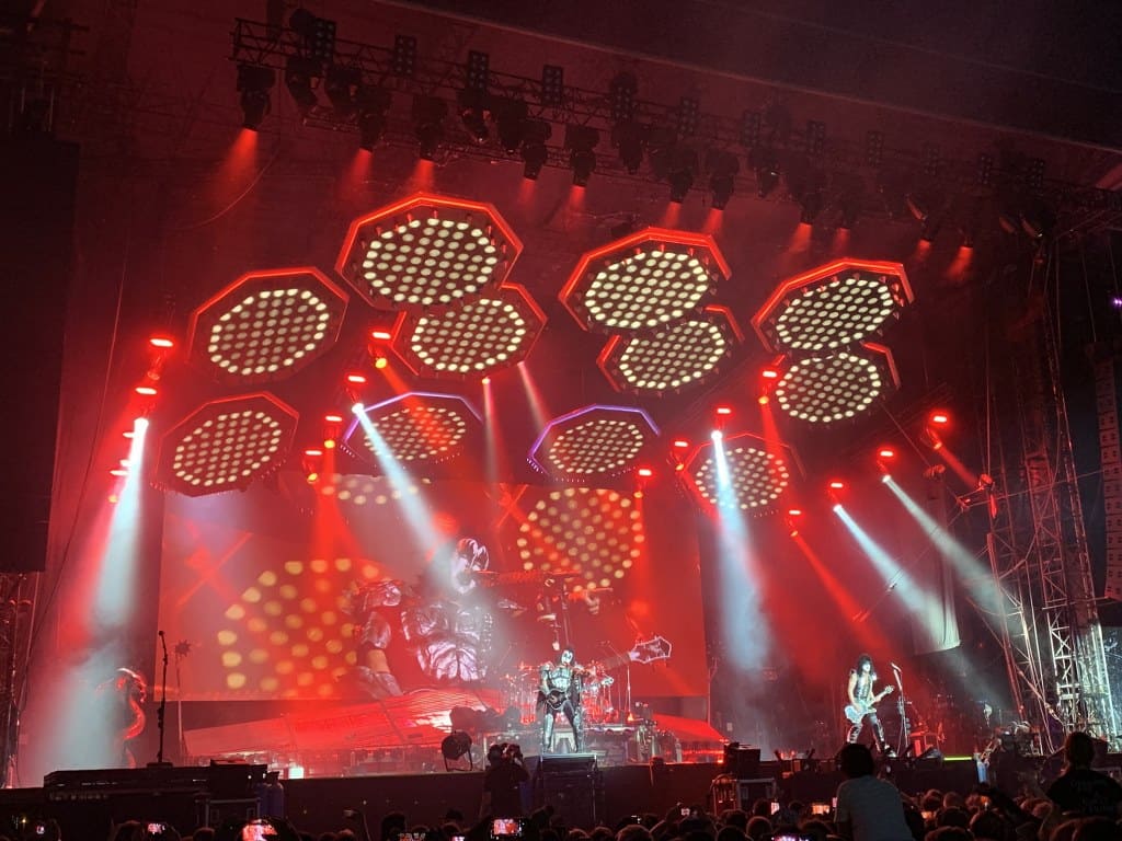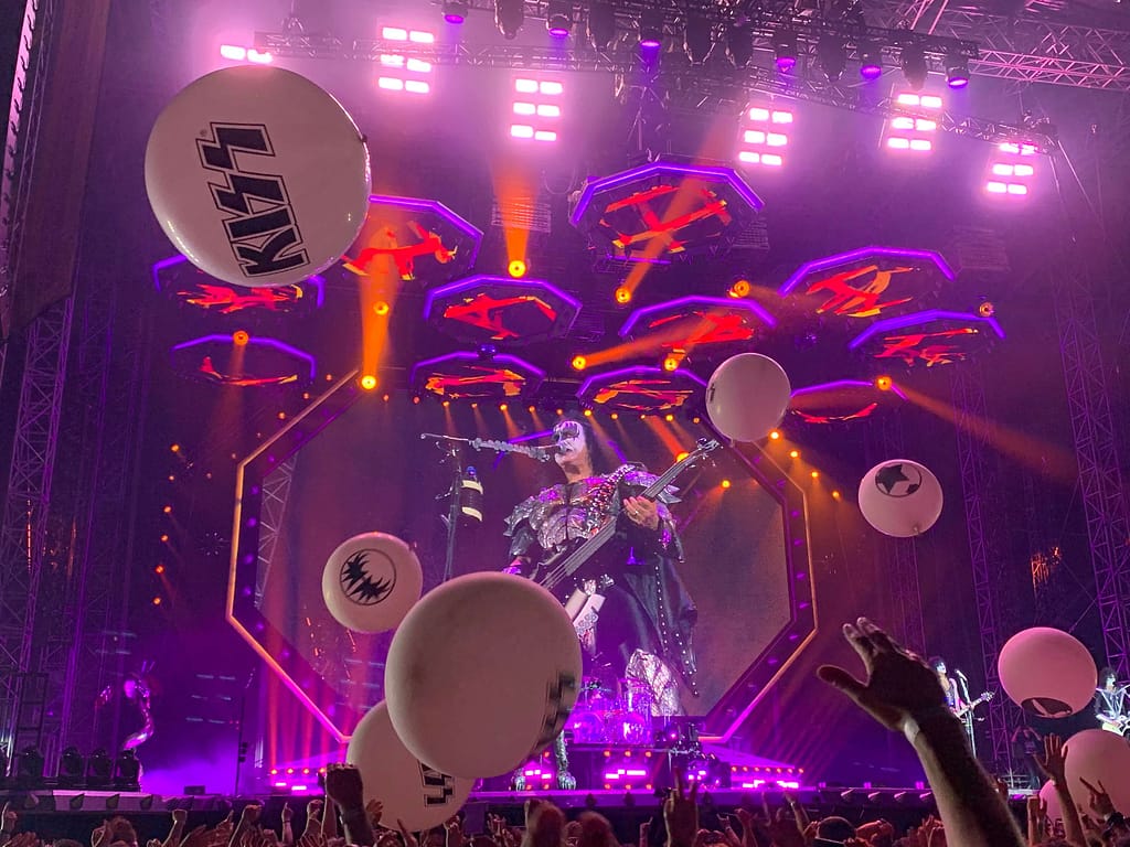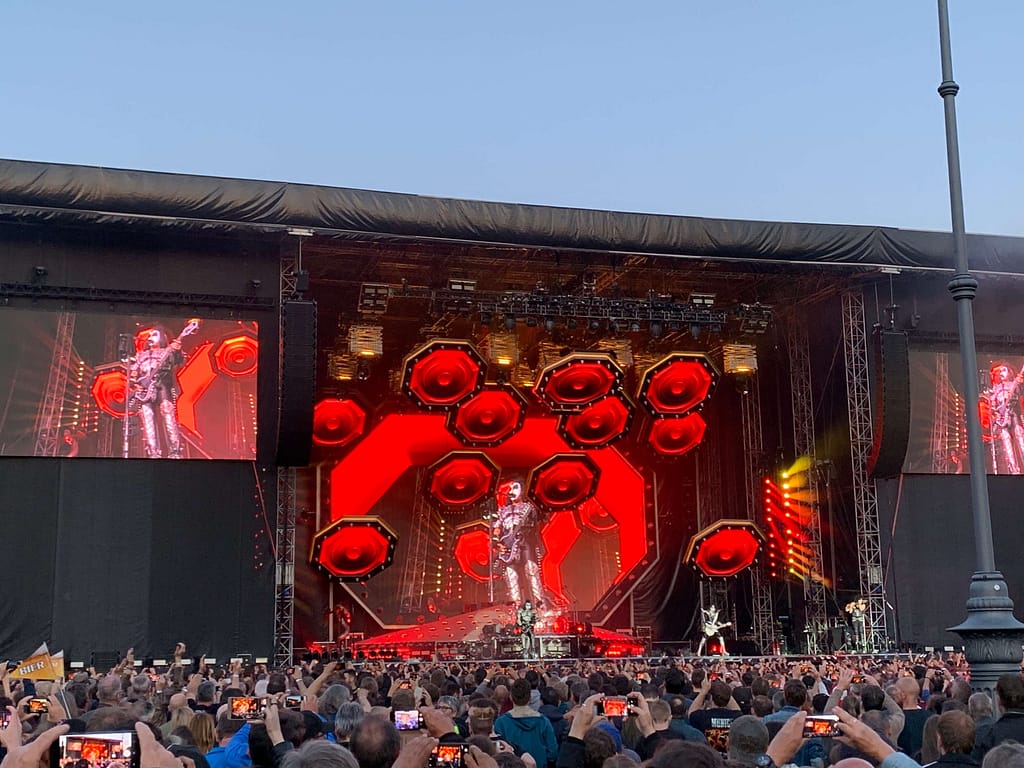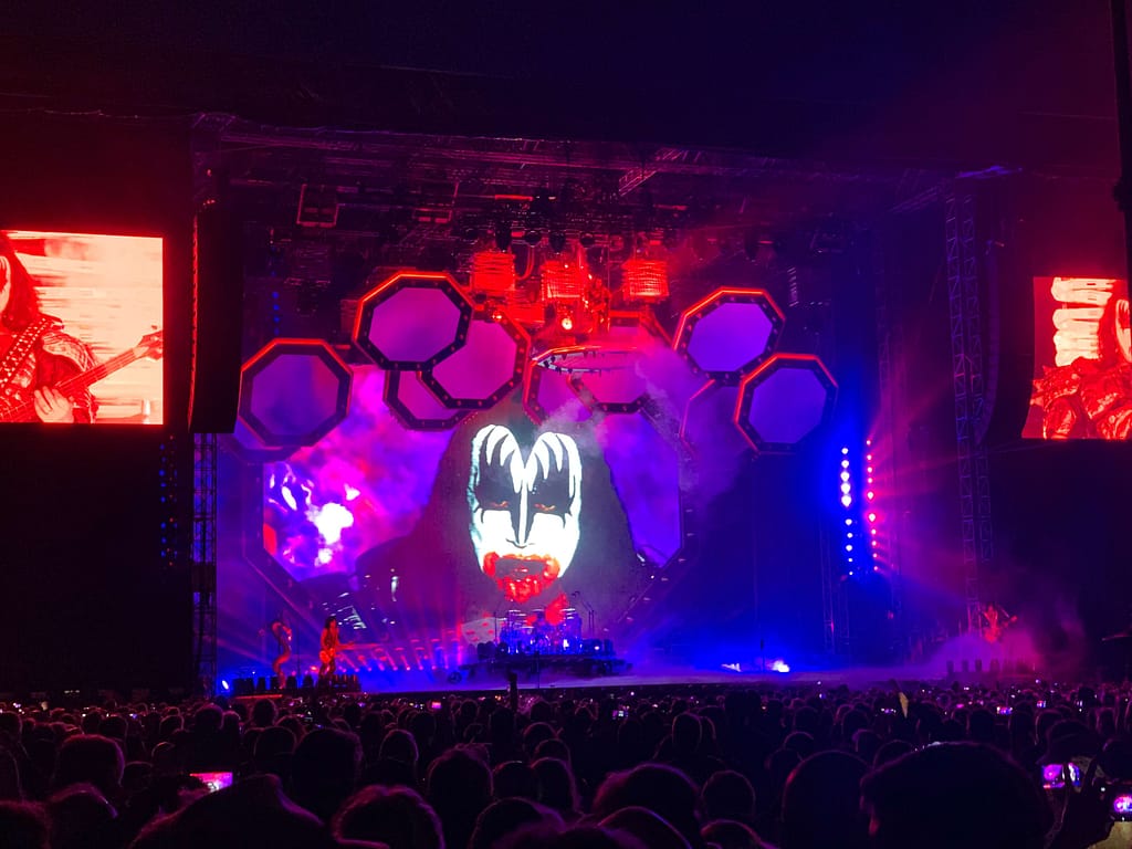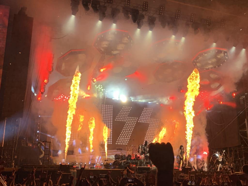 Mijn hotel, ligt op 500 meter van de Konigsplatz, voor een concert op dit plein een prima en betaalbare uitvalsbasis. Ik arriveer omstreeks 18.30 uur nabij de Konigsplazt, qua doorlooptijd kunnen ze hier nog wel wat verbeteren, heb dik 45 minuten in de rij gestaan alvorens ik binnen was. Alvorens ik het terrein ga verkennen natuurlijk ff een biertje in een KISS beker, yep dat doen ze dan weer goed in Duitsland ($$$). München is het derde concert van het Europese gedeelte van The End of the Road Tour, hiervoor hebben ze met de Konigsplatz wel een erg bijzondere locatie uitgekozen. Kleine 20.000 mensen weten de weg deze avond te vinden en dat is merkbaar, het is druk. The New Roses mogen rond 19.15 uur de avond aftrappen. Hun, lekker in het gehoor liggende Rock, doet het in de kleine zaaltjes beter dan op deze grote vlakte. Ik zag ze eerder in Tilburg als voorprogramma van The Dead Daisies. Daar kwamen ze beter uit de verf dan hier. Heren gaat dit jaar, evenals in 2018, ook mee op de KISS KRUISE IX, ga ze daar zeker nog zien. Om exact 20.45 uur is Led Zeppelin klaar met “Rock n Roll”, dus is het tijd voor Allright Munich….. Zoals ik in Amerika al zag, komen de heren op drie plateaus naar beneden. Een grandioos gaaf begin! Knallen maar! Helaas is het nog niet geheel donker, waardoor de lichtshow tijdens de eerste nummers nog niet helemaal top uit de verf komt, gezien de bebouwing rondom de Konigsplatz verwacht ik dat het tijdschema wel nageleefd dient te worden i.v.m. geluidsoverlast. Dit behoort wel bij de nadelen van Open Air shows, zeker met een show zoals KISS die laat zien.