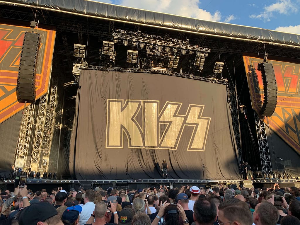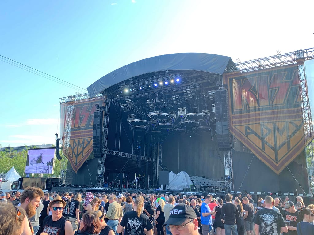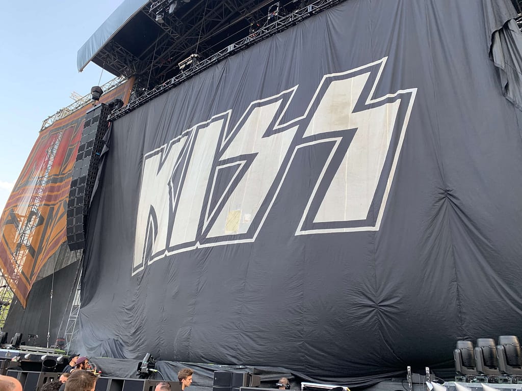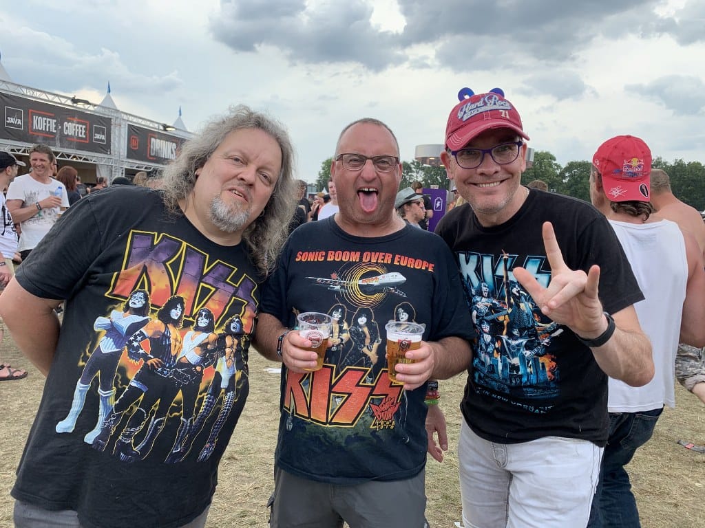 Het is druk op Graspop, voor het tweede jaar volledig uitverkocht! Graspop is TOP georganiseerd, moet ook wel met zo’n hoeveelheden aan mensen. Wat direct opvalt is de mega grote screens die langs het podium hangen, ook aan de achterzijde van de mengtafel is een groot scherm aanwezig! Hiermee is ieder detail op het podium zichtbaar voor de gehele festivalweide. Feit is wel dat je niet “zomaar” iedereen die je kent ook ziet met deze druktes, je moet echt specifiek afspreken! Ik heb Graspop, tot drie jaar terug, trouw jaarlijks bezocht maar weet nu ook weer waarom ik toen afscheid genomen heb van dit mega-spektakel. Muziek en concerten vind ik leuk en bijzonder, echter met deze “grootsheid” gaat de gezelligheid en de sfeer wel wat onderuit. Zo bezocht ik de afgelopen jaren ook vele andere concerten en wat kleinere festivals, eerlijk is dan eerlijk, daar gaat mijn voorkeur meer naar toe. Genoeg gemauwd, want we zijn gewoon op Graspop en KISS speelt hier vanavond in het kader van hun End of the Road Tour, dus zijn we enigszins verplicht om naar Graspop te gaan, ligt immers bijna in de achtertuin.