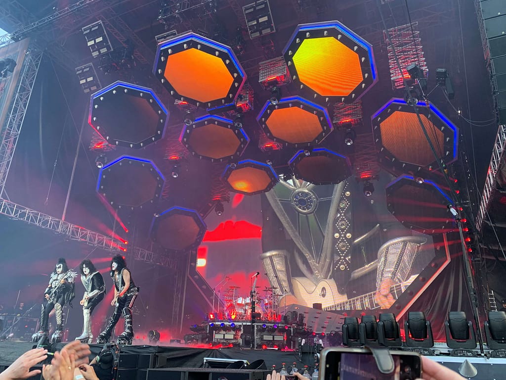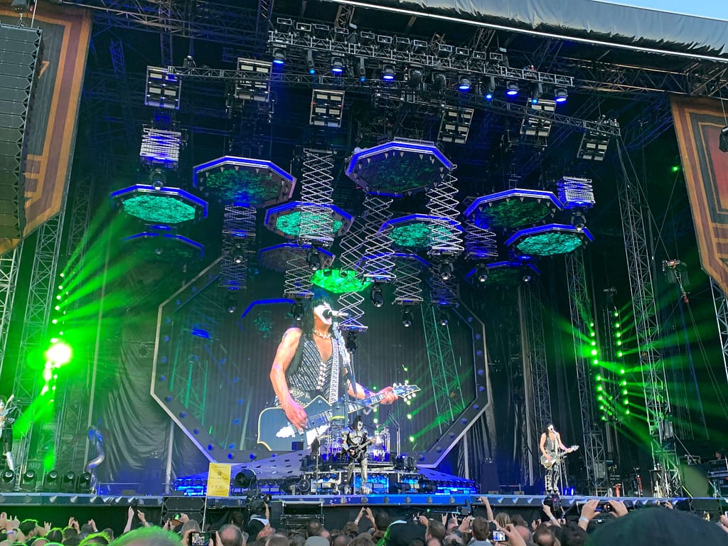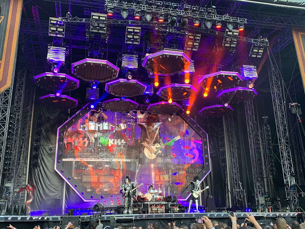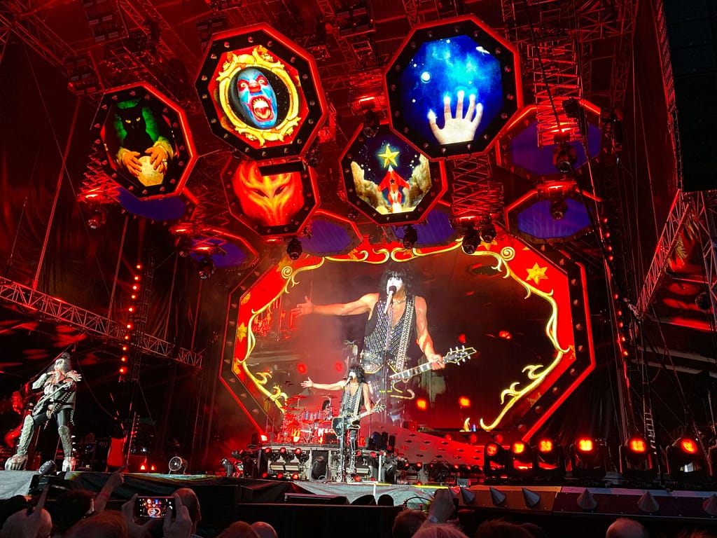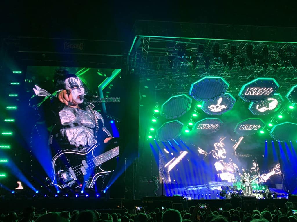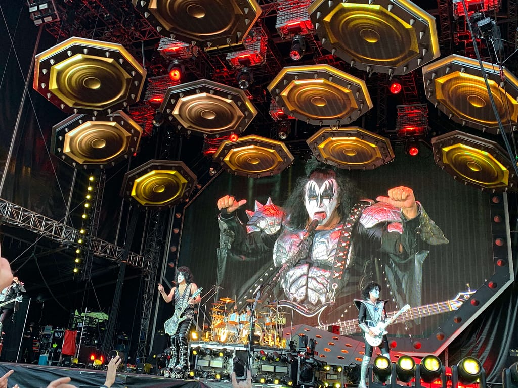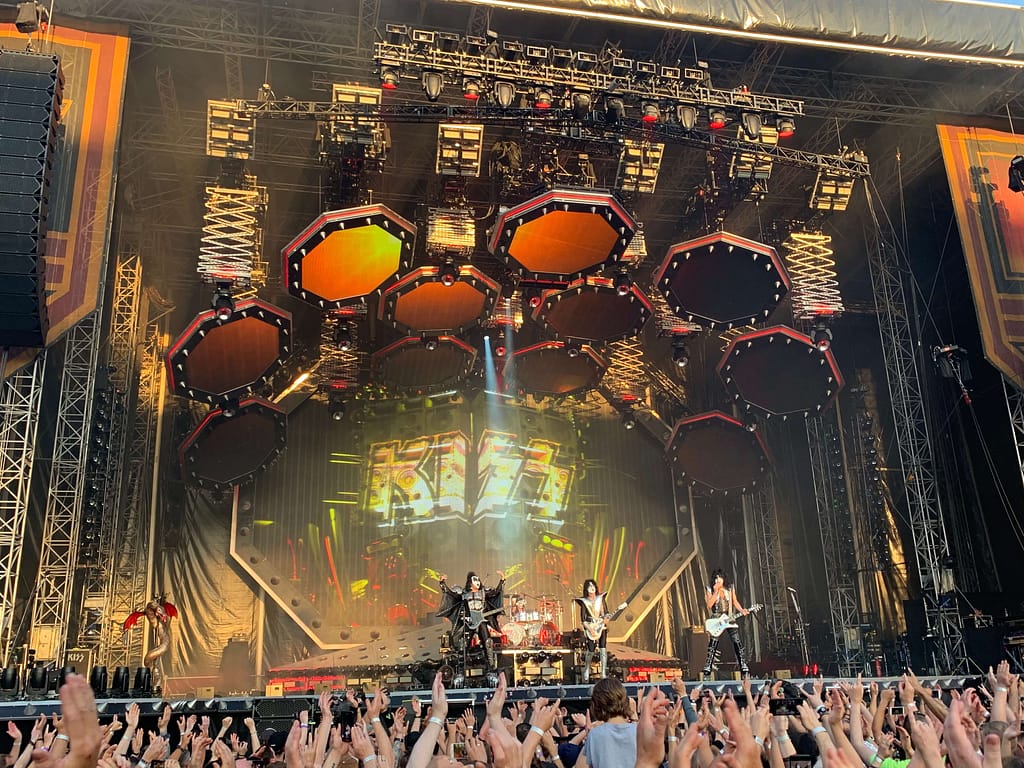 Nog even een hapje en drankje en op naar een nieuw KISS avontuur. KISS trapt rond 23.00 uur af, Allright Graspop……. BAM we zijn weer onderweg met Detroit Rock City! KISS speelt voor een festival optreden echt heel goed! Het grote screen achter Eric Singer, is niet het KISS screen van deze tour, enige vorm van concessies is kennelijk noodzakelijk op festivals!? Daarbij missen we in de lichtshow en op wat andere punten nog enkele showeffecten. Wel zien we een aantal gigantische vlammenwerpers extra voor het podium, die zijn mega-vet! KISS is in TOP-vorm en Gene heeft het, ondanks de hitte, goed naar zijn zin.