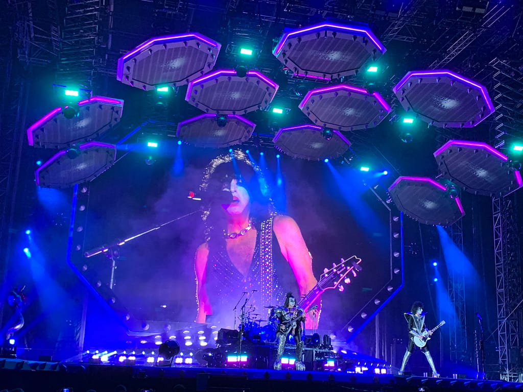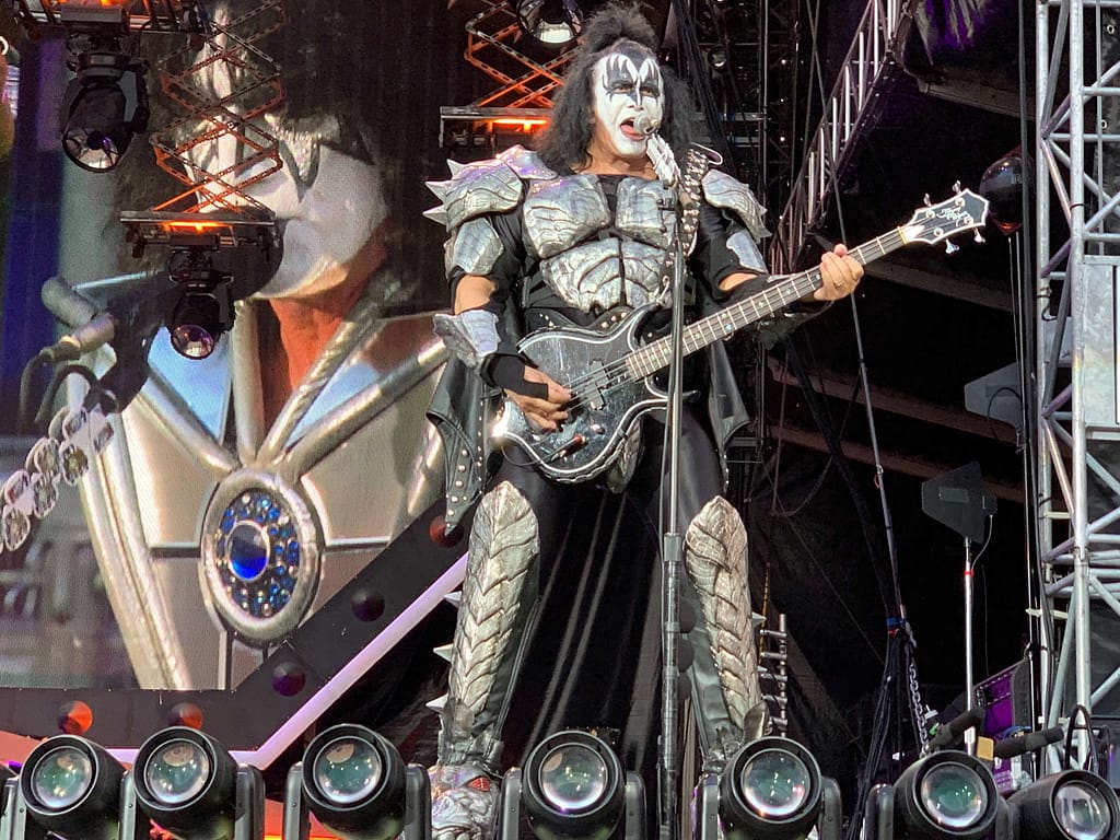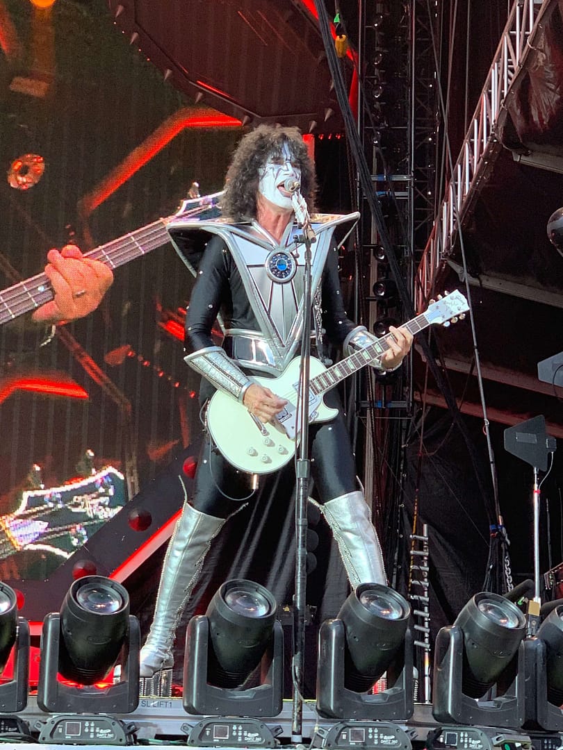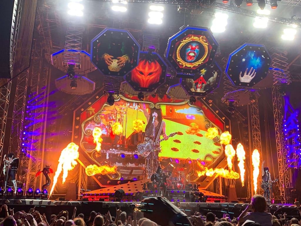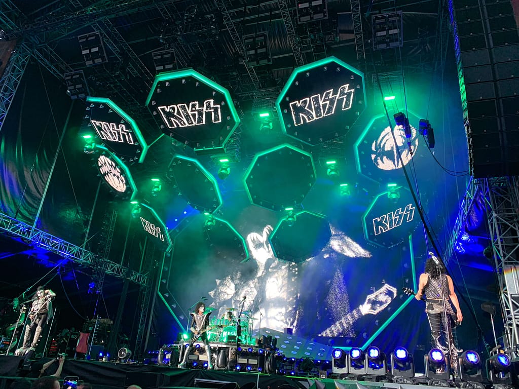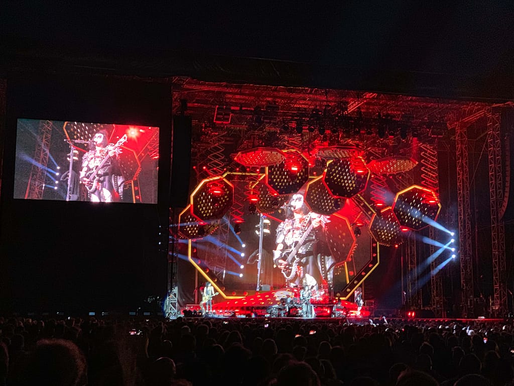 Nog even een hapje en drankje en op naar een nieuw KISS avontuur. KISS trapt rond 23.00 uur af, Allright Graspop……. BAM we zijn weer onderweg met Detroit Rock City! KISS speelt voor een festival optreden echt heel goed! Het grote screen achter Eric Singer, is niet het KISS screen van deze tour, enige vorm van concessies is kennelijk noodzakelijk op festivals!? Daarbij missen we in de lichtshow en op wat andere punten nog enkele showeffecten. Wel zien we een aantal gigantische vlammenwerpers extra voor het podium, die zijn mega-vet! KISS is in TOP-vorm en Gene heeft het, ondanks de hitte, goed naar zijn zin.