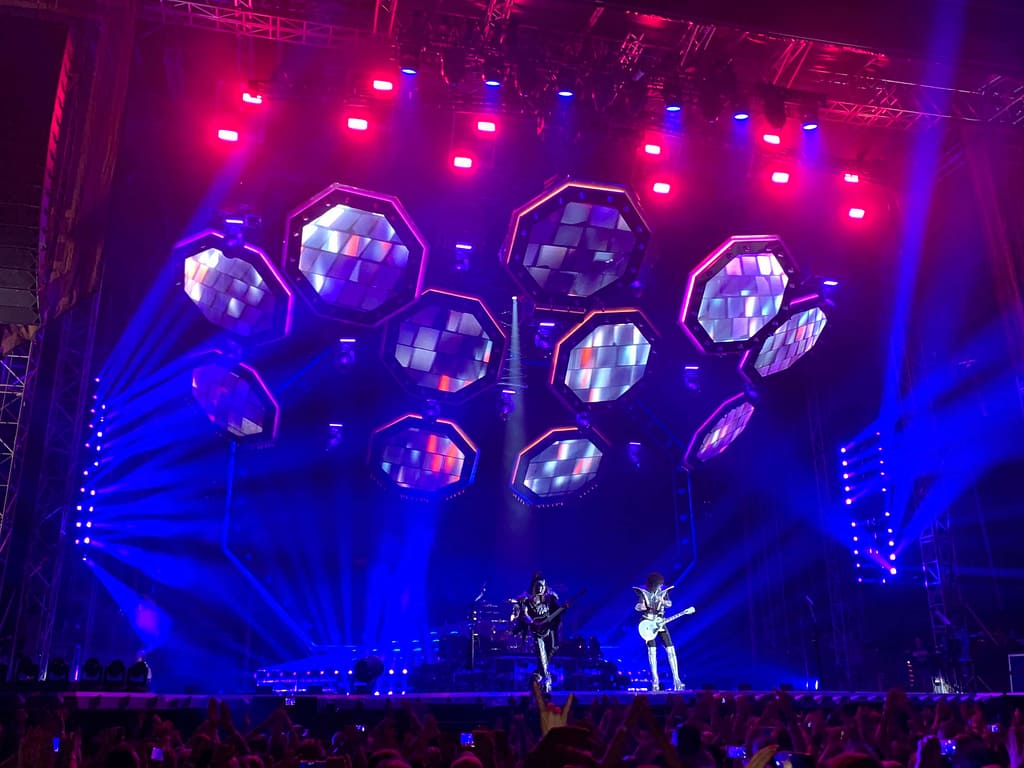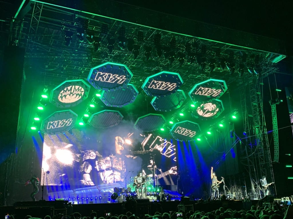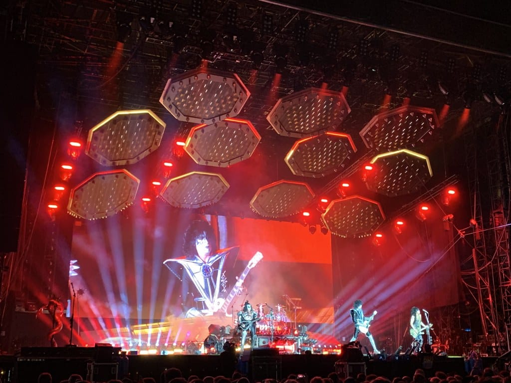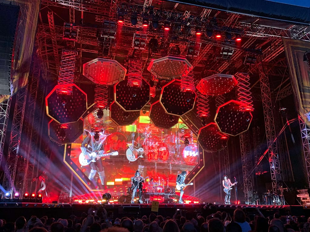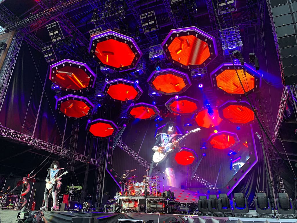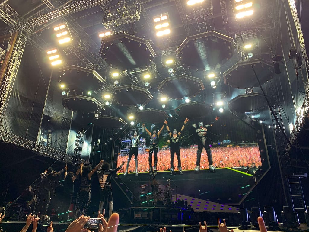 Nog even een hapje en drankje en op naar een nieuw KISS avontuur. KISS trapt rond 23.00 uur af, Allright Graspop……. BAM we zijn weer onderweg met Detroit Rock City! KISS speelt voor een festival optreden echt heel goed! Het grote screen achter Eric Singer, is niet het KISS screen van deze tour, enige vorm van concessies is kennelijk noodzakelijk op festivals!? Daarbij missen we in de lichtshow en op wat andere punten nog enkele showeffecten. Wel zien we een aantal gigantische vlammenwerpers extra voor het podium, die zijn mega-vet! KISS is in TOP-vorm en Gene heeft het, ondanks de hitte, goed naar zijn zin.