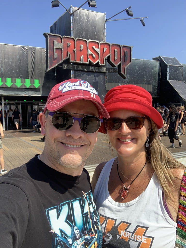23 juni 2019, een nieuw KISS avontuur op Graspop Metal Meeting in Dessel. Een vier daags festival wat ik vaak volledig bezocht heb maar voor dit jaar verkies ik alleen de zondag, vanwege oa KISS, Def Leppard en Whitesnake. Daarbij heeft de KISS Tour 2019 al de nodige impact gehad en krijgt het nog dat 1 dag Graspop voldoende is voor dit jaar! De weersvoorspellingen zijn hot om de hottest band in the world te gaan zien, een leuke combinatie, echter KISS trapt pas rond 23.00 uur af dus een pittig dagje in het vooruitzicht. We doen voor deze dag weer een auto/fiets combinatie. Aangezien KISS het festival afsluit is de verwachting dat vele bezoekers het festivalterrein gaan verlaten na KISS, als je dan op een van de door Graspop aangewezen parkeergelegenheden parkeert, dan wordt het een lange terugreis. Dessel is voor ons maar zo’n 20 km rijden en we kennen de weg daar, dus we parkeren de auto in Dessel en gaan op de fiets naar het festivalterrein, waar overigens voldoende gelegenheid is om je fiets te parkeren. Centrum van Dessel ligt ongeveer 4 km van het festivalterrein verwijderd. Rond 15.00 uur zijn we aanwezig op het Graspop gras, wat dan al voor de vierde dag betreden wordt, dus veel zand ipv gras.