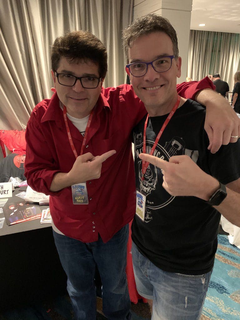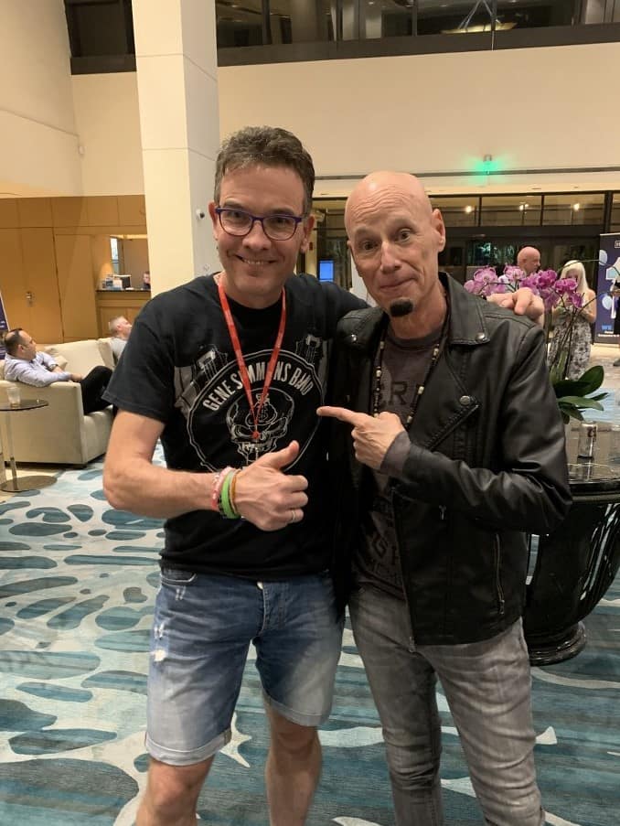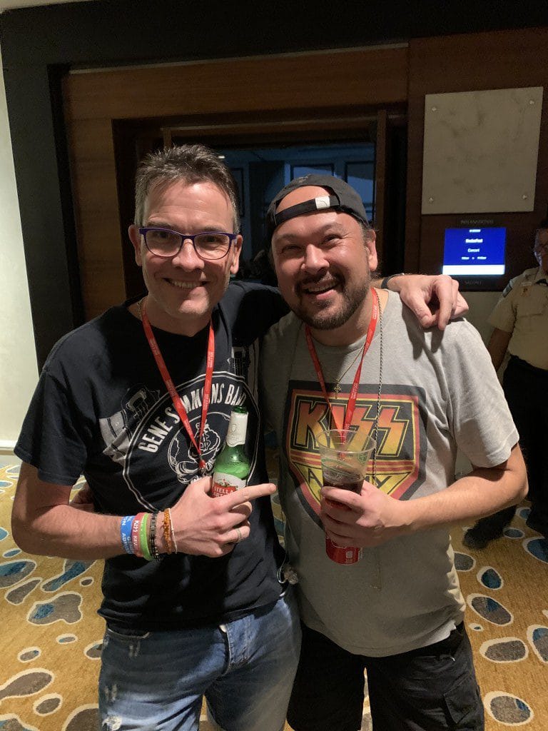 Onze Nederlandse heren van KISSSTERIOUS zijn ook aanwezig, zijn uitgenodigd voor een akoestische set tijdens de poolparty. Daarbij nog even met Bob Kulick gesproken en gelachen. Bob kennen we natuurlijk als de broer van Bruce en heeft in het verleden ook veel goed werk verricht. De details ga ik hier besparen maar zijn optreden van deze avond kan/mag geen doorgang vinden, kennelijk twee heren die dat in de weg staan, laat ik het daarbij maar houden. Natuurlijk mag een ontmoeting met Phil, Jeremy en Ryan niet ontbreken. Die kennen me na al die jaren en hebben we met alle KISS en Gene events al veel een vaak ontmoet, ff “knuffelen” dus.