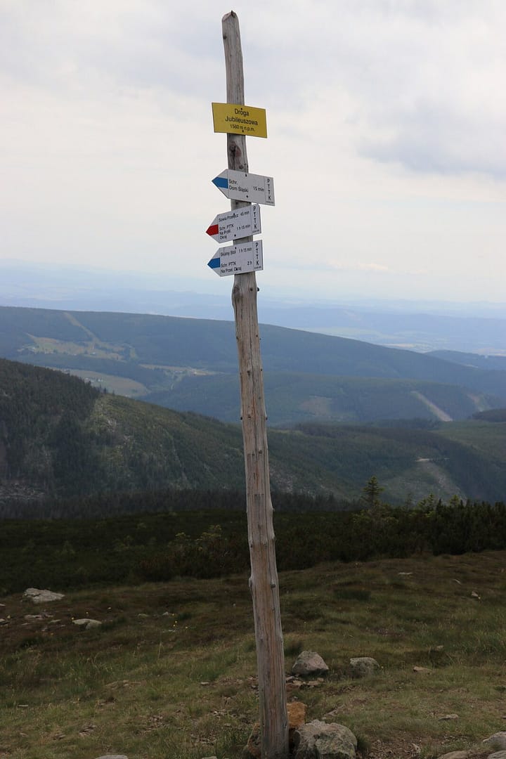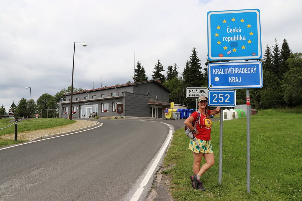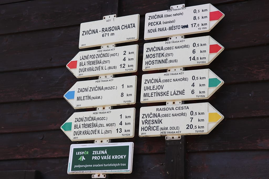Route aanduiding: Tsjechië kent een goed onderhouden net van wandelpaden. De kleur van het vakje in de punt van het  bordje geeft aan of het een directe verbinding of een zijpaadje is.  De volgorde van de kleuren is: rode markering voor de hoofdroute en de blauwe, gele of groene markering voor de zij-routes.  Op open plekken hoog in de bergen, waar geen bomen of palen zijn wordt de route’s winters gemarkeerd door lange stokken in de sneeuw. De kleuren staan tussen twee witte balken en bevinden zich aan de kant waar gewandeld dient te worden. Wanneer de route over de rijweg voert zullen de aanduidingen zich altijd aan de linkerkant bevinden omdat dit veiliger is vanwege het eventuele verkeer. Wanneer de route naar rechts of links afwijkt staat dit aangegeven met een gekleurde pijl tussen de twee witte balken. Het nieuwe pad wordt vervolgens aangeduid met twee aanduidingen aan beide kanten van het pad. De aanduidingen kunnen zich bevinden op bomen,  paaltjes, stenen en zelfs op huizen. Op “knooppunten” van verschillende routes staan palen met afstanden en de plaatsnamen. Ook zijn deze “informatiepalen” te vinden  aan het begin van elke route.