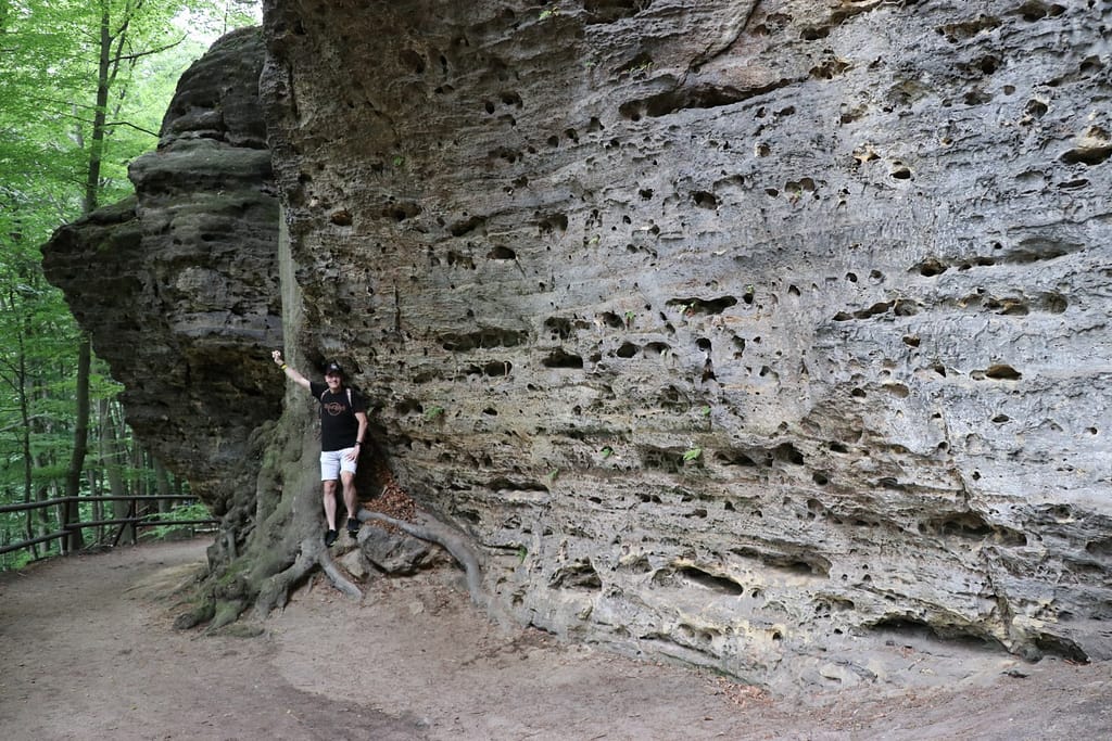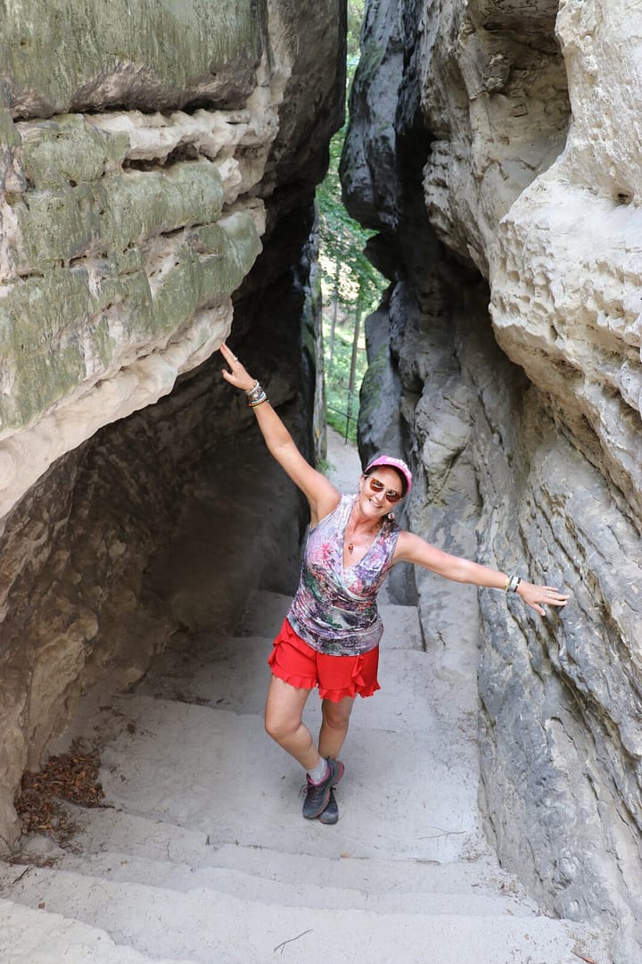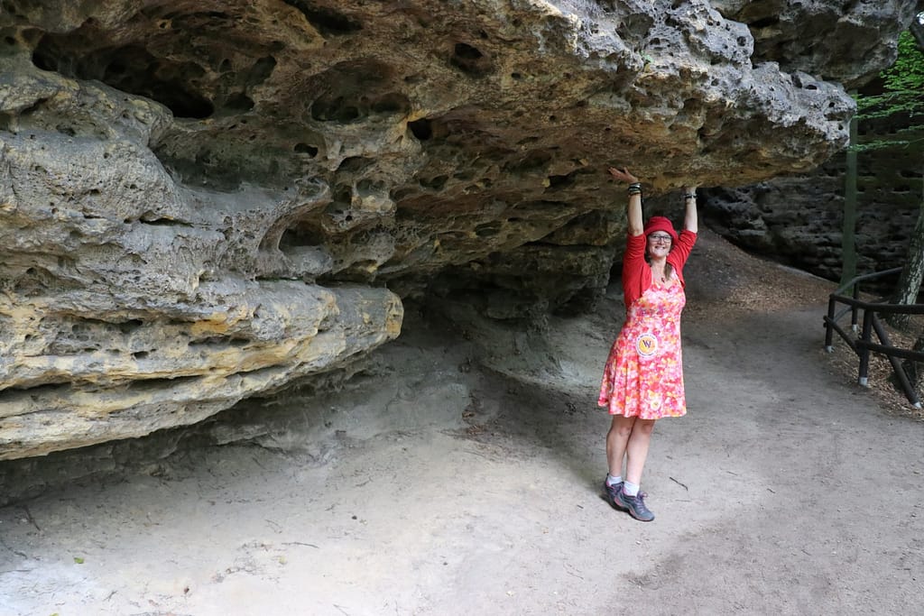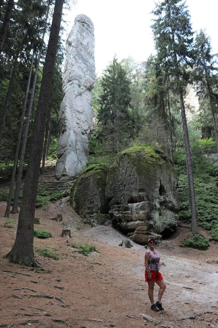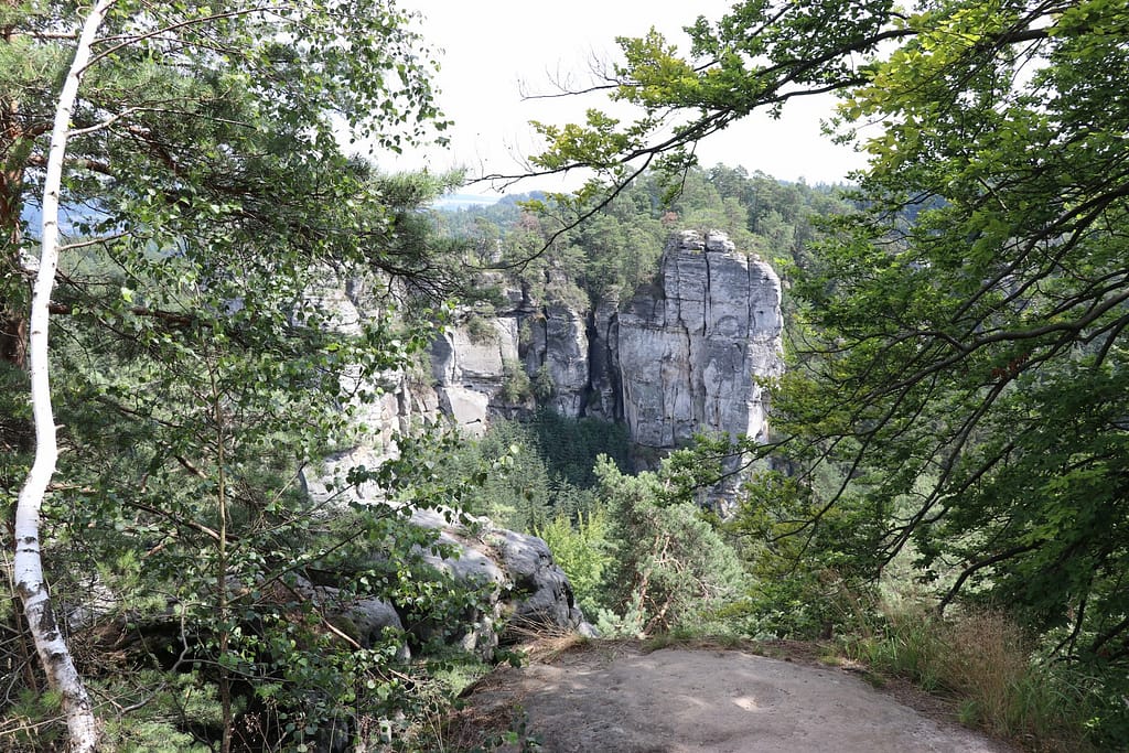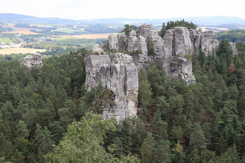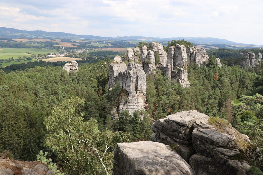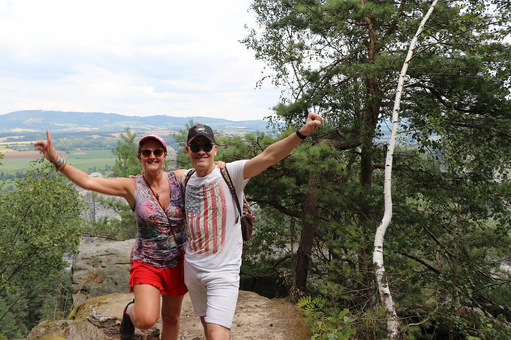 Tsjechië is veel meer dan alleen Praag en het land blijft ons vooralsnog verbazen. Voordat we naar ons “wandelverblijf” rijden maken we nog een bijzondere wandelstop bij Janova vyhlídka. Vanuit de parkeerplaats (50 Kr.) wandel je in een dikke 3 km naar dit schitterend uitzichtpunt. Het is warm en klam vandaag dus zweten, zeker op de steile stukken. Het is maar 6 km, toch een stevig tochtje, wat de moeite meer dan loont. Schitterend uitzicht over de steenformaties en de vergezichten in de wijde omgeving! Deze trip is een echte aanrader, houd rekening met een 2 uur heen en terug.