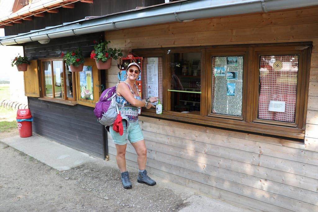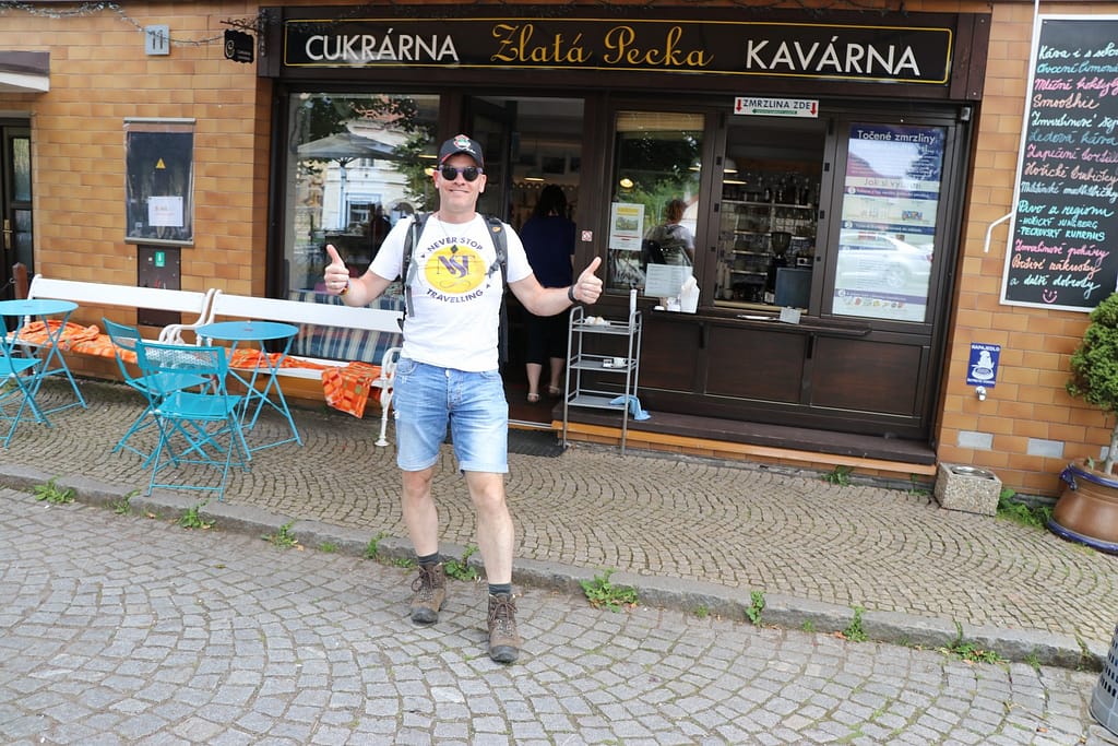 Na al dit lekkers is het tijd om te beginnen aan de laatste 8 km van onze wandelweek in Tsjechië. Je kunt de route van en naar Miletin nog wat inkorten door net voorbij busstop 4086 het weiland in te lopen. Mapy.cz (App) helpt je wel verder. Leuke tocht waarmee je ongeveer 1 km inkort. Ook vandaag schitterend weer en heerlijk gewandeld. Onze “Snezka-trip” van gisteren nog in de benen maar we blijven genieten van elke stap in dit prachtige land. Na een dagtocht van 16 km is het tijd voor ons laatste hapje en drankje van deze wandelweek.