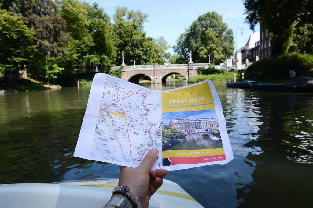 Met heerlijk weer vermaak je je natuurlijk in de oude gracht: wij kozen voor actief bezig zijn van zo’n 1,5 uur door de grachten van Utrecht: Waterfietsen/pedal boat door de grachten. Een aanrader