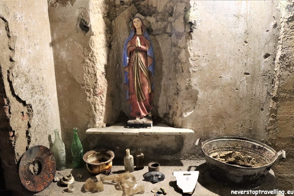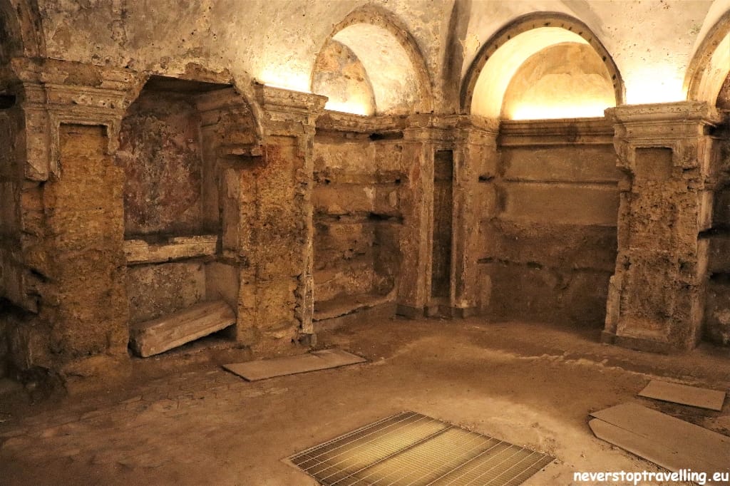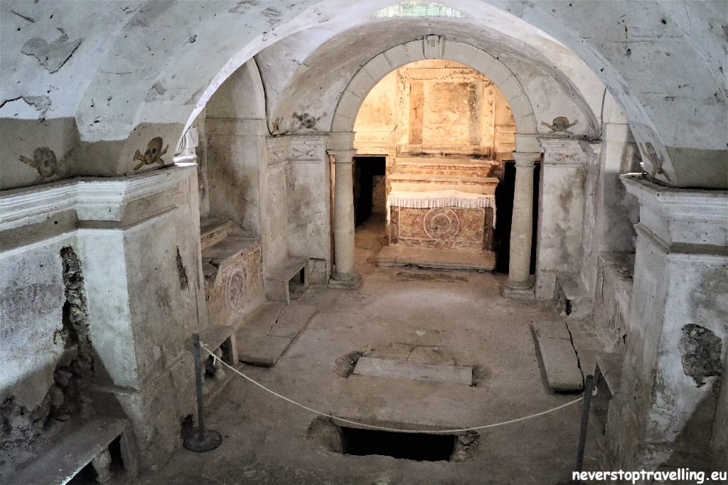 De kerk van San Filippo Apostolo is een katholieke rituskerk gebouwd in 1743 en gelegen in de Giudecca-wijk van Ortigia , het historische centrum van de stad Siracusa. Direct onder de kerk, door toegang te krijgen tot het luik bij de ingang, is er een crypte met zijn ossuarium met een patroon dat ook typerend is voor andere crypten van de Siracusaanse broederschap. Deze crypte, die een echte kapel is geworden, heeft drie altaren, een grote en twee kleine, en twee zijkapellen. Er zijn fresco’s, te dateren tussen de achttiende en negentiende eeuw, die het thema van de dood uitbeelden, de veertien staties van de Via Crucis en, op het hoofdaltaar, het erbarmelijke tafereel van de afzetting van de Heer in het graf. Helaas zijn alle fresco’s in een slechte staat van instandhouding. Op de grond zijn er keramische sterren. Het was de begraafplaats van de leden van de Aartsbroederschap totdat begraven binnen de stadsmuren aan het begin van de negentiende eeuw werd verboden. Sindsdien wordt er verder gewerkt aan de tijdelijke opslag van lijken en wordt daar nu eenmaal per jaar gevierd op de dag van de herdenking van alle overleden gelovigen. Op 18 meter diepte tref je een bad aan, hier werden vroeger de joden gereinigd voordat ze gingen trouwen, kinderen kregen e.d.- Het water wordt ververst door het water wat uit de muren komt. Erg bijzonder om een kijkje onder deze kerk en het gigantische gangenstelsel te nemen. Elk half uur (m.u.v. tussen 12.00 en 15.00 uur) zijn er kosteloos rondleidingen in de Crypte en het gangenstelsel. Een donatie aan de kerk wordt wel op prijs gesteld maar is geen must. Indrukwekkend!