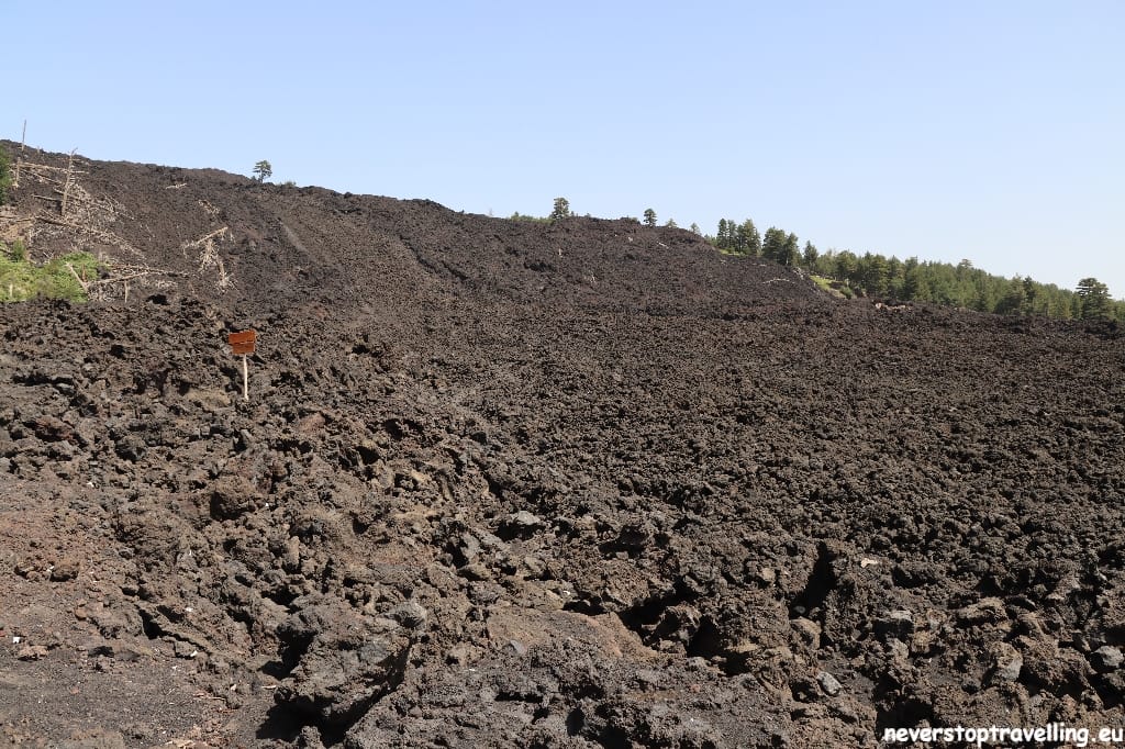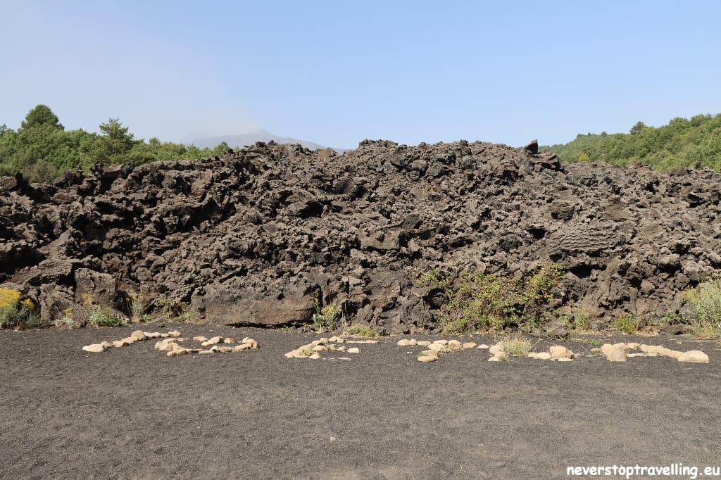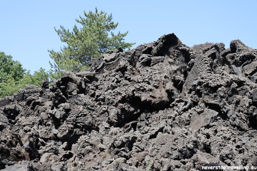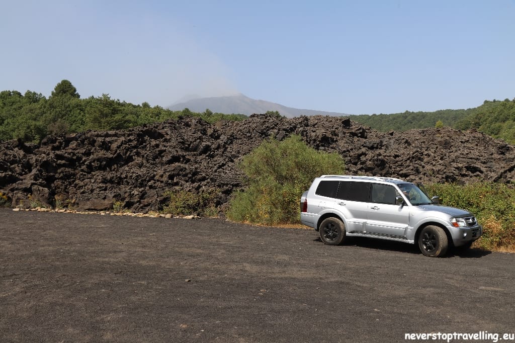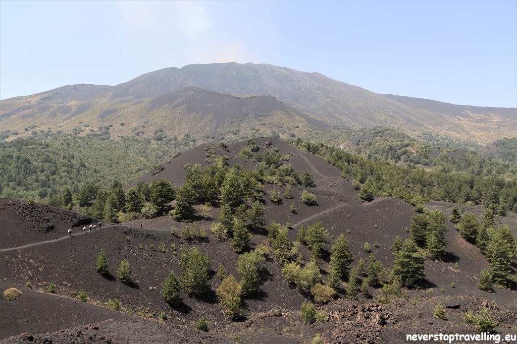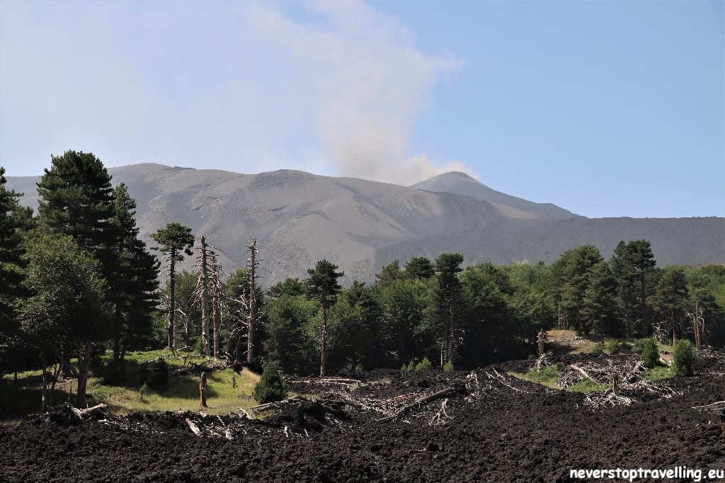 In de zomermaanden kan het behoorlijk warm zijn op Sicilië, toch ga je met je Etna bezoek aardig de hoogte in dus een een truitje meenemen kan geen kwaad. We mogen (augustus 2021) maar tot 1.800 meter want de vulkaan is de laatste weken erg actief dus de hoger gelegen gebieden zijn afgesloten. In de wintermaanden kun je zelfs skiën hier, er zijn skiliften e.d. aanwezig voor de Etna-wintersporters. Rondwandelen in het Etna gebied is als wandelen over een popcornveld, je zakt heerlijk weg in de zwarte en zachte grond. Zwart, zwart en nog eens zwart! Wel erg vruchtbaar want er groeien hier bomen en planten die erg zeldzaam zijn. En overal zie je de rookpluimen van Mount Etna bovenuit pluimen. In de krater is volop “leven” maar is te gevaarlijk om van zo dichtbij te bekijken op dit moment.