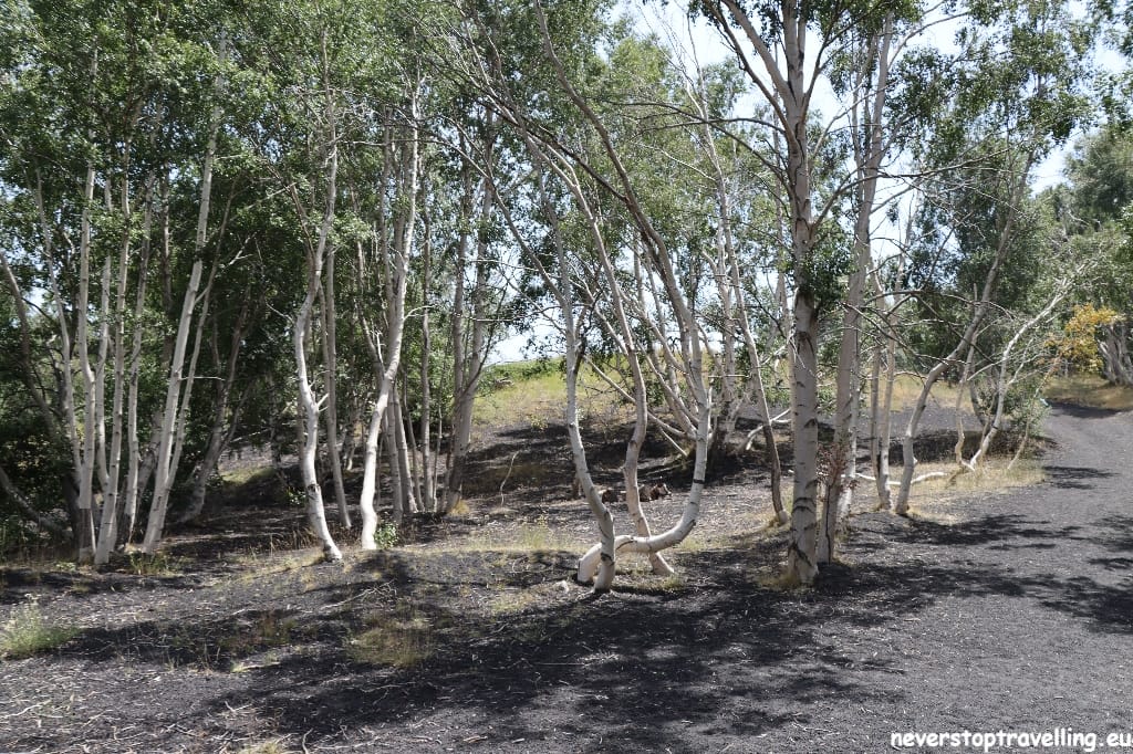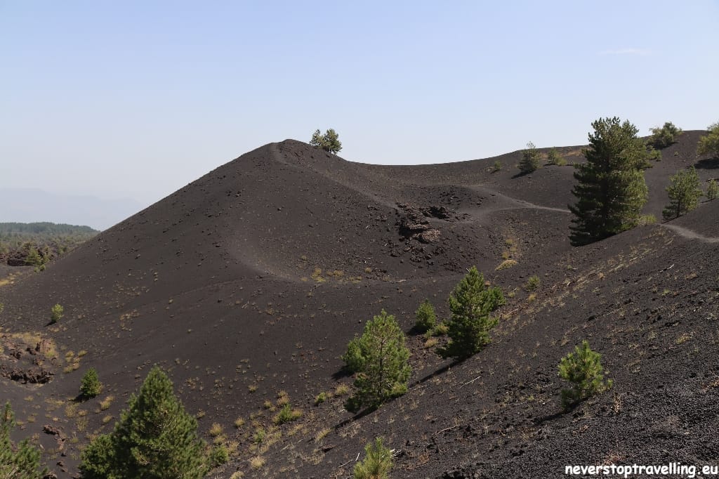 Door de hevige activiteiten van de afgelopen maanden is er heel wat as de lucht in geblazen door de vulkaan en dan komt ook weer neer in de nabije omgeving. Sommige wegen zijn pikzwart terwijl er een mooi asfalt laagje onder ligt wat je niet ziet. De overheid heeft het hier druk om opruimen van de asdeeltjes maar na een windje en/of regen ligt alles weer onder, denk je dan klaar te zijn dan strooit Etna wel weer een nieuw laagje neer. Aan een van de Etna flanken groeien erg veel berkenbomen, daar waar wij die kennen met 1 stam, zie je hier prachtige berkenformaties zijn werk doen. Prachtig!