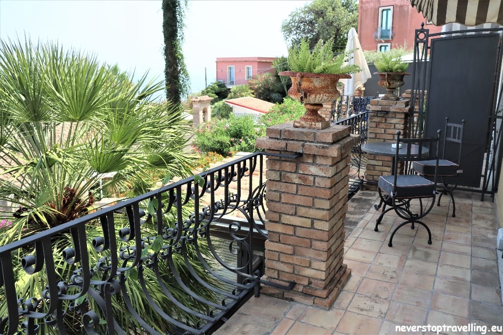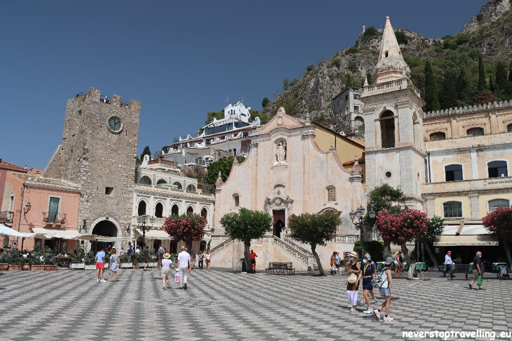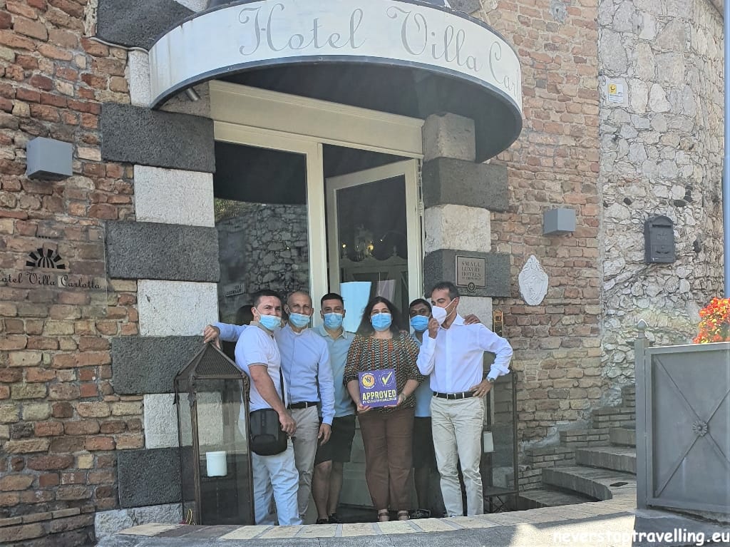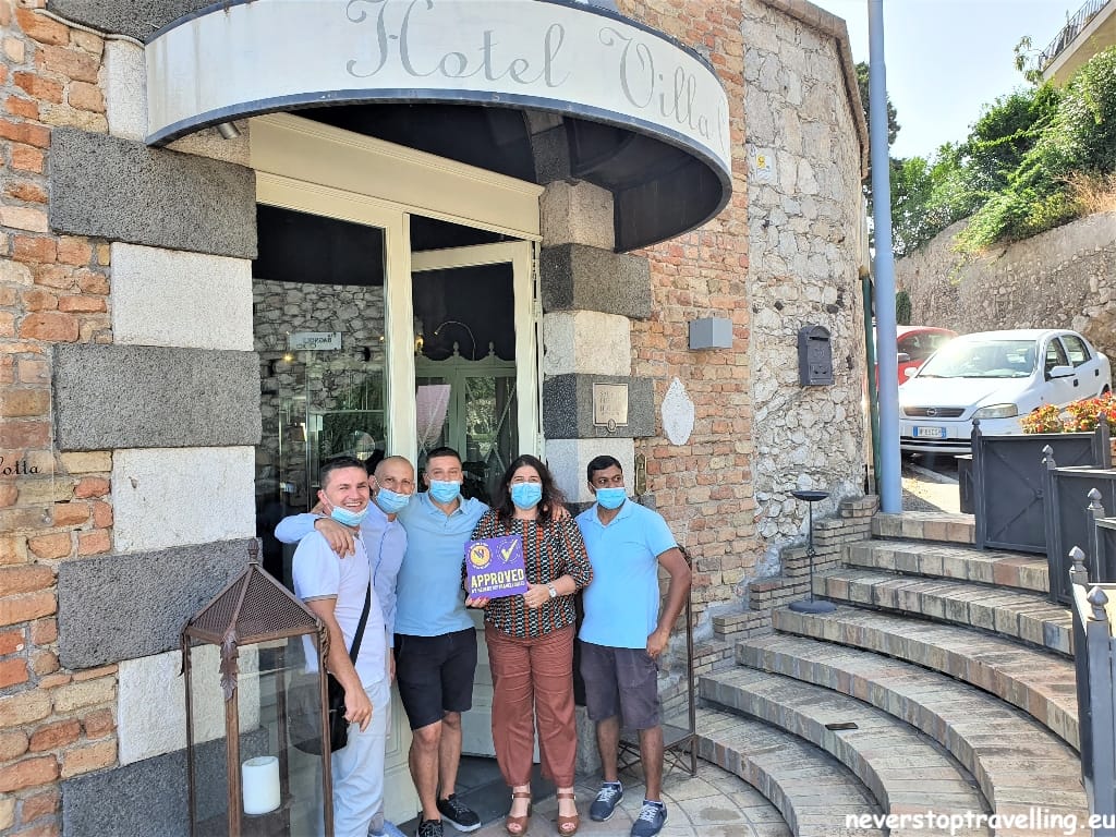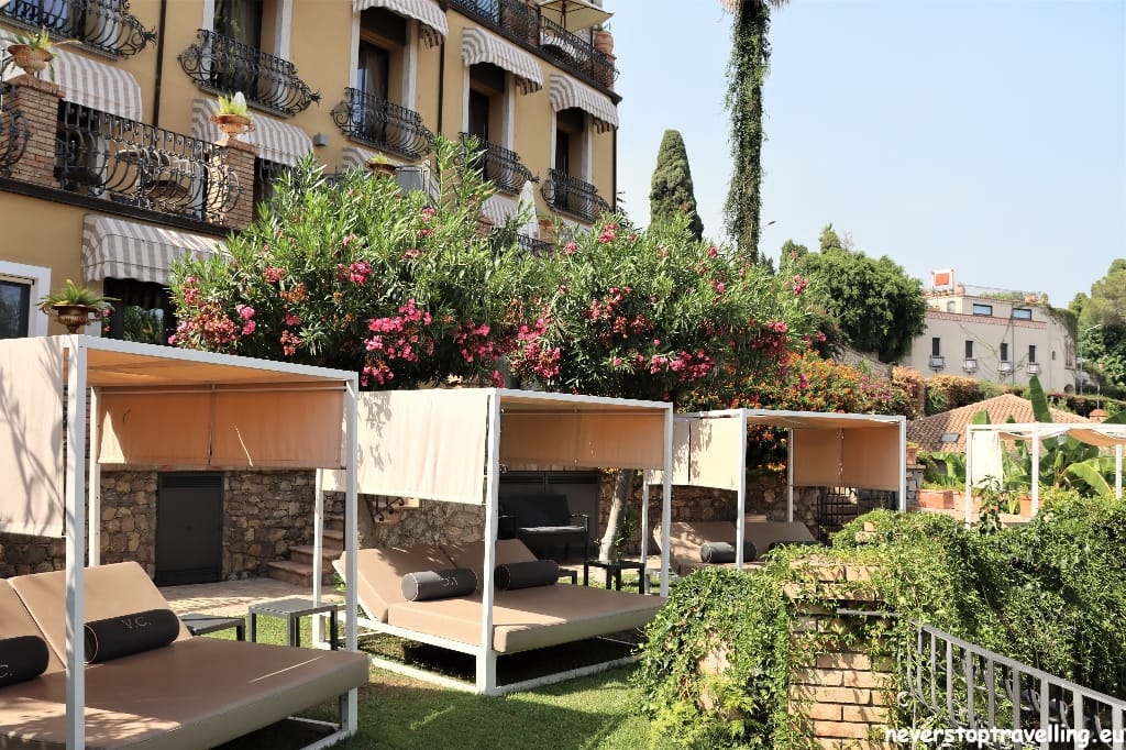 De snelweg kent meer bruggen en tunnels dan gewone stukken asfalt, je zou de weg hier bijna een kunstwerk kunnen noemen. Nabij onze eindbestemming zien we ook nog enkele heftige bosbranden waar met helikopters en blusvliegtuigen de brand wordt bestreden, laten we maar hopen dat het werk van de hulpdiensten snel resultaat oplevert! Aangekomen in Taormina zie je al snel dat dit een paradijs op aarde is! De stad telt zo’n 11.000 inwoners en is daarmee niet eens zo groot, de ligging daarentegen is grandioos. We verblijven in Boutique Hotel Villa Carlotta, paar minuten wandelen van het centrum van Taormina en een 15 minuten traplopen (Let op: 680 traptreden, want die hebben we geteld voor jullie) naar beneden van het strand verwijderd. Je moet dus ook weer terug over al die trappen! Geen zin in of laat de conditie het niet toe, vanuit het hotel zijn er gratis shuttle diensten naar het prachtige (kiezel)strand en/of een van de nabij gelegen stranden.