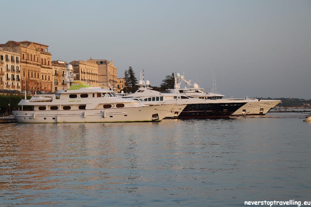 Ook in Sicilië gaat de zon onder, vanuit de jachthaven van Ortigia heb je wel een heel erg gaaf beeld op de zonsondergang! Aan de haven zijn ook diverse restaurants en barretjes aanwezig, dus wil je romantisch de zon zien verdwijnen, onder het genot van een drankje, zit je hier goed! In de jachthaven ligt overigens voor een paar euro’s aan bootjes geparkeerd!