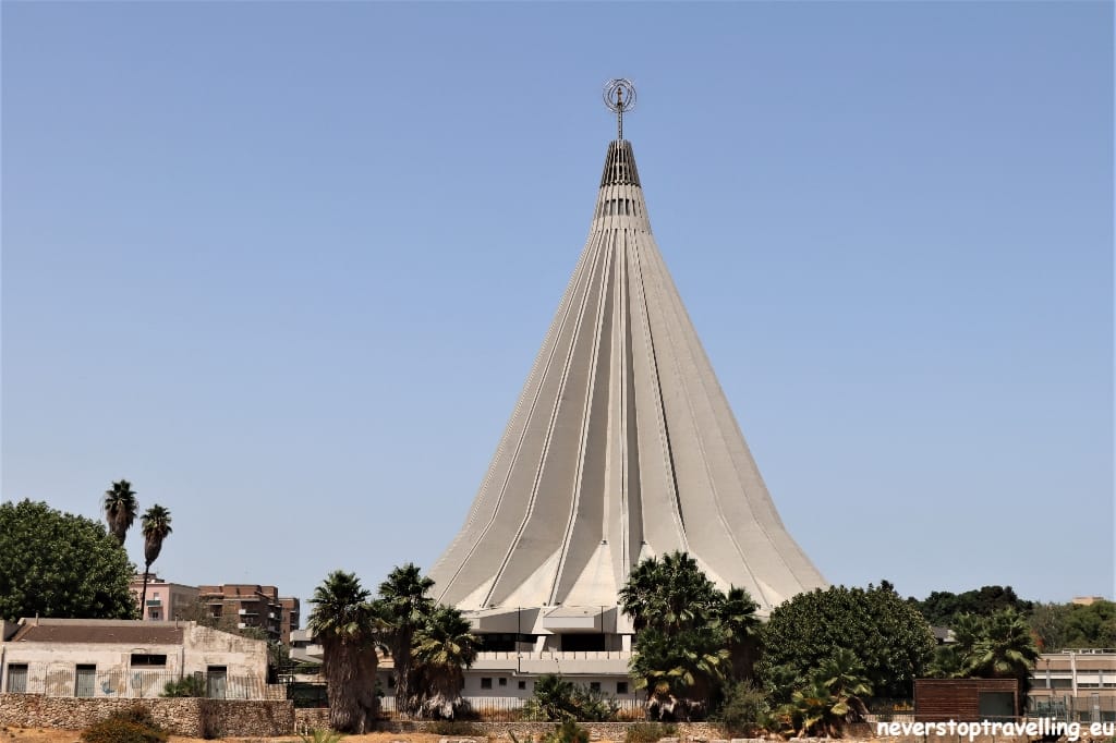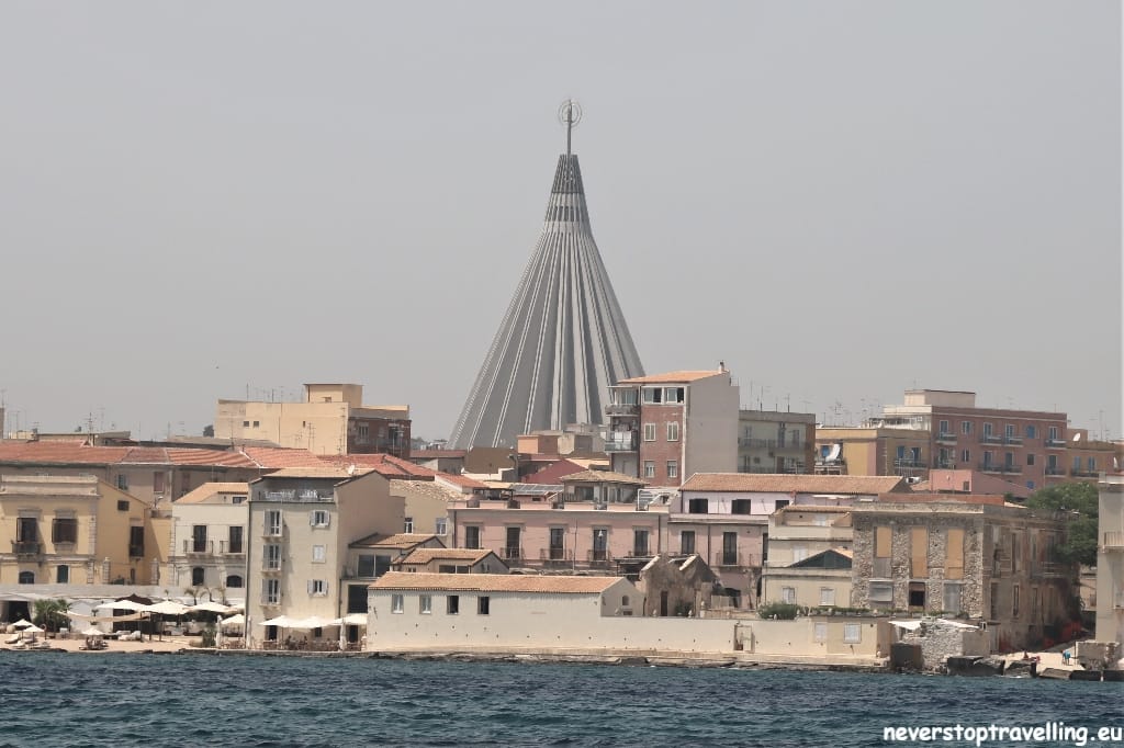 Deze kerk, Madonna delle Lacrime, is vanuit elk punt van de stad te zien! Wat een bouwwerk. De kerk is gebouwd in de vorm van een traan, opgedragen aan een miraculeus moment in 1953, toen het beeld van Virgin Mary drie dagen lang menselijke tranen heeft gehuild. Het beeld was eigendom van een gelovig koppel uit Siracusa. De tranen werden als wonder benoemd door de kerk en sinds die dag is deze kerk een bedevaartsoord voor gelovigen, die met velen jaarlijks de kerk bezoeken.
