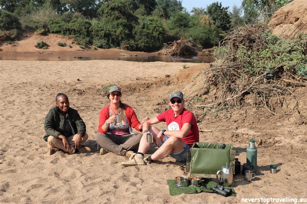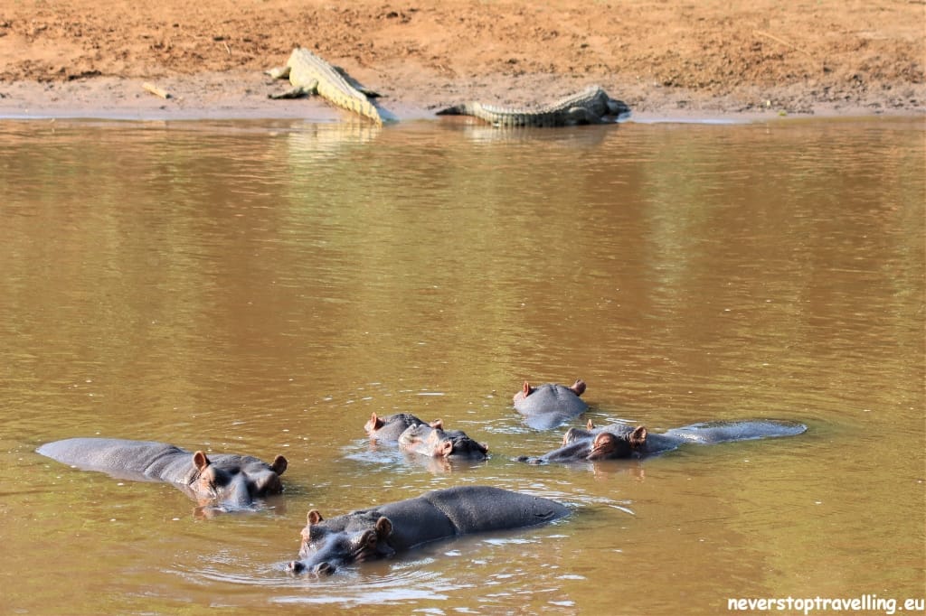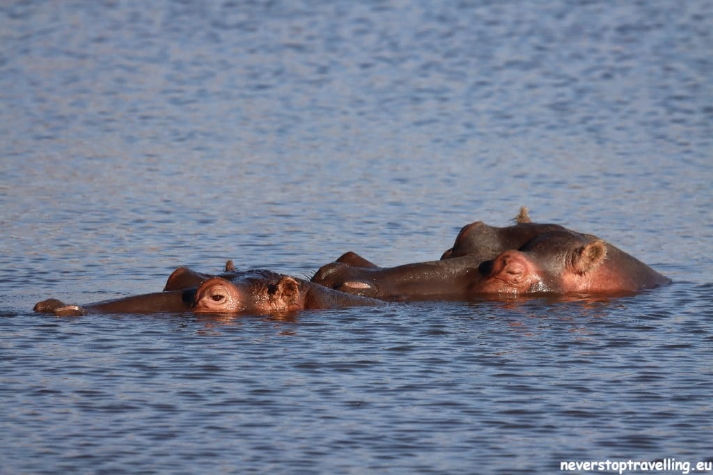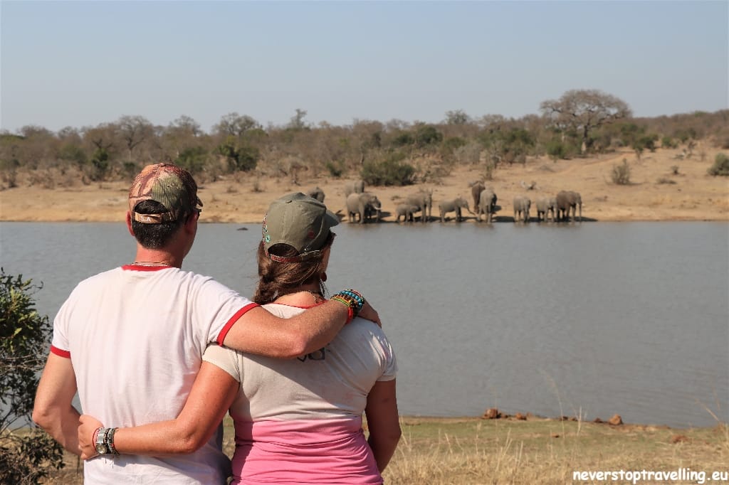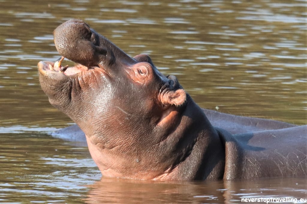 De koffie, die we bij Crooks Corner Viewpoint drinken, doen we midden tussen de Nijlpaarden, Krokodillen en Olifanten. Zelden zo’n gave koffiestop gemaakt!