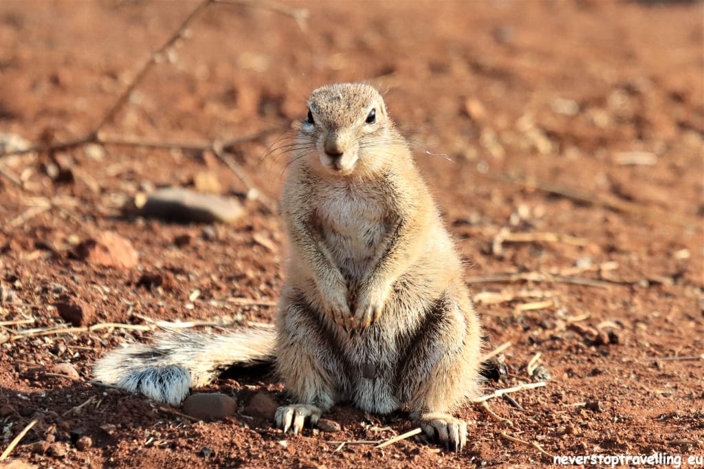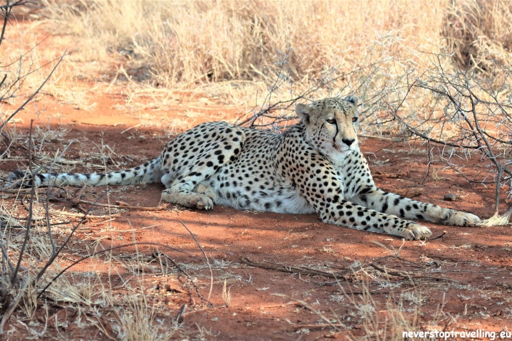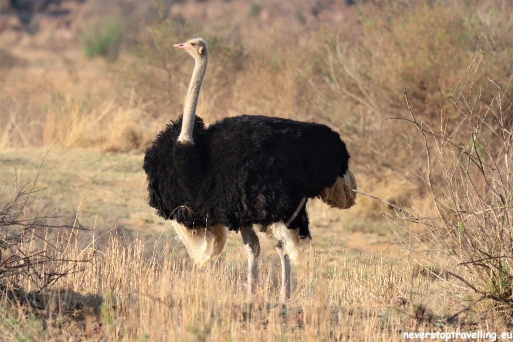 Droevig verhaal is wel dat de enige struisvogel in het Reserve, die we wel zagen, een mannetje is die al weken rond rent op zoek naar een “vrouwtje”. Met zijn vorige “vrouw” had hij enkele kleine struisvogels ter aarde gebracht echter deze werden allen opgegeten door de jakhalzen, aansluitend werd zijn partner gedood door een Cheeta. Hij loopt dus alleen rond in het park!
