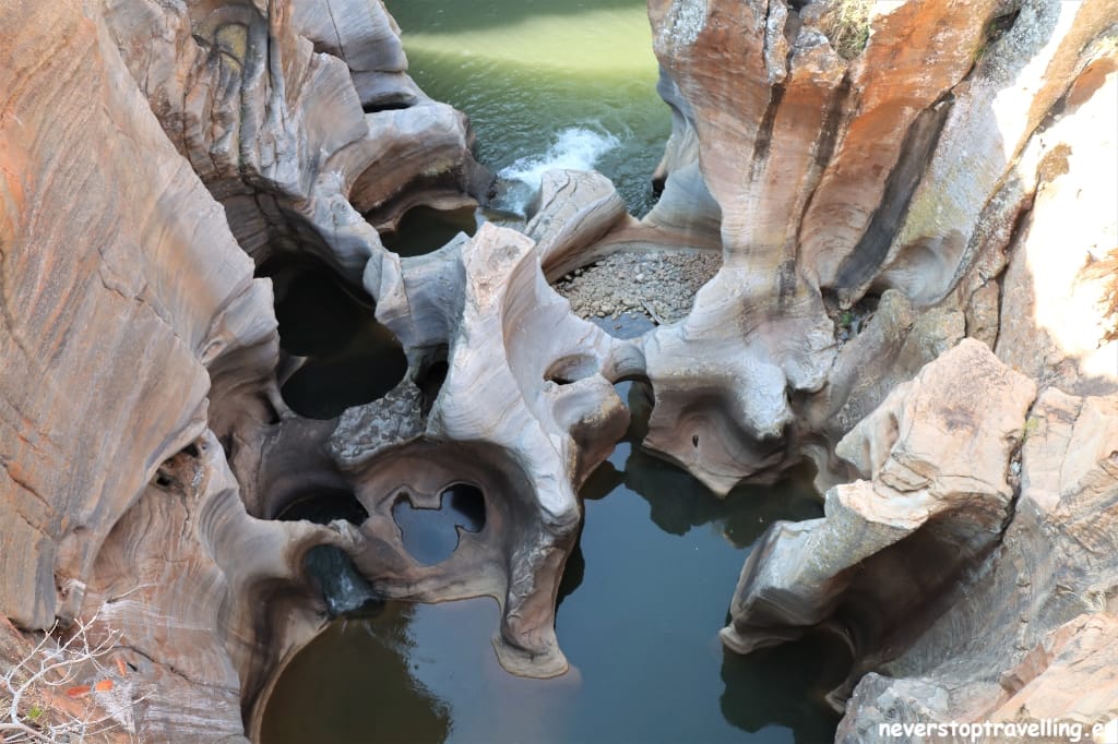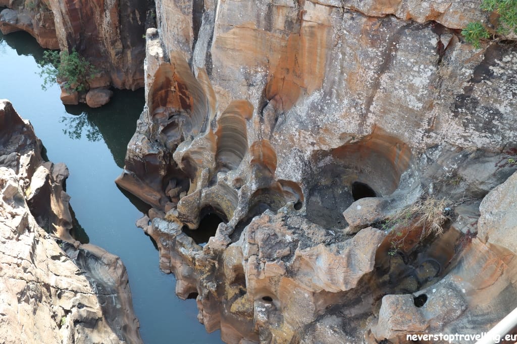 The potholes (Bourke’s Luck Potholes) zijnĀ bizarre, cilindervormige rots openingen die miljoenen jarenlang, door wervelingen van Blyde- en Treur- rivieren uit de rotsen geslepen zijn. Tom Bourke had rond 1870 bijzonder veel geluk: hij ontdekte hier goud en al snel was er een naam voor dit vreemde rivierlandschap gevonden (Engels luck= geluk, Potholes= wervelgaten)., zijn uitgeslepen rotsformaties die door de Blyde River zijn ontstaan. De natuur is er prachtig en je kunt potholes goed bewonderen. De Bourkes Luck Potholes zijn een must see. Je kunt er ook prachtige wandelingen maken.