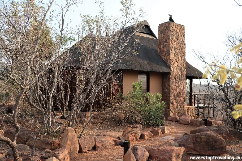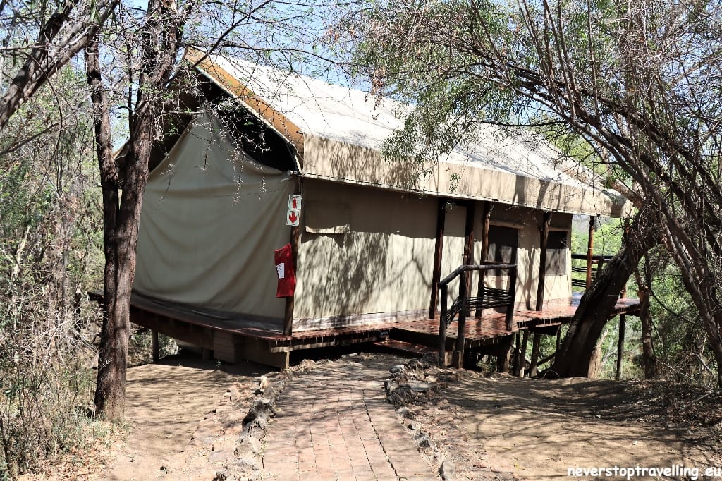 Bij de ingang van het Park moeten we eerst registreren en dan kunnen we het park in. We overnachten, de komende drie nachten, in āaha Thakadu River Campā, gelegen aan de Marico River. Het hoofdgebouw bestaat uit een open lounge, eetruimte en receptie. Daarnaast is er een zwembad en een bar. De Lodge is volledig uit hout opgetrokken waardoor het mooi wegvalt in de natuurlijke omgeving. Het kamp beschikt over 12 tenten, elk met een eigen uitzicht over de rivier. In de tent heb je een eigen badkamer en een privĆ© dek. Het is een fantastische plek om op safari te gaan.
