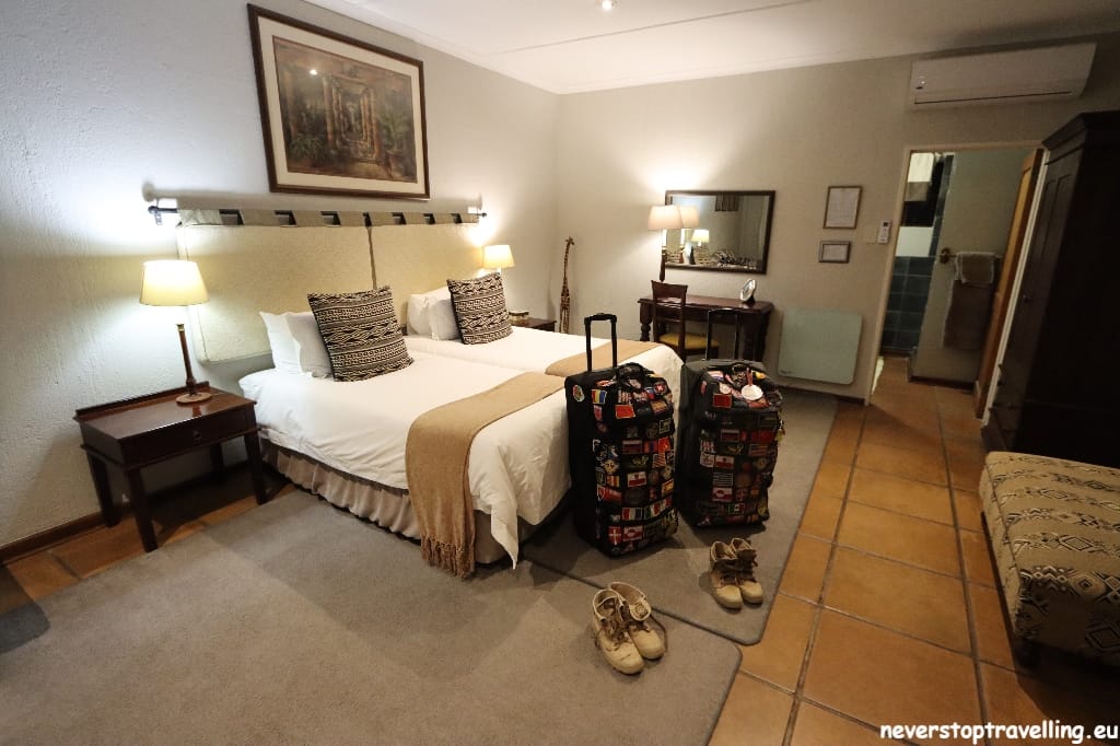 Reizen in Afrika is mogelijk maar de meeste reizigers verkiezen het continent helaas nog niet, op onze vlucht van Amsterdam naar Johannesburg met KLM Boeing 777 zijn 98 van de 400 stoelen bezet. Keuze genoeg dus! Vanwege de late aankomst brengen we onze eerste nacht door in City Lodge Hotel OR Tambo Airport. Prima Airport Hotel, goed ontbijt en wil je nog een plonsje doen? Het buitenzwembad is open.