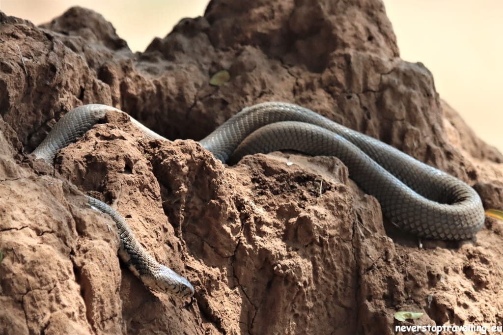 Zo hadden we een slang gespot nabij onze tent wat later een uit Mozambique afkomstige Cobra bleek te zijn, zeer giftig en kan zijn gif ruim 1,5 meter ver spuiten. O ja, volgende keer dus toch maar wat opletten! Na de middag/avond gamedrive nog even naar onze Safaritent voor het diner, staat er een Olifant langs onze tent, die net zo hard schrikt van ons als wij van hem, even wat hulp inschakelen om te kunnen passeren. Yep, we zijn in Afrika!