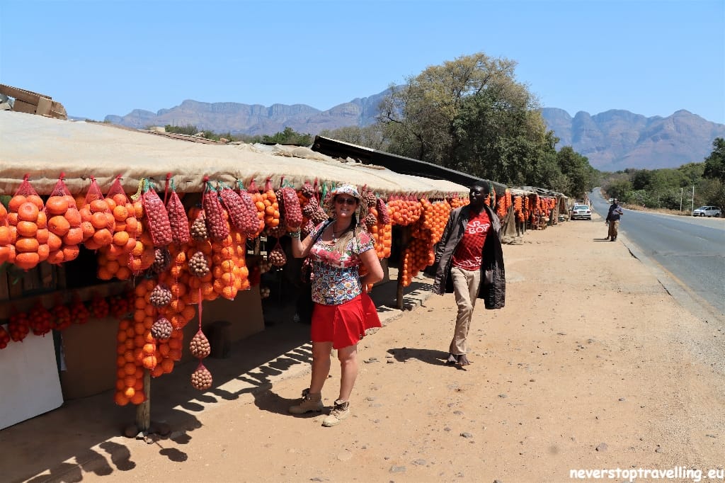 De R525 loods ons door kleine Afrikaanse dorpjes waar je het typische Afrikaanse leven kunt zien. Erg bijzonder en mooi! Onderweg treffen we nog een lokaal voetbal toernooi aan waar het kennelijk erg bijzonder ons dat er twee Nederlanders stoppen. Iedereen wil op de foto voor ons en de dames, die met de sinaasappels (1 Rand per stuk) rond komen, vinden het geweldig dat ze aan ons ook enkele sinaasappels mogen verkopen. Een erg leuke beleving om aan de zijlijn van deze zandvlakte (een grasmat voor voetbal is hier niet aan de orde) even mee te genieten.