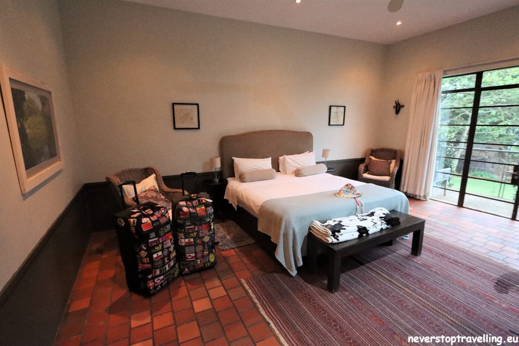 We overnachten in het Kings Walden Garden Manor, gelegen in het midden van 3 hectare Engelse tuinen en met een prachtig uitzicht op de bergen en het Lowveld. Het pension biedt luxe kamers die zijn ontworpen met romantiek en ontspanning in het achterhoofd. De stijl wordt gekenmerkt door heldere, elegante lijnen met moderne ondertoon – warme aardetinten, fluweel en leer, beige en zwart. Elke kamer heeft een open haard en een eigen veranda met directe toegang tot de grote tuin.