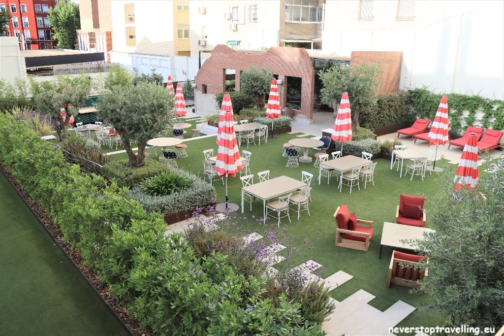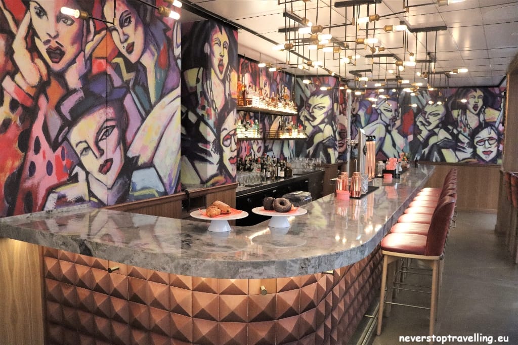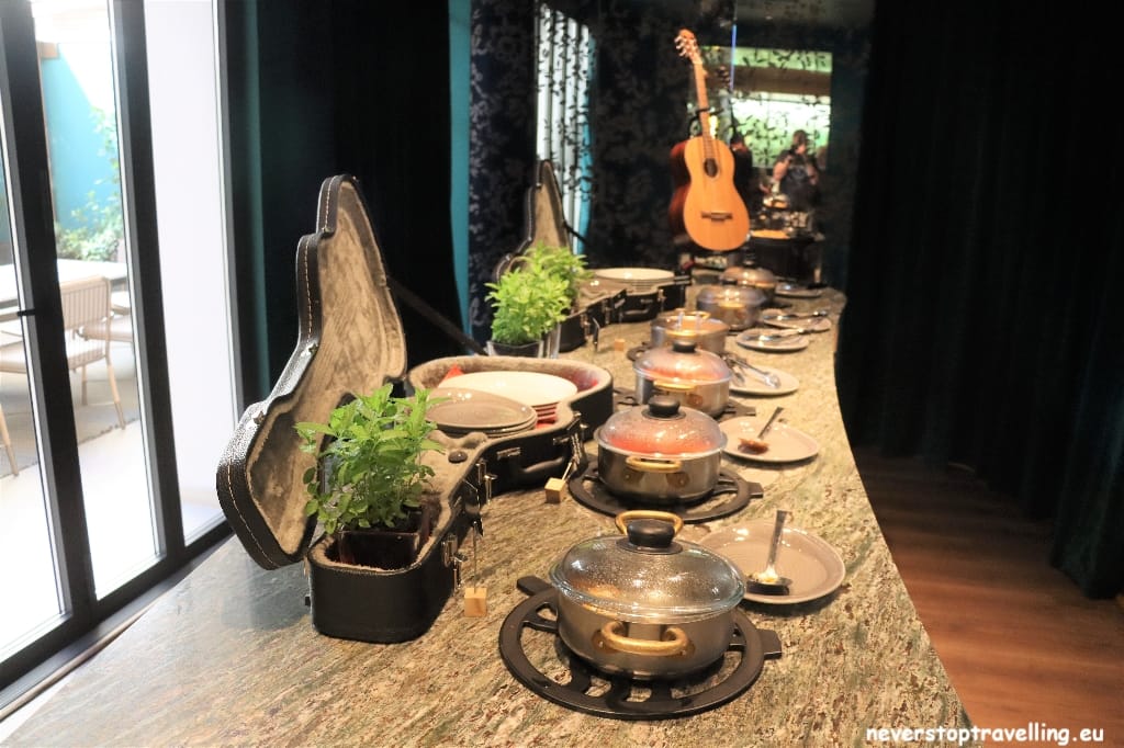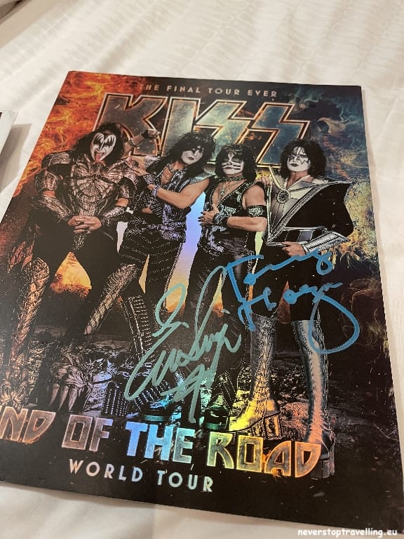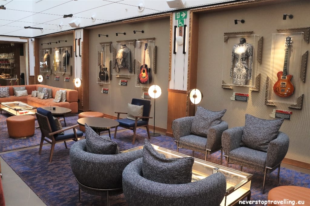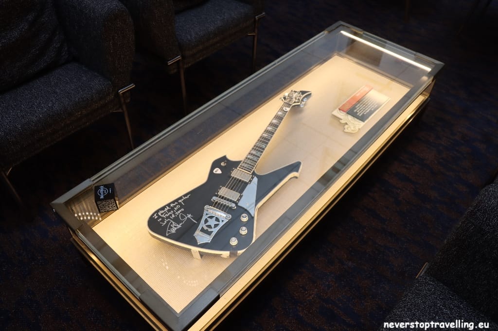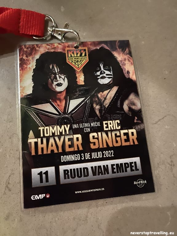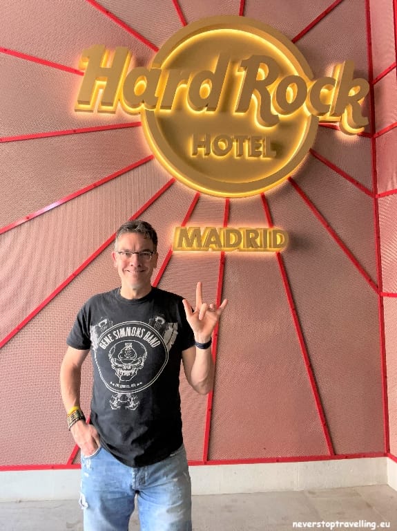 Voor deze Madrid trip overnacht ik in het Hard Rock Hotel Madrid, als fanatiek Hard Rock Café bezoeker (inmiddels meer dan 40 locaties bezocht) sliep ik nog nooit in een Hard Rock Hotel. Nu zijn die er ook niet zoveel over de wereld maar ze lijken in opkomst te zijn. Het prijspeil is meer dan acceptabel en je slaapt in een bijzondere omgeving. Natuurlijk is alles in stijl aangekleed, alle gangen in het hotel bevatten items van artiesten. De entree-hal is erg bijzonder, waar je overigens ook leuk kunt zitten voor een drankje. Een goede keuze voor deze Madrid-trip en al helemaal omdat de KISS Army Spain, hier ook de Meet and Greet met Tommy en Eric (gitarist en drummer van KISS) organiseren.
